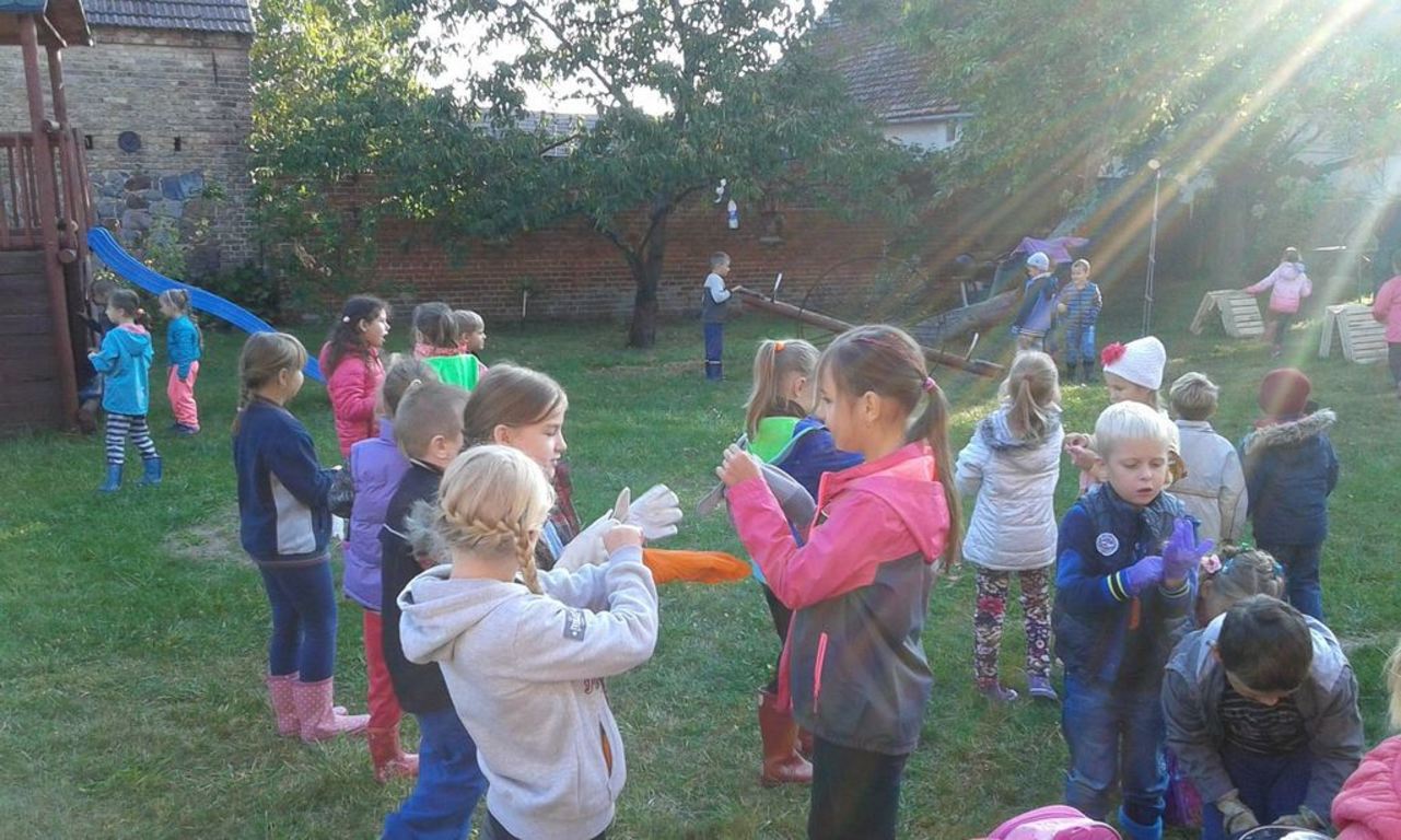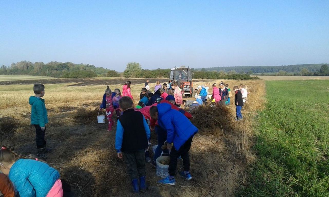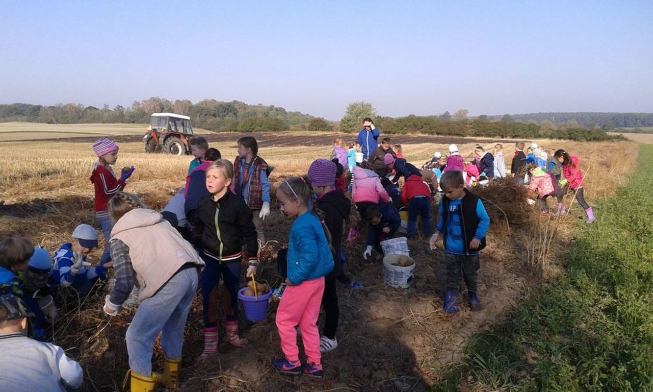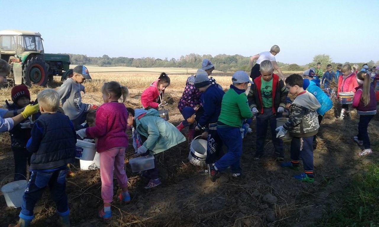 27 września 2016 roku dzieci z klasy II b i II c Szkoły Podstawowej wraz z wychowawczyniami zostały zaproszone na wykopki do Radachowa. Na polu czekali już rodzice i gospodarz ziemniaczanego pola pan Pułjan. Pogoda była piękna, toteż wszyscy dziarsko wzięli się do pracy. Dzieci zbierały ziemniaki do wiaderek, a panie wysypywały ich zawartość na przyczepę. Ziemniaków było całe mnóstwo, ale dzieci wybierały najciekawsze okazy np.: w kształcie chmurki, serca, misia lub gruszki. Potem była przerwa na smaczne kiełbaski, no i oczywiście pieczone ziemniaki. Podczas degustacji pani opowiedziała o budowie ziemniaka oraz sposobie ich przechowywania w czasie zimy. Gospodarz też się włączył i opowiedział, jak to król Jan II Sobieski sprowadził ziemniaki do Polski. Po posiłku i w dobrych humorach dzieci przejechały na wozie z zaprzęgiem konnym na pole dyniowe. Jaka radość była, gdy wszyscy zobaczyli ogromne dynie. Okazało się wówczas, że dzieci mogły je kulać po polu. W mig wszyscy zabrali się do pracy i szybko powstała wielka pomarańczowa piramida dyniowa, na tle której zrobiono pamiątkowe zdjęcie. Była też mowa o przygotowaniu potraw z dyni oraz jak bardzo są zdrowe i pożywne. W drodze powrotnej dzieci zaprosił do swojego gospodarstwa dziadek Olka, który pokazał swoje gospodarstwo. Było tam mnóstwo ciekawych okazów kur, kaczek i kotków. Jednak najbardziej podobały się dzieciom białe gołębie. Oczywiście wszystkie zostały wypłoszone:) Była też nauka łuskania kukurydzy ciekawą maszynką, do której ustawiła się duża kolejka.
