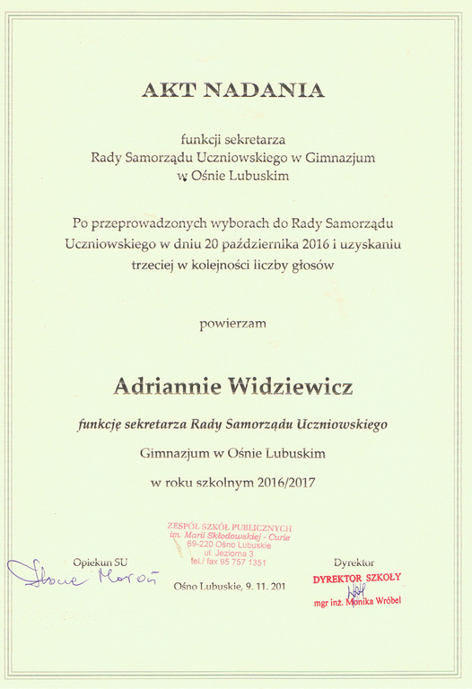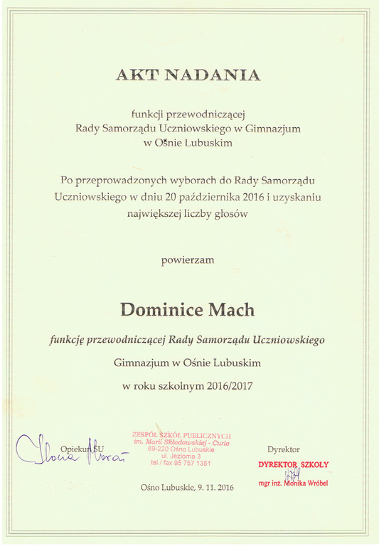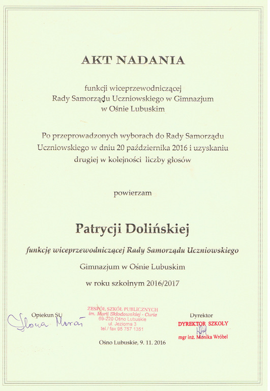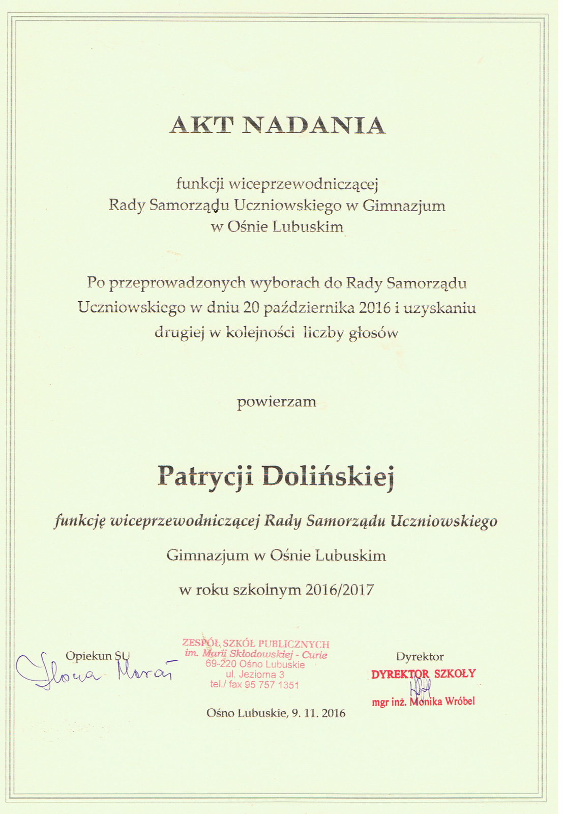 W środę 9 listopada 2016 r., w gimnazjum w Ośnie Lubuskim, odbyło się zaprzysiężenie nowo wybranych członków Rady Samorządu Uczniowskiego na rok szkolny 2016/2017.