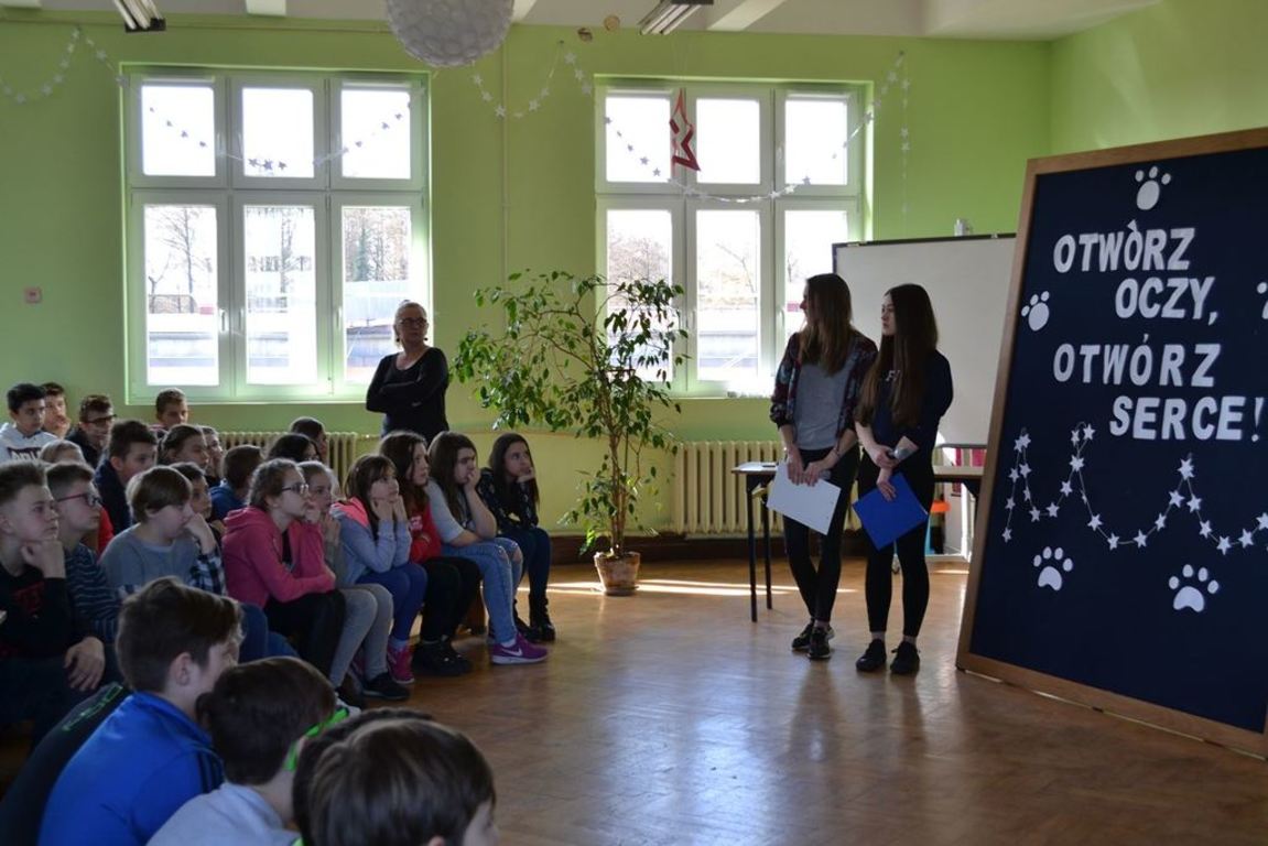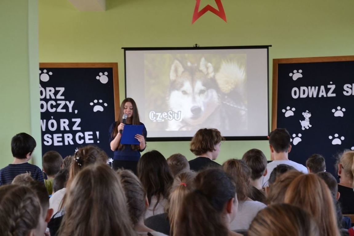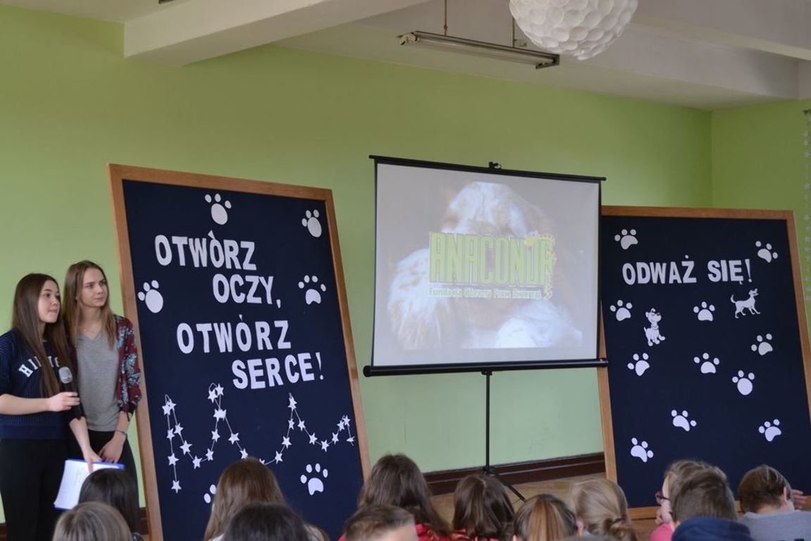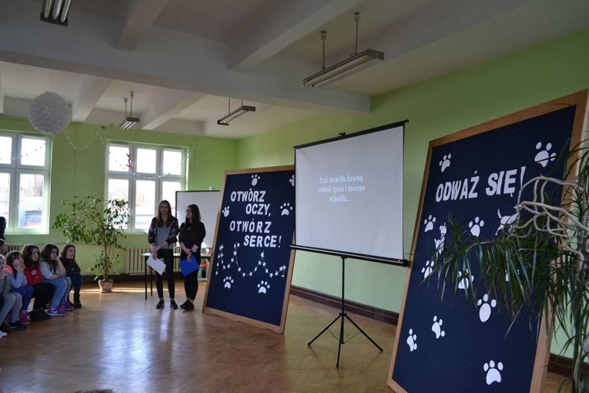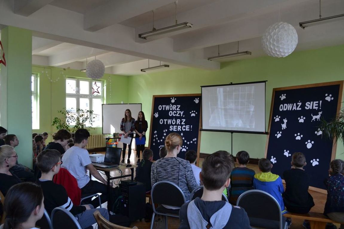 Julia Bem i Hanna Biernacka, uczennice kl. II a gimnazjum, zainicjowały w naszej szkole akcję pomocy psom ze schroniska w Gorzowie Wielkopolskim. Prezentacja jej założeń odbyła się 8.03.2017 r. dla gimnazjum, a 15.03. tego roku dla kl. IV-VI szkoły podstawowej. Głównym celem wystąpienia było zwrócenie uwagi słuchaczy na bezduszność ludzką i związane z tym problemy zwierząt trafiających do schronisk.