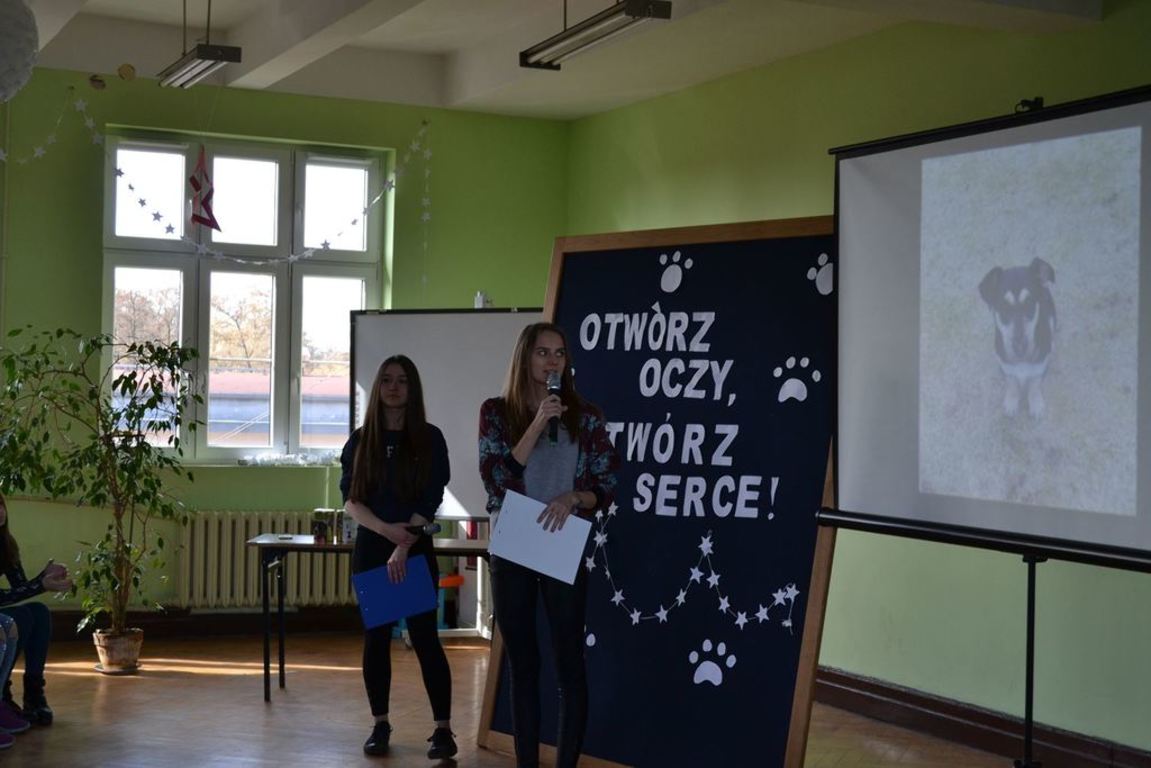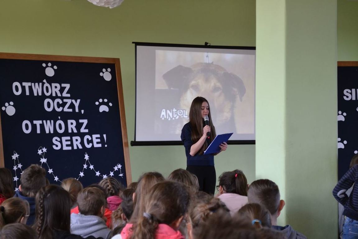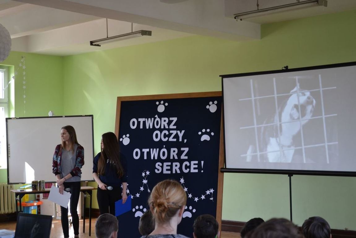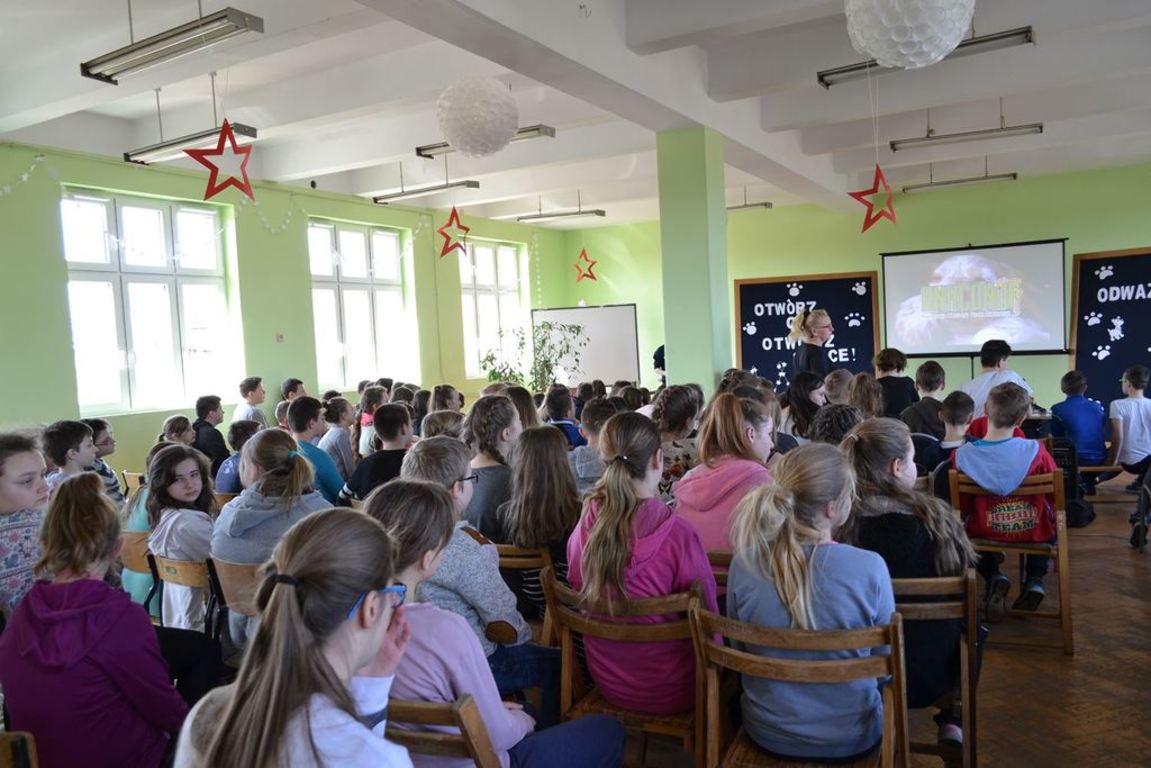 Julia Bem i Hanna Biernacka, uczennice kl. II a gimnazjum, zainicjowały w naszej szkole akcję pomocy psom ze schroniska w Gorzowie Wielkopolskim. Prezentacja jej założeń odbyła się 8.03.2017 r. dla gimnazjum, a 15.03. tego roku dla kl. IV-VI szkoły podstawowej. Głównym celem wystąpienia było zwrócenie uwagi słuchaczy na bezduszność ludzką i związane z tym problemy zwierząt trafiających do schronisk.