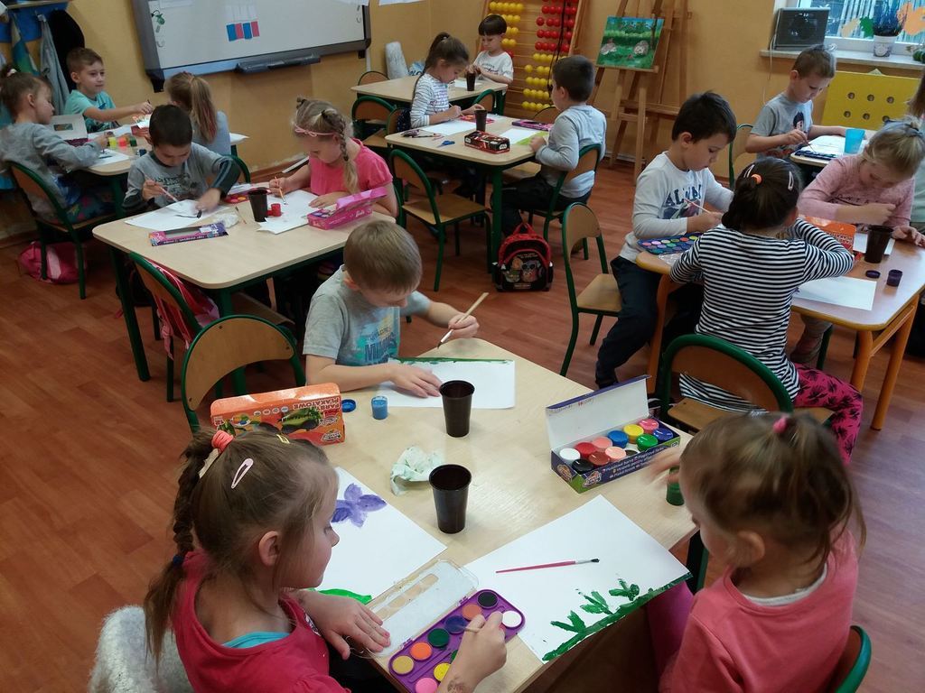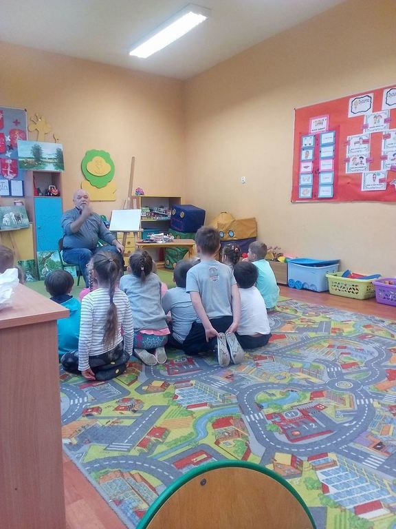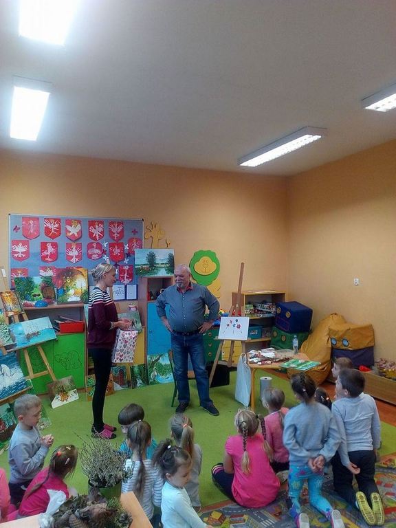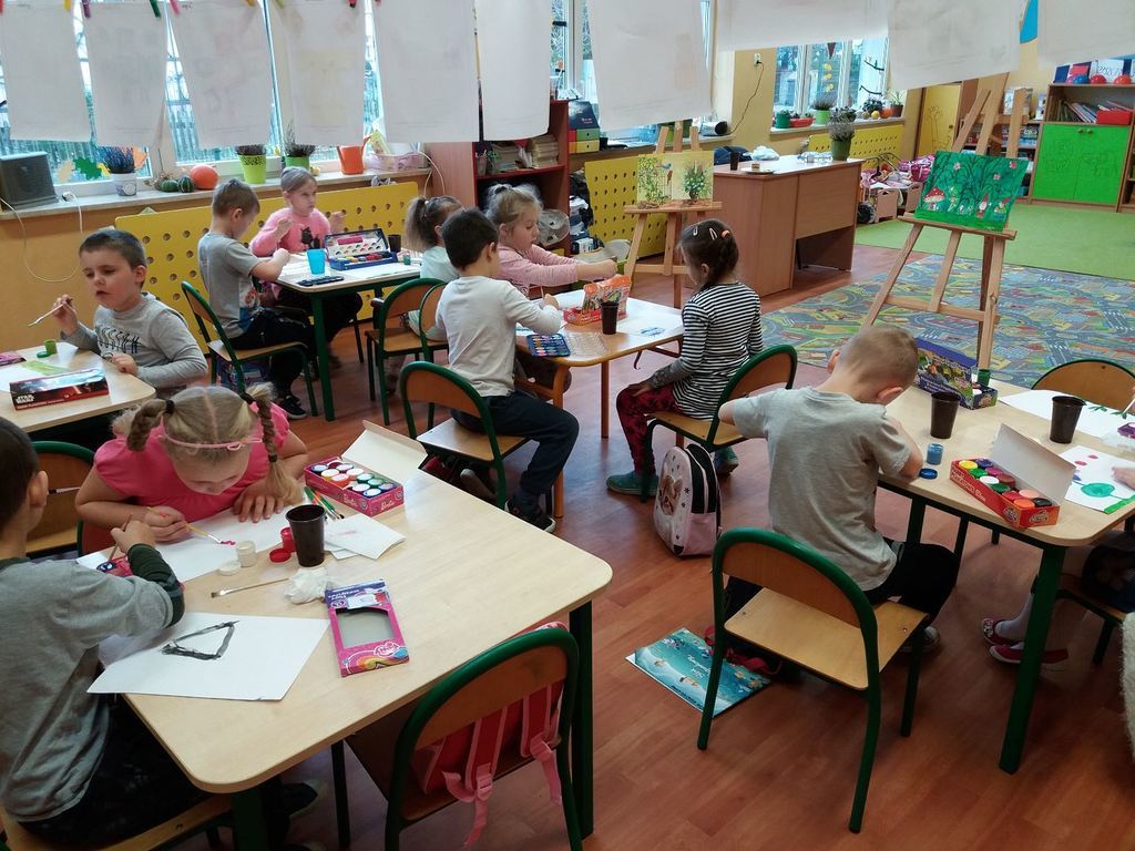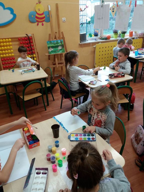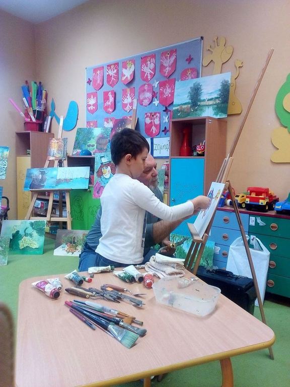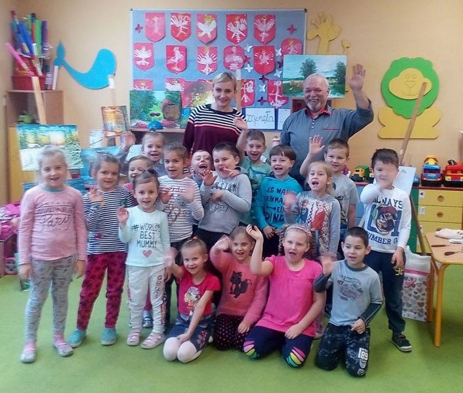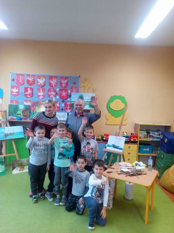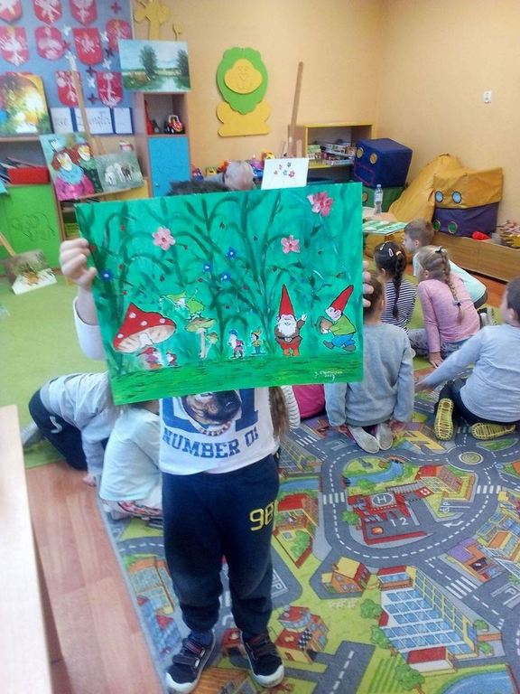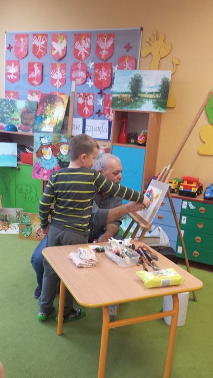W grupie Biedronek i Krasnali w listopadzie kontynuacją cyklu spotkań związanych z poznawaniem różnych zawodów była także wizyta Pana Jana Stopińskiego. Dzieci przeżyły nie lada zaskoczenie, gdy jedna z sal zamieniła się w mini warsztat malarski. Dzięki pomocy rodziców kąciki zostały ozdobione przepięknymi obrazami autorstwa Pana Jana. Dzieci były pod wielkim wrażeniem namalowanych obrazów! Nasz gość zaprezentował różnorodne narzędzia malarskie, dzięki którym razem z dziećmi wykonał wspólne obrazy. Starszaki bardzo uważnie słuchały wskazówek malarza. Każdy miał okazję wziąć do ręki nie pędzel, a szpachelkę malarską i domalować kolorowy element na obrazie. W ten sposób powstała tęcze, kwiatki, słoneczka, motylki. Dzieci były bardzo zadowolone po ukończeniu pracy. Miłym zaskoczeniem był także prezent od Pana Jana. Grupy otrzymały po kilka obrazów. Najwięcej radości wywołał obraz z krasnalami przekazany grupie Krasnali, natomiast biedroneczki w kropeczki zostały namalowane dla grupy Biedronek. Dzisiaj wszystkie obrazy zdobią nasze sale na pamiątkę miłego spotkania. Pan Jan poprzez przeprowadzenie ciekawych zajęć rozbudził w dzieciach zainteresowanie sztuką, dlatego dzień nie mógł się obejść bez malowania farbami! Dzieci puściły wodze swojej fantazji i stworzyły nietuzinkowe dzieła, którym nadały tytuły.
