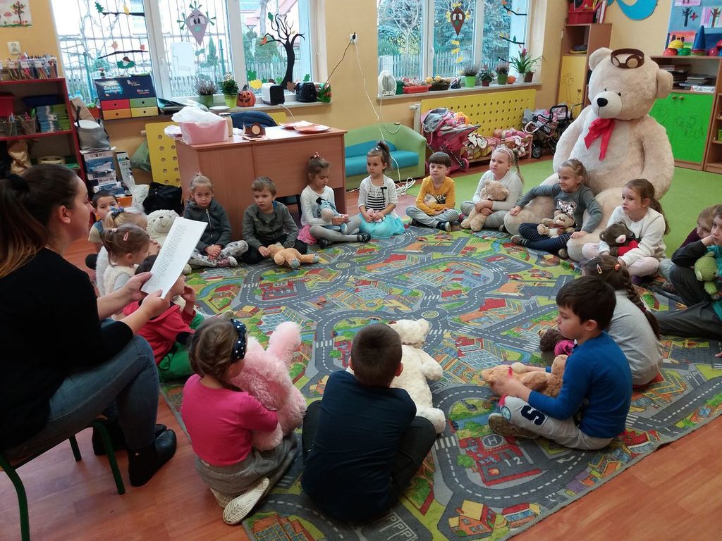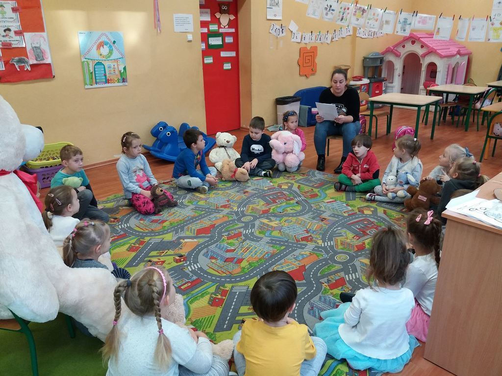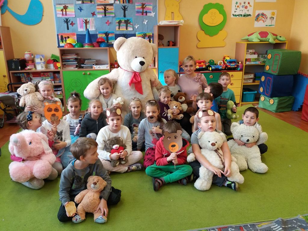 Niewiele rzeczy w dzisiejszym świecie wzrusza, ma w sobie tyle łagodności i dobra, ile zawiera się prostej zabawce, jaką jest pluszowy miś. Dlatego też, żeby nie zapomnieć, że pluszowy niedźwiadek to wspaniała zabawka, dzieci z oddziału przedszkolnego Krasnali i Biedronek wraz z Paniami w wyjątkowo uroczysty sposób świętowały „Światowy Dzień Pluszowego Misia”. Tego dnia każde dziecko przyniosło do przedszkola swojego ulubionego przyjaciela–Misia, który towarzyszył im przez całe zajęcia. Nasze pluszowe niedźwiadki bardzo się od siebie różniły, nie tylko wyglądem ale również wielkością i kolorami. Mimo to każdy z nich był wyjątkowy i wzbudzał w dzieciach ogromne emocje. Przedszkolaki na początku zajęć, z dumą przedstawiały swoich pluszowych przyjaciół. Po prezentacji przyszła pora na słuchanie bajek o bohaterach dnia czytanych przez rodziców. Po lekturze dzieci bawiły się przy misiowych przebojach, a także uczestniczyły w wielu zabawach ruchowych. Panie przedstawiły dzieciom obrazki najstarszych misiów, które wyglądem były zbliżone do prawdziwych niedźwiedzi. Następnie wspólnie oglądaliśmy i jednocześnie słuchaliśmy historyjki obrazkowej, o tym kiedy powstał pierwszy miś i jaka była tego przyczyna. Po wysłuchaniu opowieści dzieci udały się na słodką przekąskę, czyli „to co Misie lubią najbardziej”- tosty z miodem. Ważnym punktem naszego świętowania była praca plastyczna, która okazała się dużym wyzwaniem. Zadaniem zerówkowiczów było wypełnienie włóczką konturu misia. Prace były piękne. W nagrodę za wysiłek dzieci otrzymały Misie Lubisie.