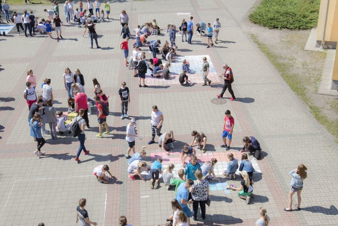 9 maja obchodziliśmy w naszej szkole Dzień Europy. Tradycyjnie, nauczyciele języków obcych przygotowali dla uczniów ciekawe zadanie. Każda klasa najpierw wylosowała nazwę kraju należącego do Unii Europejskiej i miała kilka dni na przygotowanie się. 9 maja na lekcjach wychowawczych spotkaliśmy się na dziedzińcu szkoły i rozpoczęliśmy wspólne malowanie flag wylosowanych państw. Uczniowie bardzo zaangażowali się w to zadanie i po zakończonej pracy wszyscy mogli podziwiać piękne flagi. Ponieważ w tym roku obchodzimy 100 rocznicę odzyskania przez Polskę niepodległości, nie mogło również zabraknąć flagi naszego państwa. Ale ta najważniejsza flaga nie była już malowana kredą, uczniowie naszej szkoły stanęli na dziedzińcu tworząc „żywą flagę”. Idea żywej flagi jest pozytywnym przykładem okazywania swoich postaw patriotycznych i przywiązania do barw narodowych.