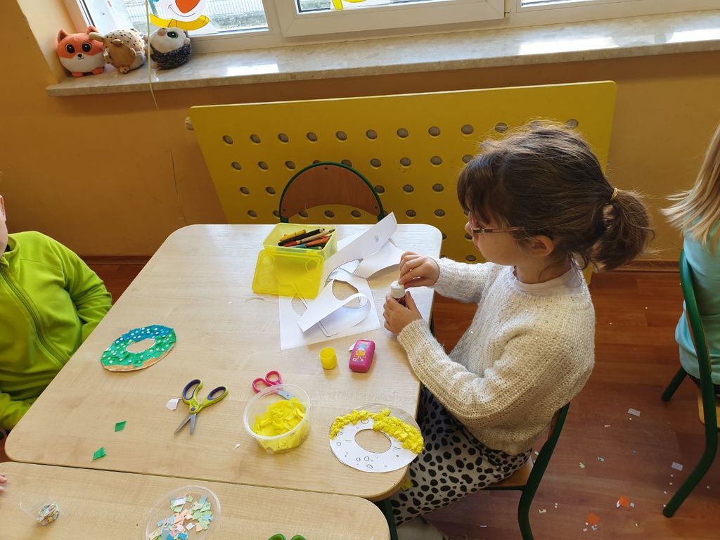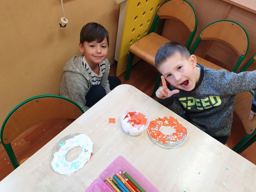 W tłusty czwartek nikt nie liczył kalorii, starsze przedszkolaki też nie! Słodkie pączki, faworki i oponki zagościły od rana w klasach zerowych. Dzieci ze smakiem zjadły okrąglutkiego pączka, bo przecież to było to, co przedszkolaki lubią najbardziej. Po słodkiej przekąsce każdy starszak miał okazję zrobić swojego pączka z posypką w ramach zabawy plastycznej. Dzieci przyklejały na pączki kawałki bibuły, kolorowały je, wycinały i ozdabiały kolorowym konfetti. Papierowe pączki wyglądały przepysznie!