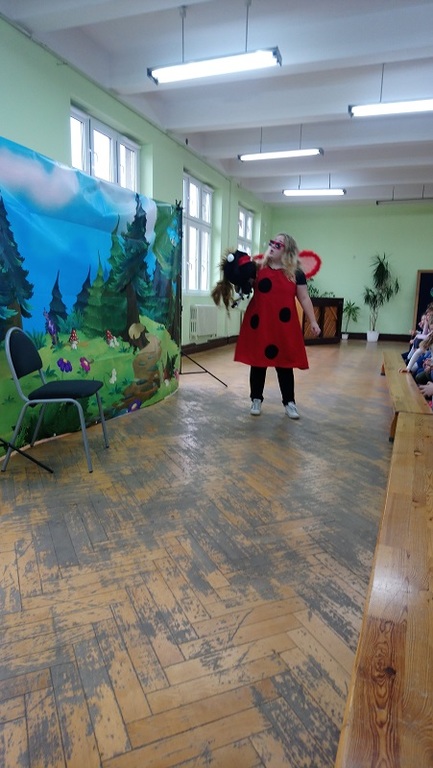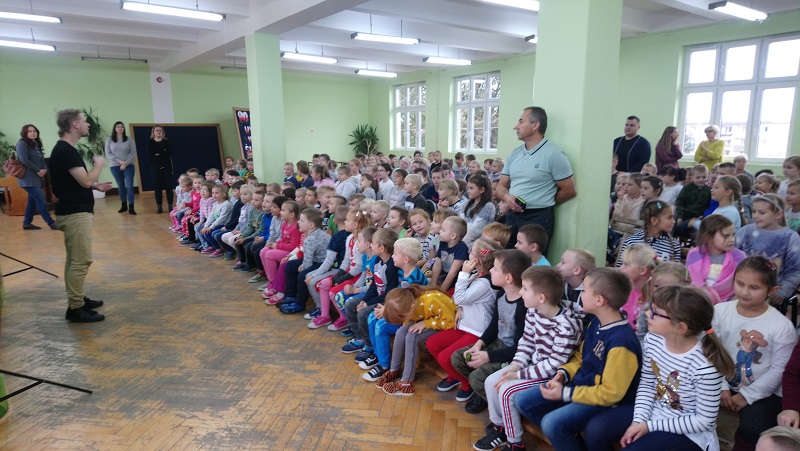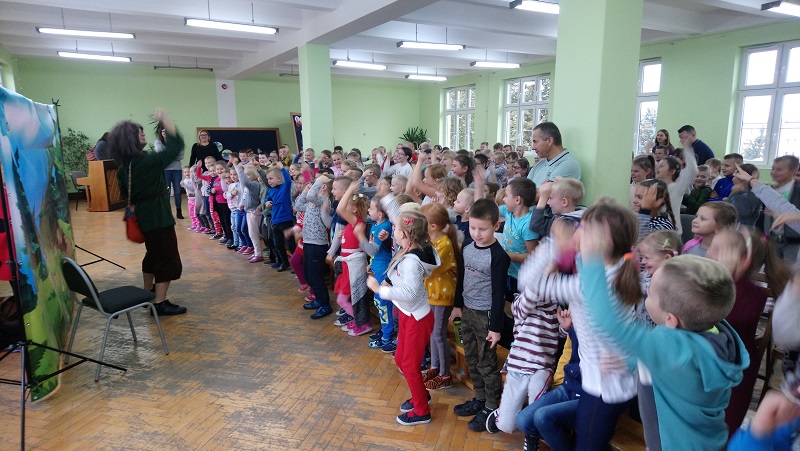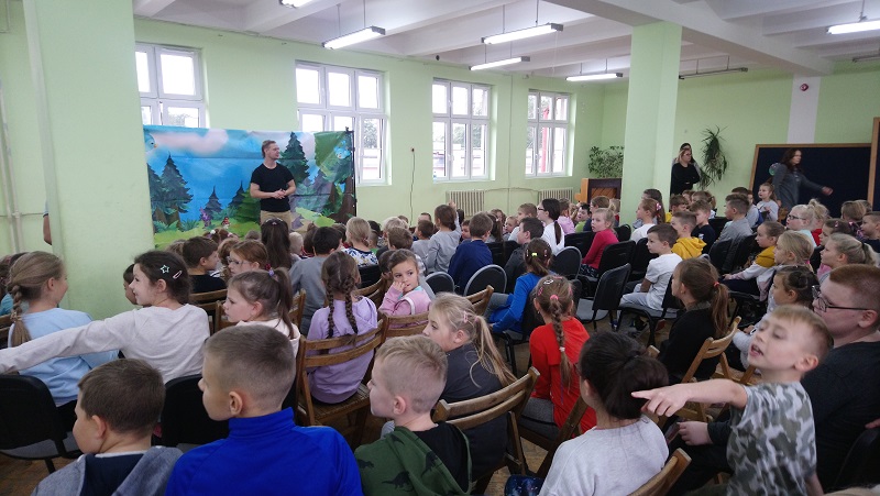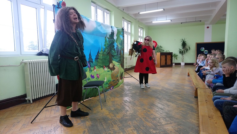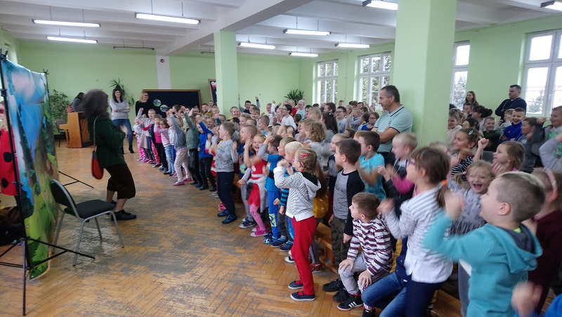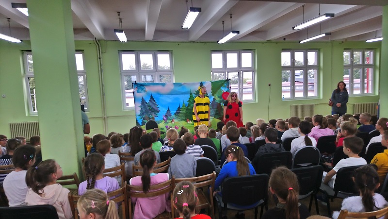 8 października Szkołę Podstawową w Ośnie Lubuskim odwiedzili aktorzy z GRUPY T z Torunia. Dzieci z klas 0 – III oraz IV – V miały okazję obejrzeć przedstawienie, pt. „Strach ma wielkie oczy”. Aktorzy wprowadzili uczniów w bajkowy świat owadów. Piegowata Biedronka wraz z przyjacielem Żądełkiem byli prześladowani przez Karalucha Ohydka. Sytuacja z pozoru niewinna, zaczęła się wymykać spod kontroli i wyrządzać coraz więcej szkód. Przyjaciele wyruszyli na poszukiwania magicznego eliksiru, aby rozwiązać problem. Okazało się, że nie był potrzebny eliksir, a wsparcie Pani Profesor, która podpowiedziała, jak radzić sobie z Karaluchem Ohydkiem J. Kluczem do rozwiązania sprawy było przerwanie milczenia i zwrócenie się o pomoc do dorosłych. Przedstawienie miało wiele walorów edukacyjnych. Było także okazją do świetnej zabawy i wspólnego tańca. Nasi uczniowie reagowali bardzo żywiołowo i spontanicznie na grę aktorów. Wartka akcja, oryginalne postacie, a także dawka humoru dały świetne i pełne humoru widowisko.