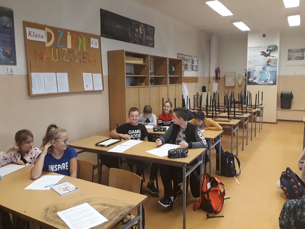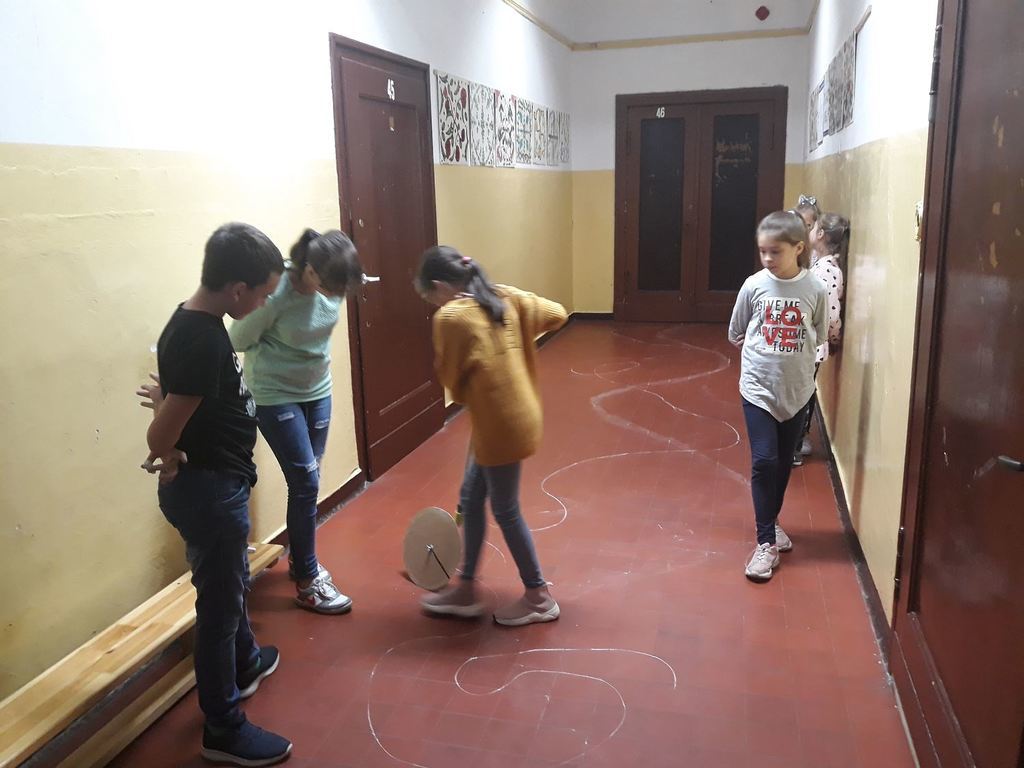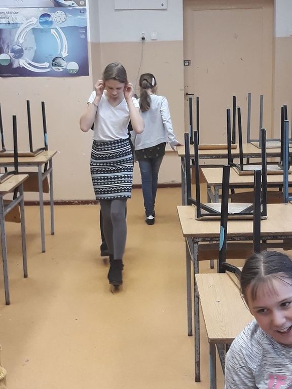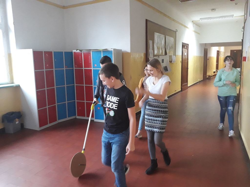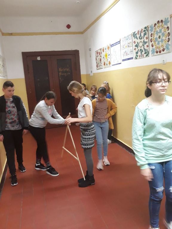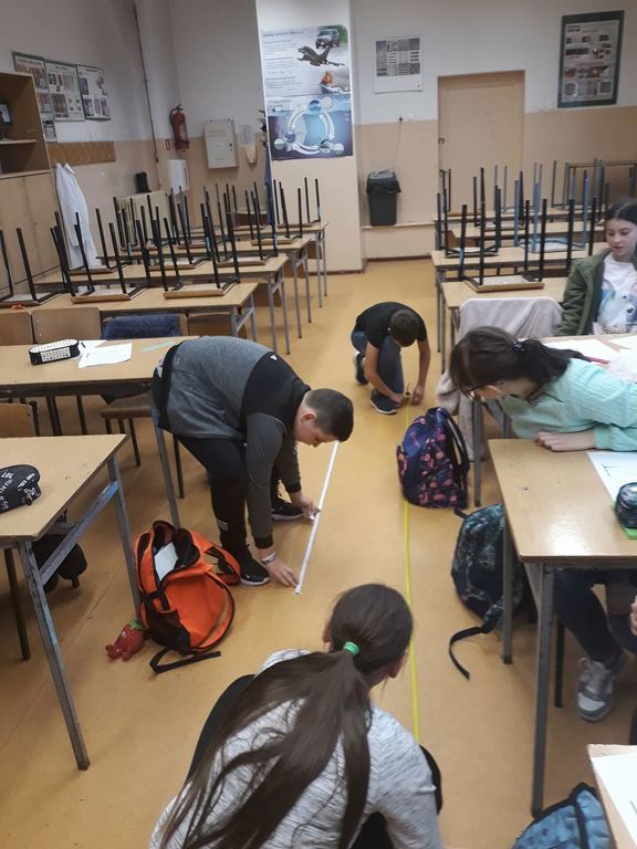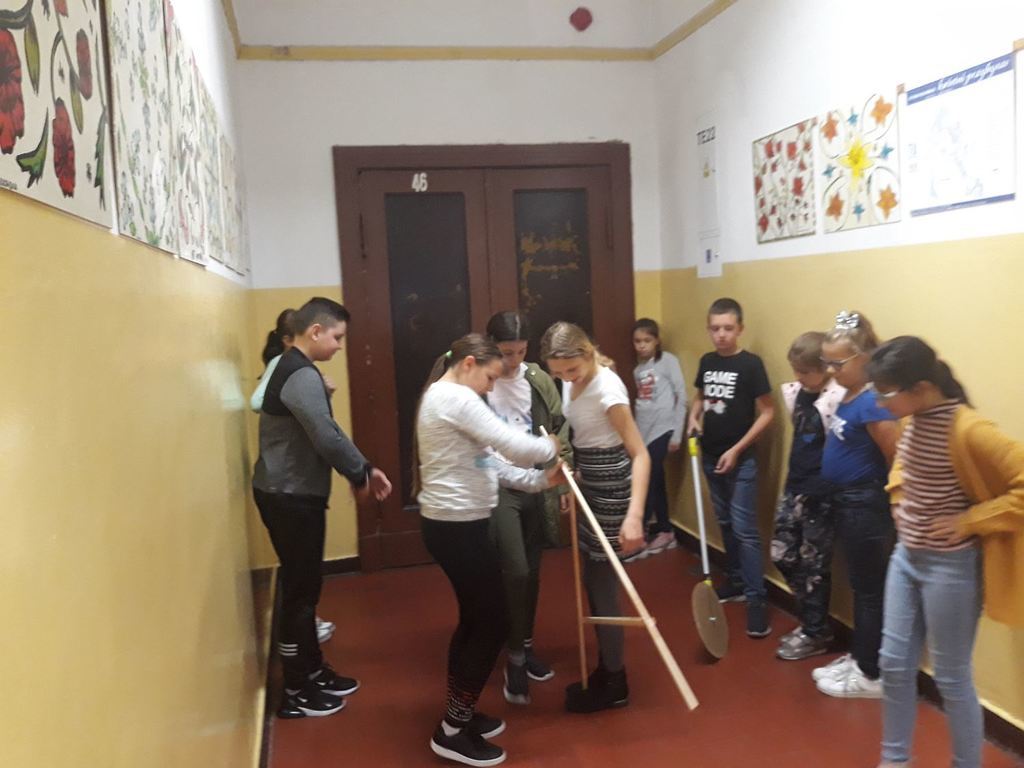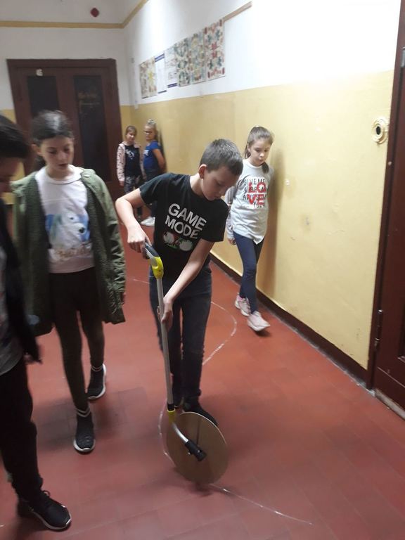 W dniu 16 października 2019r odbyły się pierwsze zajęcia w ramach programu grantowego mPotęgi „Zaprojektuj szkolny dziedziniec od nowa”. Niestety ze względu na kiepską pogodę zajęcia zamiast na dziedzińcu szkoły i na drodze nad jezioro musiały odbyć się na korytarzy szkolnym. W czasie praktycznych ćwiczeń uczniowie mieli możliwość zapoznania się z różnymi metodami pomiaru odległości. Mierzyliśmy więc długość klasy przy pomocy kroków, tzw. „stópek” znając numery noszonego obuwia oraz porównywaliśmy te pomiary z wynikami otrzymanymi przy użyciu taśmy i składanej „metrówki”. Uczniowie przekonali się jak duże były rozbieżności w przypadku dwóch pierwszych metod i dyskutowali nad ich przyczynami. Następnie mierzyliśmy długość korytarza używając do tego celu skonstruowanych przyrządów tzn. „kroczącego metra” i „kółka mierniczego”. To drugie narzędzie, dość proste w budowie jest przydatne w przypadku pomiaru długości np. linii falistych. Taka praktyczna forma zajęć bardzo uczestnikom odpowiadała. Mam nadzieję, że następnym razem pogoda będzie dla nas łaskawsza i będziemy mogli dokonywać pomiarów w terenie.