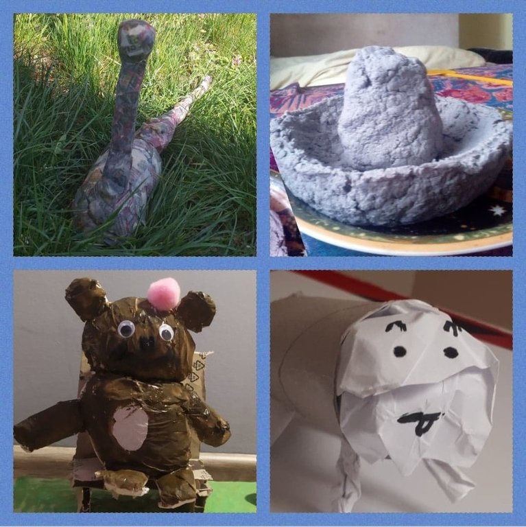 To nie tylko bogactwo formy wynikającej z różnych pomysłów na twórcze wykorzystanie papieru, ale też obfitość podejmowanych i spontanicznie realizowanych przez dzieci tematów. Spójrzcie sami…