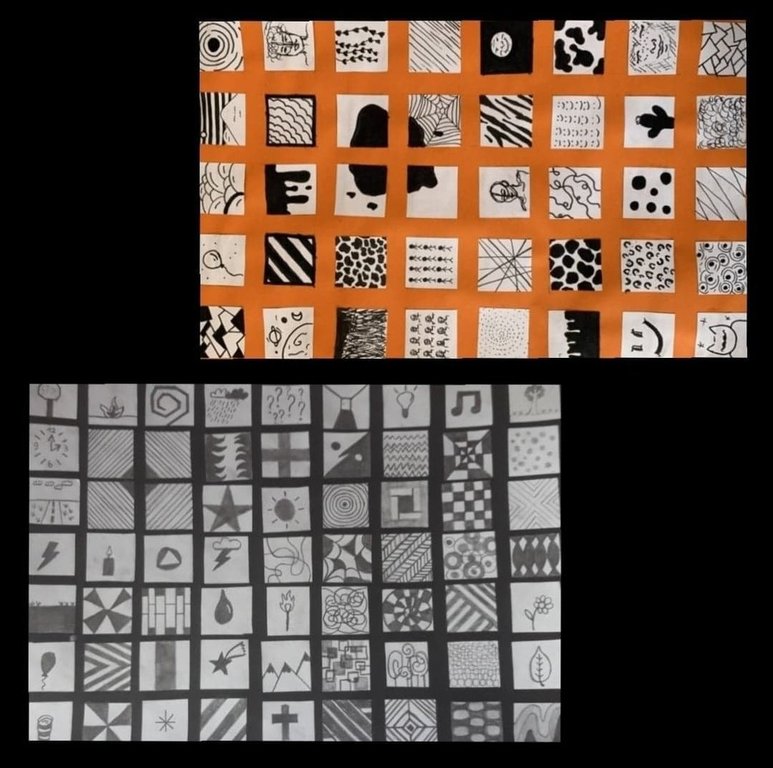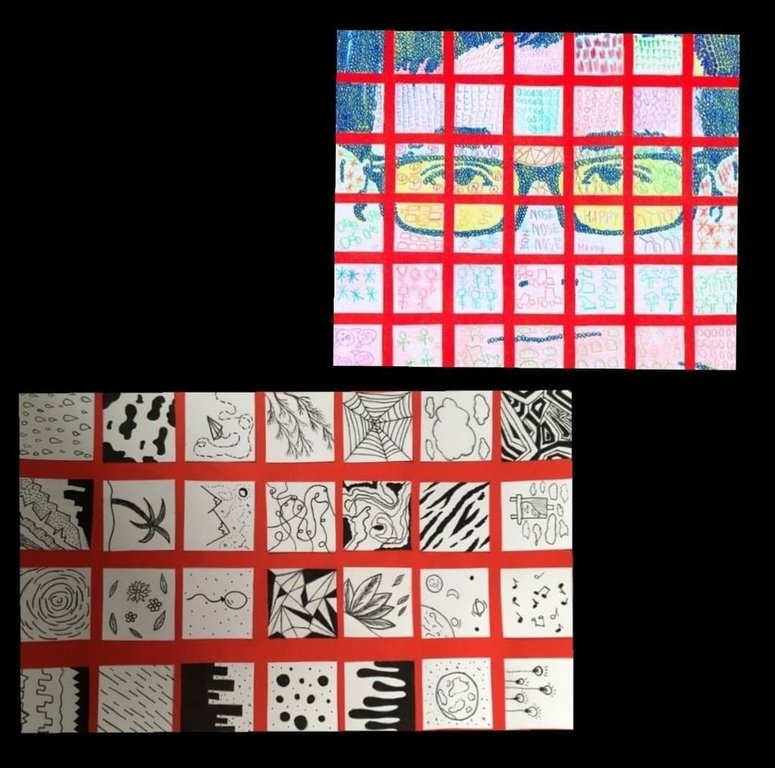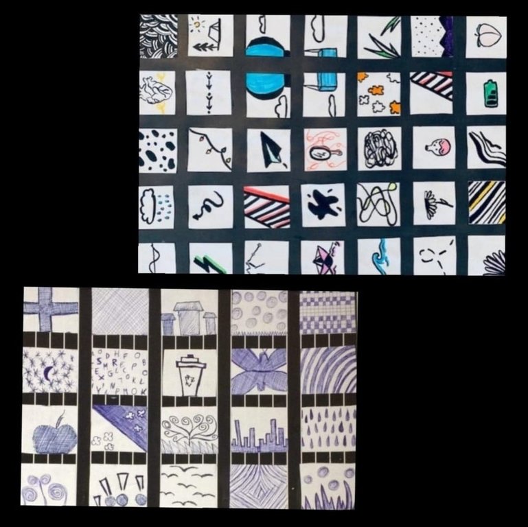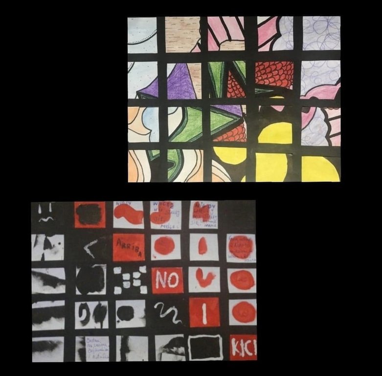 Jednym ze zdalnych zadań z plastyki w klasach siódmych było wykonanie kompozycji składającej się z malutkich obrazków. Każdy miał być odrębnym, maleńkim dziełem, ale w połączeniu z innymi miał tworzyć ciekawą całość. Młodzi twórcy poradzili sobie znakomicie.