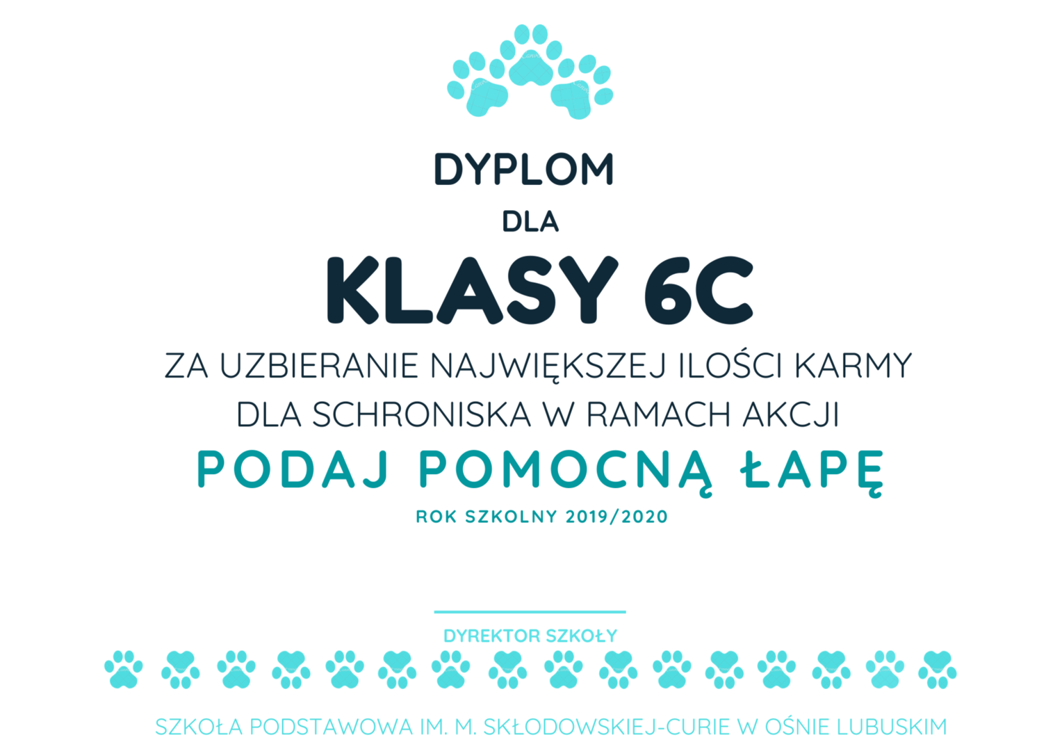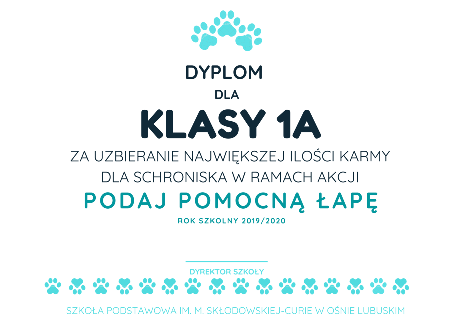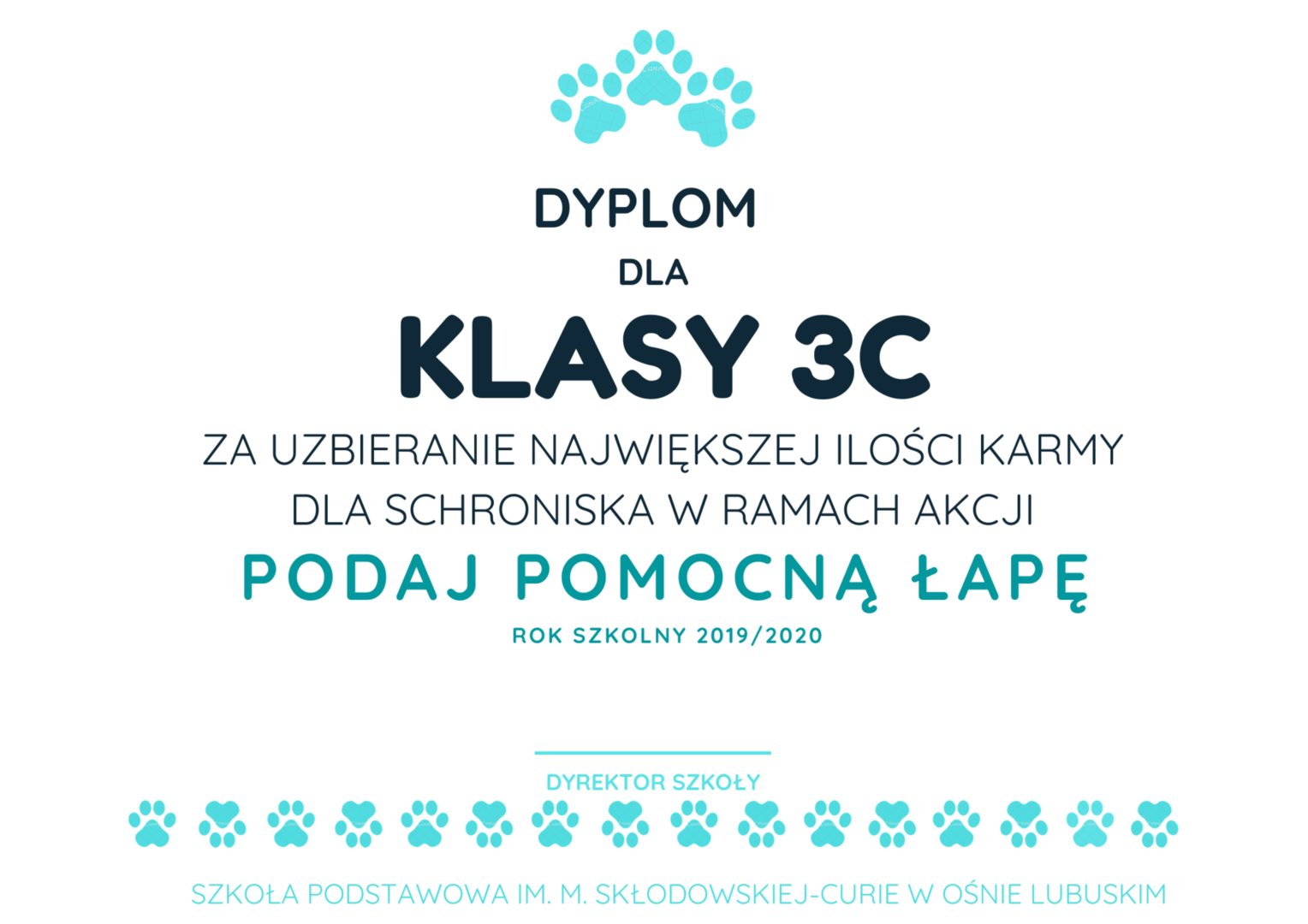 Bardzo dziękujemy wszystkim uczniom, rodzicom oraz nauczycielom, którzy z tak ogromnym zapałem zaangażowali się w naszą akcję! Postanowiliśmy wyróżnić pamiątkowymi dyplomami klasy, których uczniowie przynieśli najwięcej karmy😊