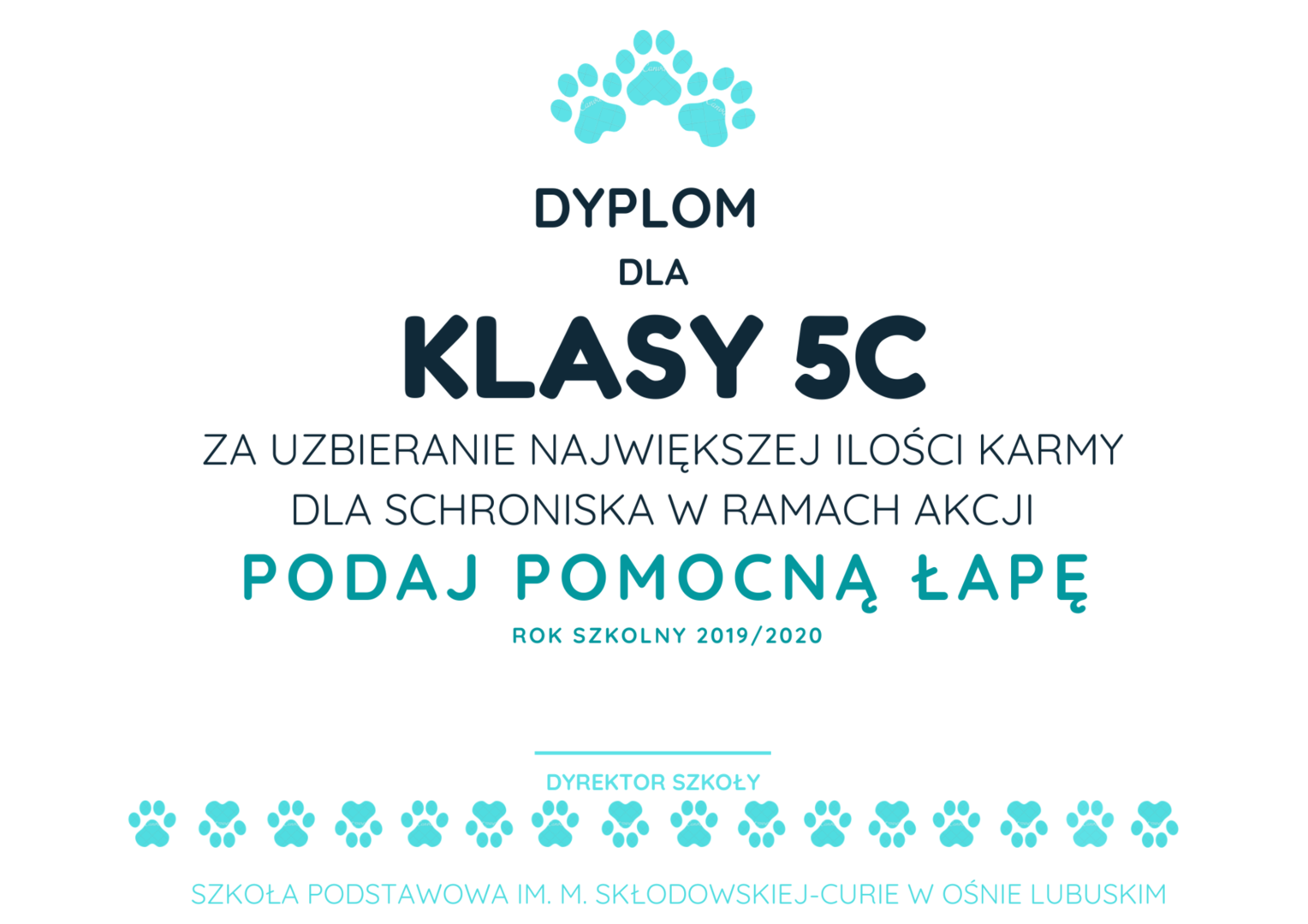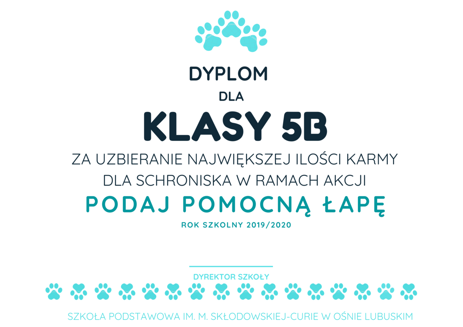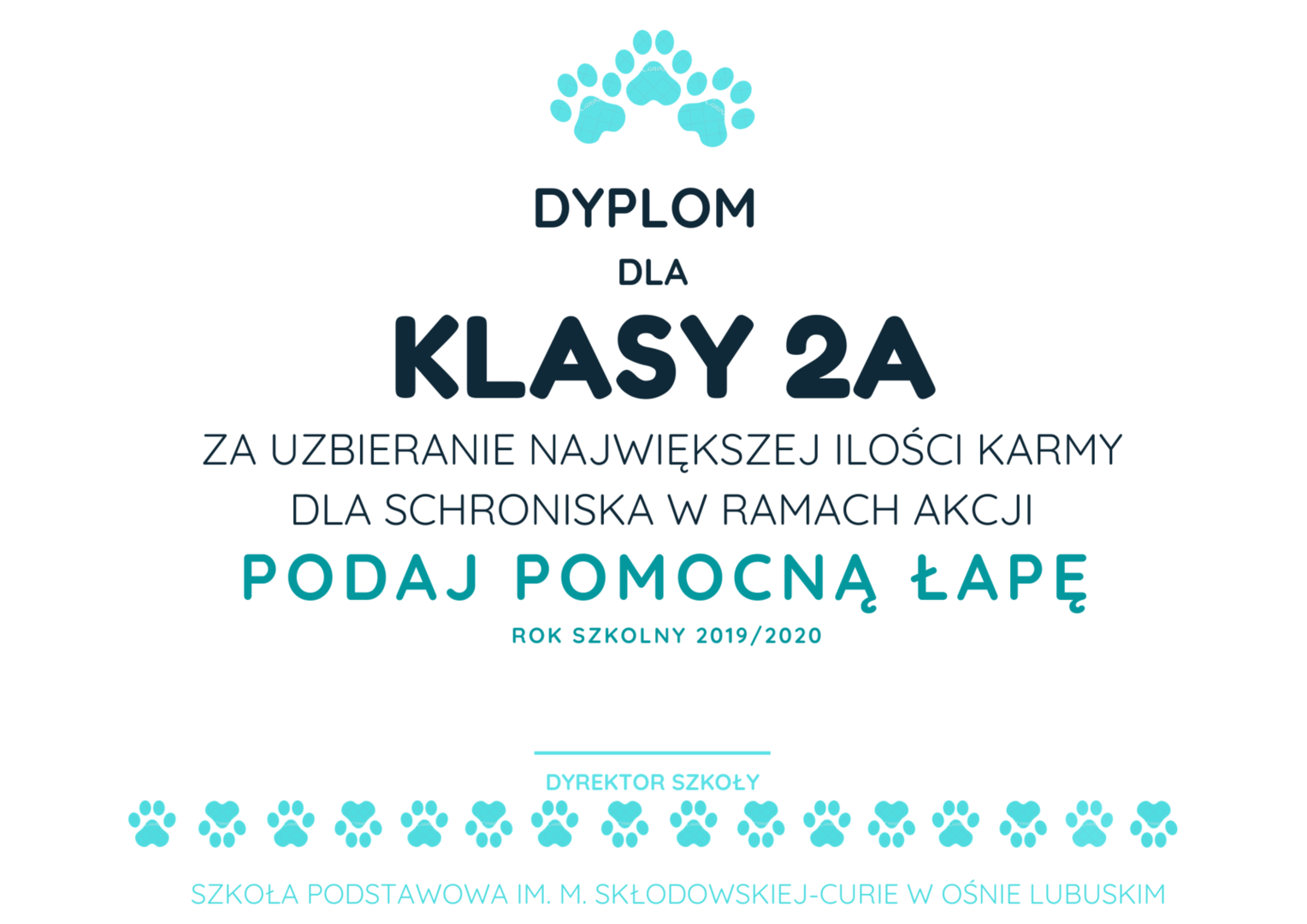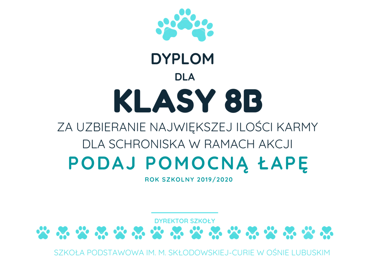 Bardzo dziękujemy wszystkim uczniom, rodzicom oraz nauczycielom, którzy z tak ogromnym zapałem zaangażowali się w naszą akcję! Postanowiliśmy wyróżnić pamiątkowymi dyplomami klasy, których uczniowie przynieśli najwięcej karmy😊