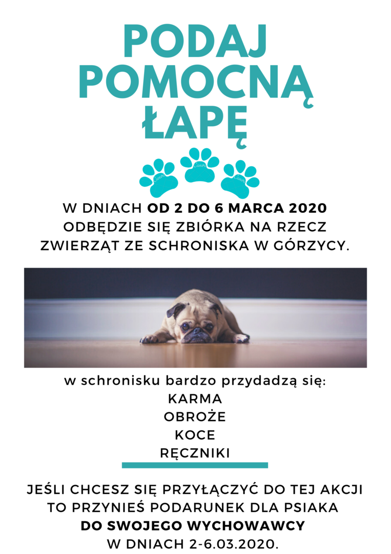 Tuż przed rozpoczęciem zdalnej edukacji Samorząd Uczniowski, redakcja Szkolnego Mixa oraz klasa 6a zdążyli zorganizować akcję „Podaj Pomocną Łapę”, której celem była zbiórka na rzecz schroniska dla zwierząt w Górzycy. Przez cały tydzień można było przynosić karmę, obroże, koce i ręczniki. Nasi wolontariusze codziennie zabierali przyniesione przez Was podarunki i zanosi do magazynu. Łącznie udało nam się uzbierać 215 kg suchej karmy, mnóstwo puszek z pożywieniem dla psów oraz liczne ręczniki, koce i obroże. 19 czerwca udało nam się dostarczyć zebrane podarunki do schroniska.