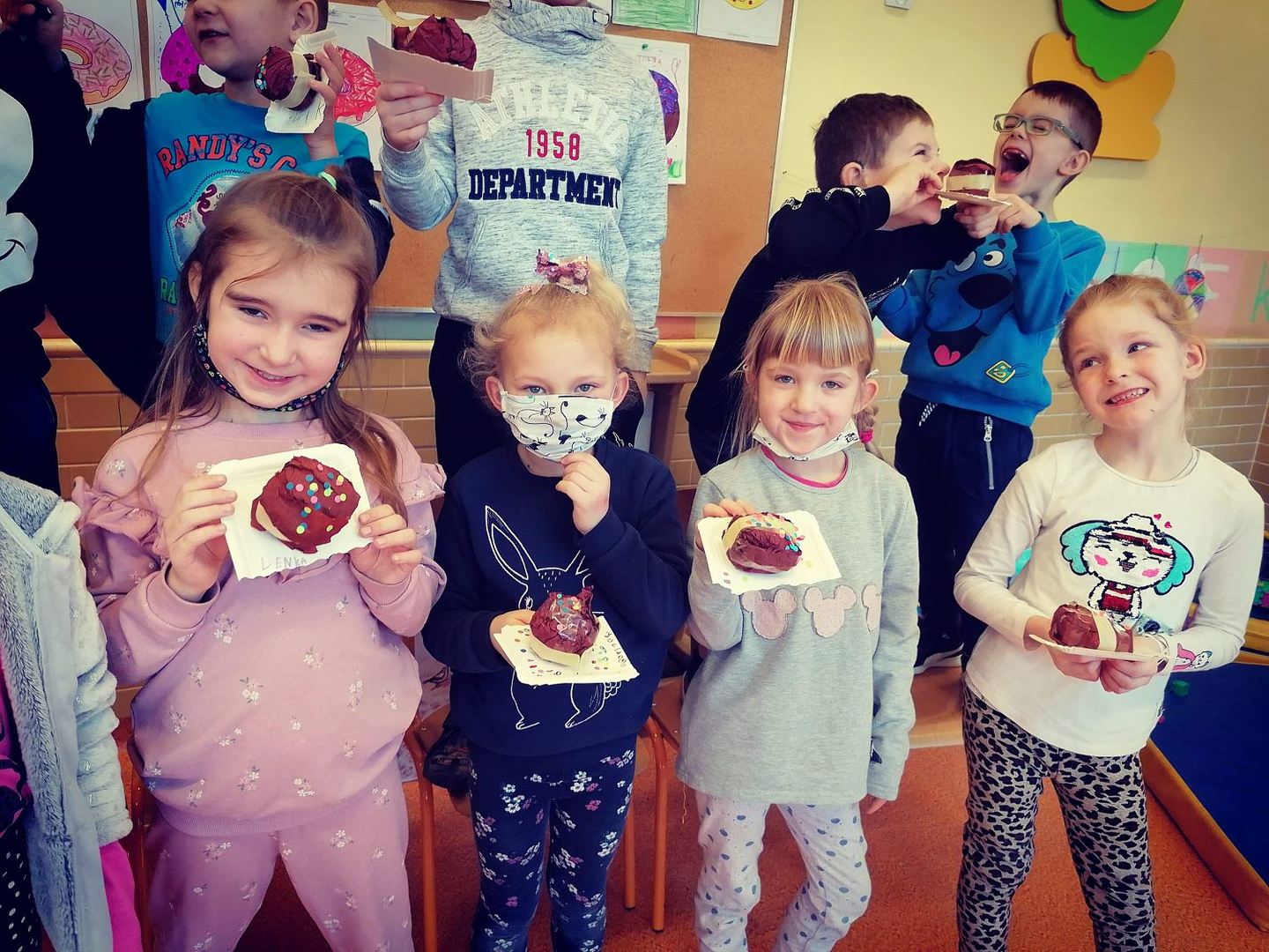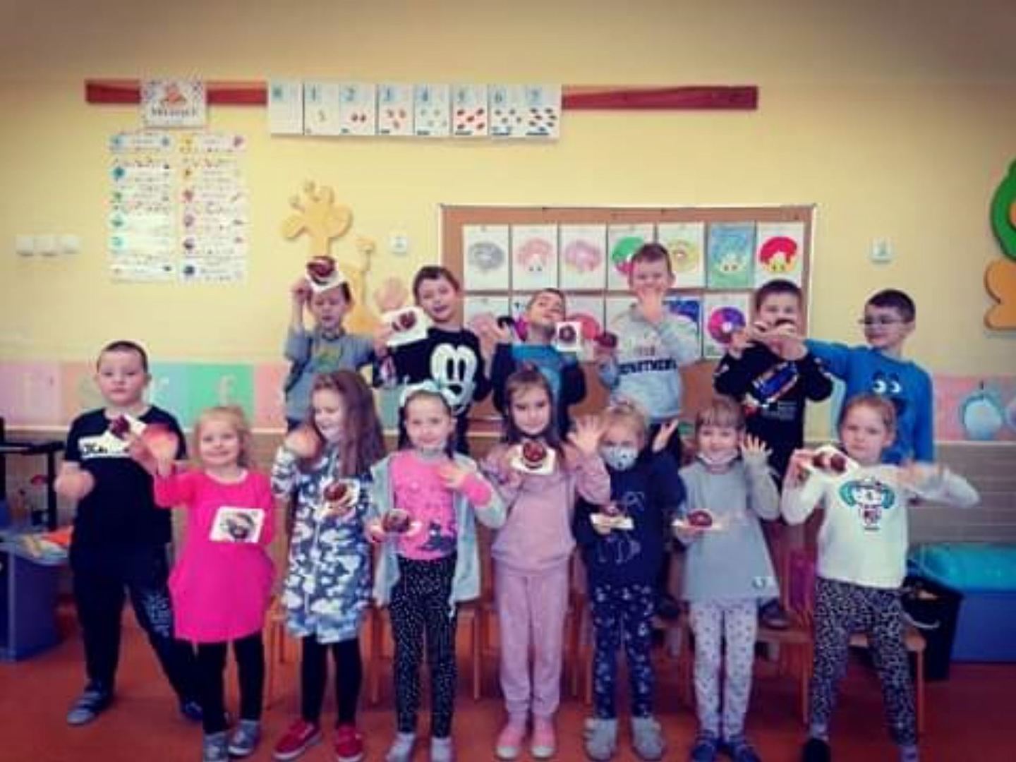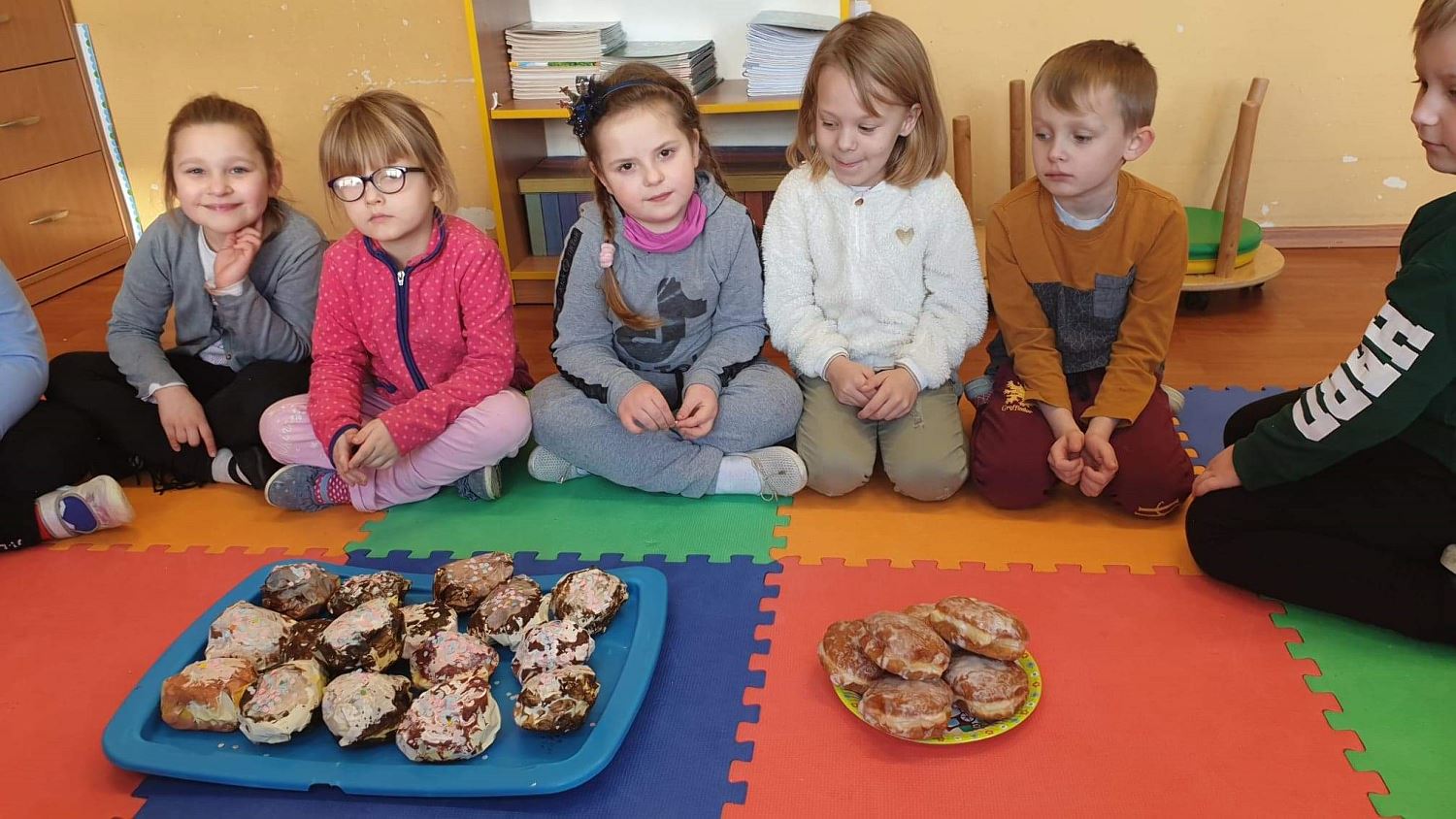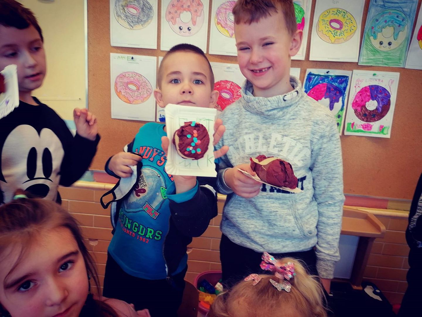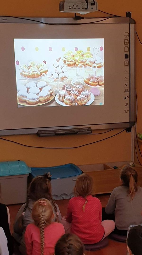 Żabki oglądały prezentację multimedialną, dzięki której mogły się dowiedzieć, jakie przysmaki goszczą na stołach w innych państwach. Pączki z Chin, posypane cukrem, ukrywające w sobie smak czerwonej fasoli, Pakistańskie BALUSHAHI, francuskie BEIGNETY, niemieckie BISMARCKI, włoskie BOMBOLINI, hiszpańskie HURROS, chińskie YOUTIAYO, holenderskie OLIENBILLEN, czy najbardziej znane amerykańskie DONUTY sprawiły, ze podróż po świecie smakowała niesamowicie różnorodnie. Dzieci z grupy Pani Ani i Pani Kasi, a także dzieci w świetlicy pod okiem Pani Oli wykonały apetyczne papierowe Pączki. Praca łączyła w sobie wiele technik- zgniatanie, zawijanie, malowanie, oklejanie oraz posypywanie – jakże by inaczej kolorową posypką przyniosła niesamowity skutek. Uczniowie włożyli w to mnóstwo pracy ale efekt przeszedł najśmielsze oczekiwania. Wizualnie nie różniły się one niczym od prawdziwych. Niektórzy dali się nabrać na tego psikusa. Nie mogliśmy zapomnieć o przysłowiu - „Powiedział Bartek, że dziś Tłusty Czwartek, a Bartkowa uwierzyła, pysznych paczków nasmażyła. Gdy już zapach pączków roznosił się po całej szkole i my postanowiliśmy przysiąść i z apetytem skosztować tradycyjnych, polskich pączków. Była to doskonalą okazja kosztowania i rozmów na temat nadzienia oraz konsystencji przysmaku. Jak mówi poznana tradycja, tego dnia należy skosztować PRZYNAJMNIEJ jednego pączka, by mieć szczęście, a jak wiadomo szczęścia nie da się przedawkować 😂