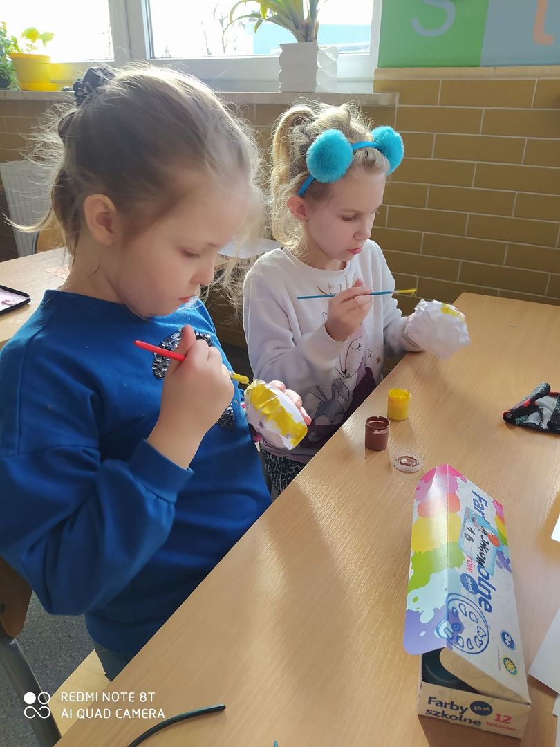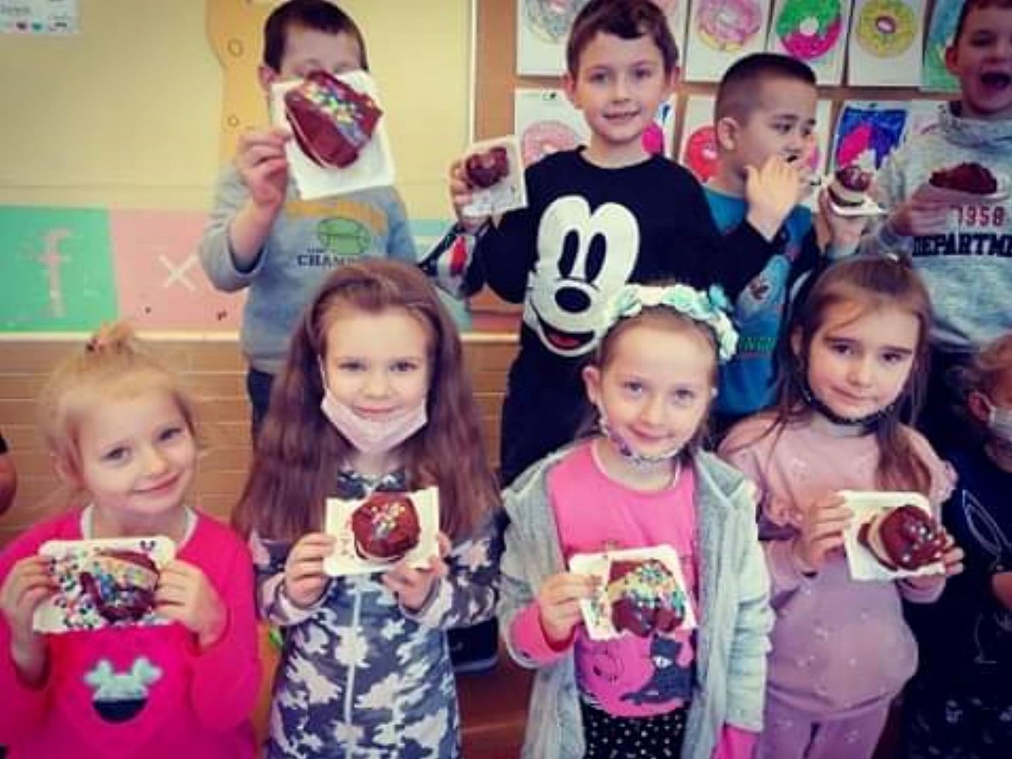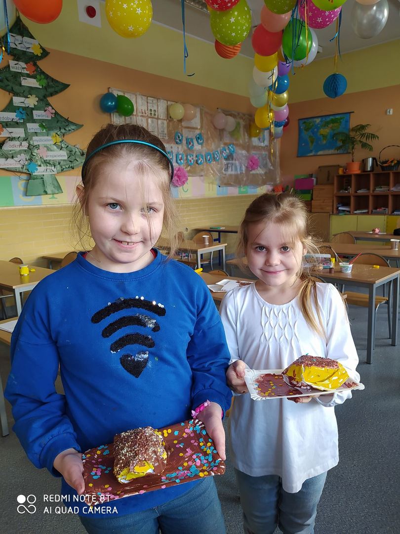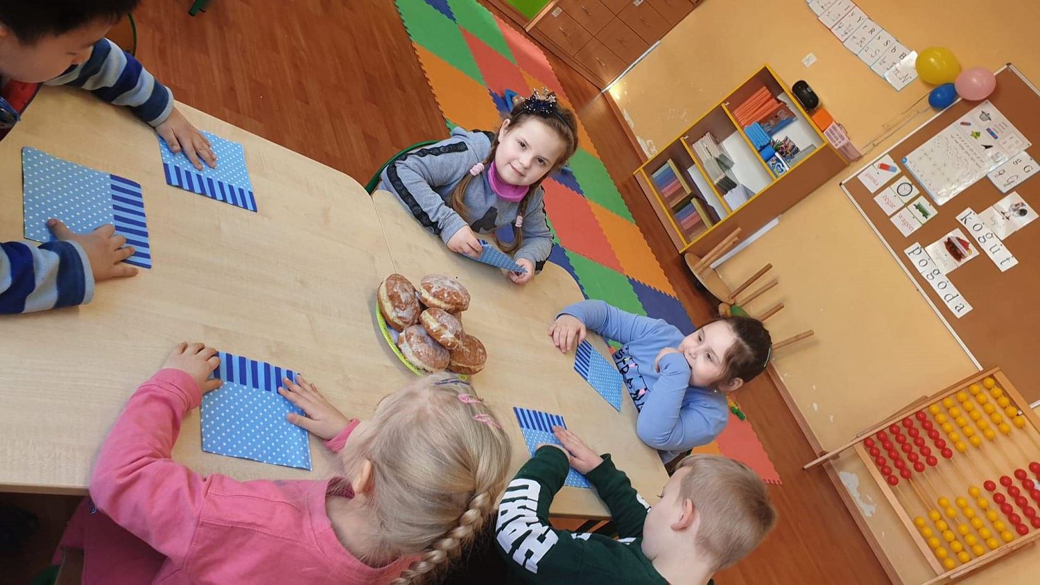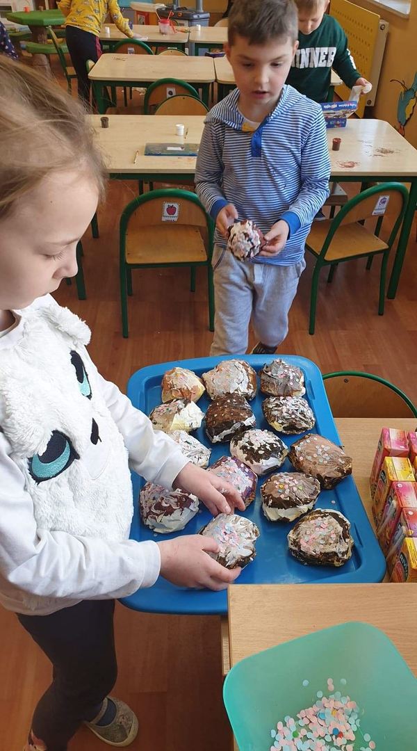 Żabki oglądały prezentację multimedialną, dzięki której mogły się dowiedzieć, jakie przysmaki goszczą na stołach w innych państwach. Pączki z Chin, posypane cukrem, ukrywające w sobie smak czerwonej fasoli, Pakistańskie BALUSHAHI, francuskie BEIGNETY, niemieckie BISMARCKI, włoskie BOMBOLINI, hiszpańskie HURROS, chińskie YOUTIAYO, holenderskie OLIENBILLEN, czy najbardziej znane amerykańskie DONUTY sprawiły, ze podróż po świecie smakowała niesamowicie różnorodnie. Dzieci z grupy Pani Ani i Pani Kasi, a także dzieci w świetlicy pod okiem Pani Oli wykonały apetyczne papierowe Pączki. Praca łączyła w sobie wiele technik- zgniatanie, zawijanie, malowanie, oklejanie oraz posypywanie – jakże by inaczej kolorową posypką przyniosła niesamowity skutek. Uczniowie włożyli w to mnóstwo pracy ale efekt przeszedł najśmielsze oczekiwania. Wizualnie nie różniły się one niczym od prawdziwych. Niektórzy dali się nabrać na tego psikusa. Nie mogliśmy zapomnieć o przysłowiu - „Powiedział Bartek, że dziś Tłusty Czwartek, a Bartkowa uwierzyła, pysznych paczków nasmażyła. Gdy już zapach pączków roznosił się po całej szkole i my postanowiliśmy przysiąść i z apetytem skosztować tradycyjnych, polskich pączków. Była to doskonalą okazja kosztowania i rozmów na temat nadzienia oraz konsystencji przysmaku. Jak mówi poznana tradycja, tego dnia należy skosztować PRZYNAJMNIEJ jednego pączka, by mieć szczęście, a jak wiadomo szczęścia nie da się przedawkować 😂