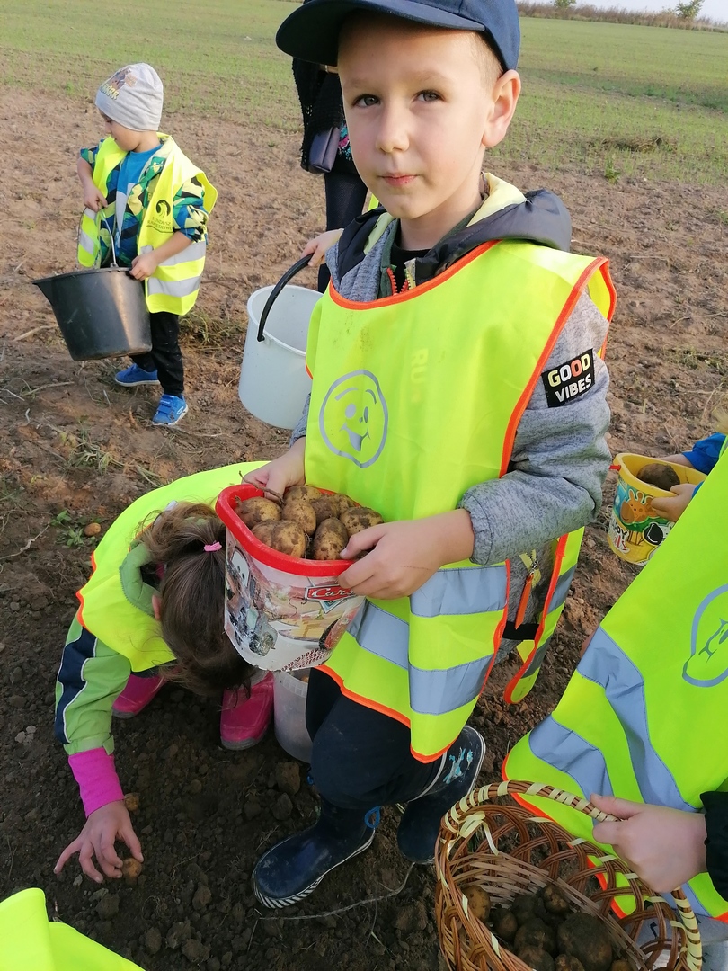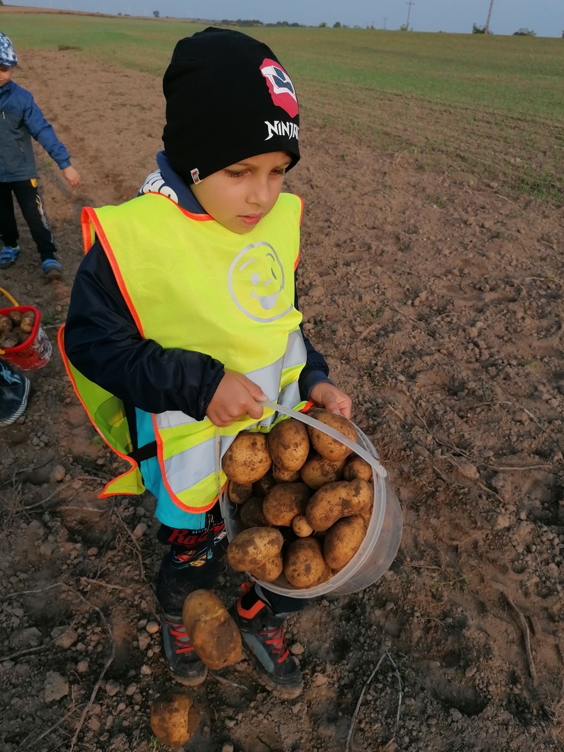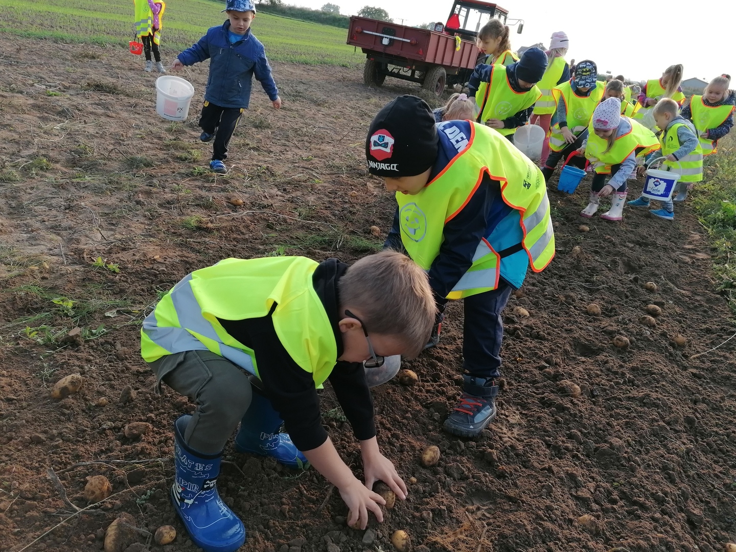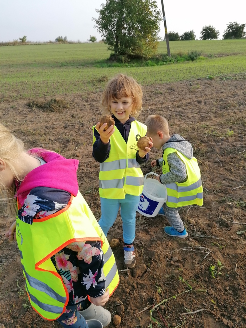 Tym razem Wychowawczynie - Pani Anna Romańczuk - Zawadzka, Pani Lidia Trafas i zaprzyjaźniona Pani Pedagog Aleksandra Chomicz postanowiły przenieść się w inne, jeszcze bardziej malownicze miejsce. Osadzone 5 kilometrów dalej Świniary zachwyciły dzieci. Fakt, że przyjechaliśmy tam, by zobaczyć jak wyglądają tradycyjne wykopki na wsi spotęgowała ciekawość. Od samego rana czekali na nas Gospodarze- Państwo Begier i Stachowiak, którzy to od razu wprowadzili nas w zasady bezpieczeństwa panujące podczas prac polowych. Zaprezentowali traktor oraz zapoznali z przeznaczeniem kopaczki i elementami składającymi się na ten sprzęt. Dzieci zobaczyły, że ziemniaki sadzi się w specjalnie przygotowanych redlinach. Mogliśmy je wszystkie policzyć a nawet i przeskoczyć. Zabawy było co nie miara. Pogoda tego dnia dopisała, więc zabawom i konkursom na ziemniaczanym polu nie było końca. Tropiciele i Odkrywcy prześcigali się podczas zbierania. W efekcie, z uśmiechem na ustach zebrali ziemniaki z kilku redlin. Dzięki uprzejmości Gospodarzy przebraliśmy ziemniaczki, wybierając te najbardziej odpowiednie do ogniska.