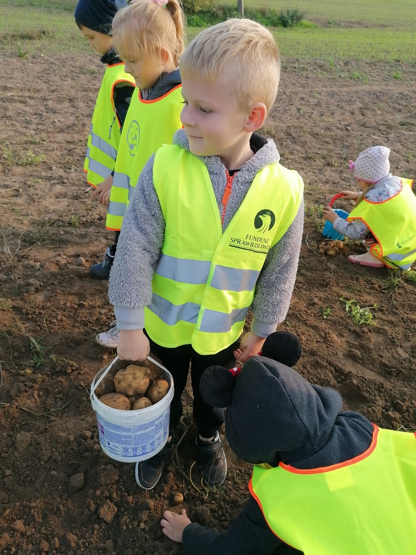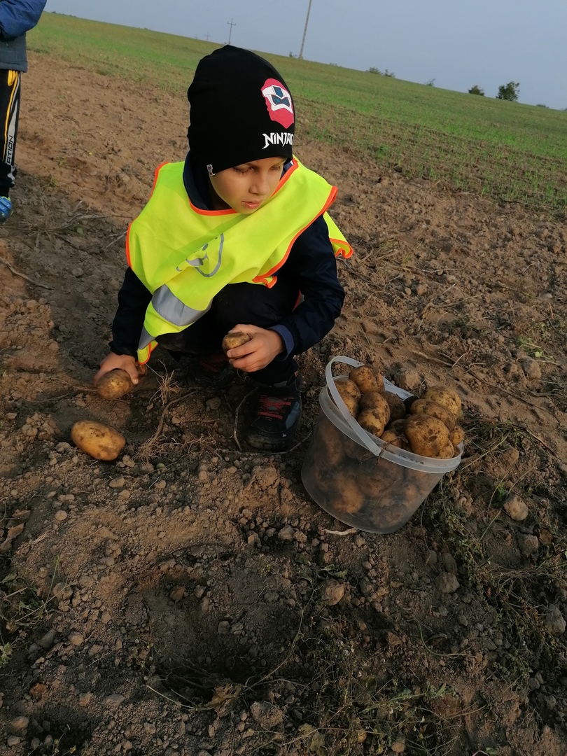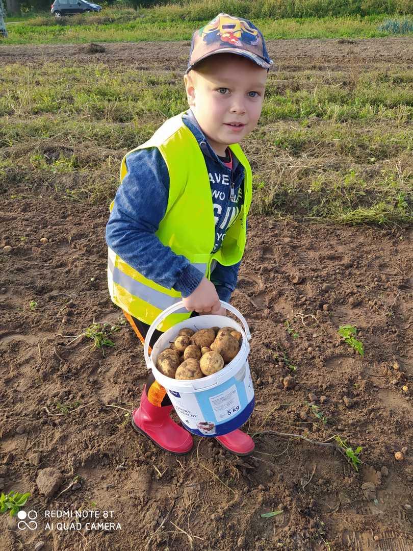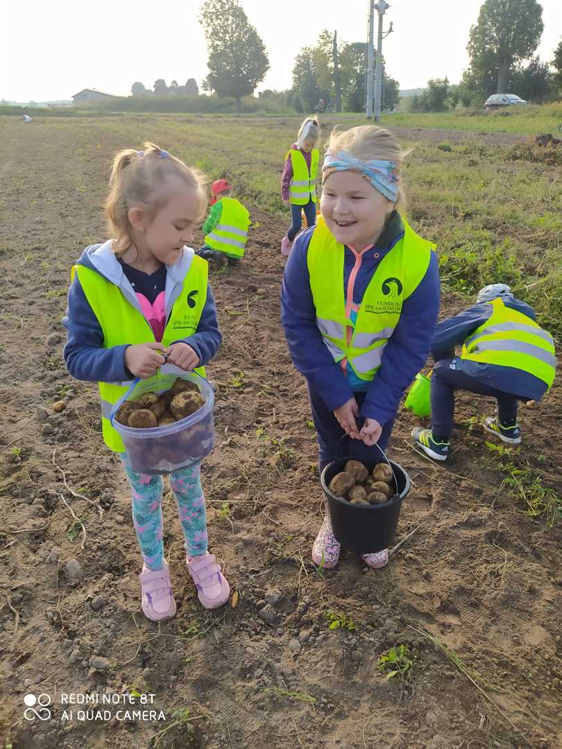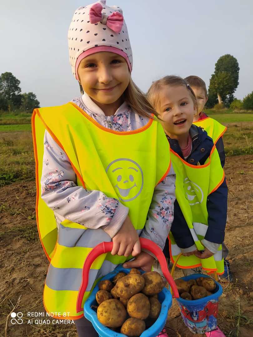Tym razem Wychowawczynie - Pani Anna Romańczuk - Zawadzka, Pani Lidia Trafas i zaprzyjaźniona Pani Pedagog Aleksandra Chomicz postanowiły przenieść się w inne, jeszcze bardziej malownicze miejsce. Osadzone 5 kilometrów dalej Świniary zachwyciły dzieci. Fakt, że przyjechaliśmy tam, by zobaczyć jak wyglądają tradycyjne wykopki na wsi spotęgowała ciekawość. Od samego rana czekali na nas Gospodarze- Państwo Begier i Stachowiak, którzy to od razu wprowadzili nas w zasady bezpieczeństwa panujące podczas prac polowych. Zaprezentowali traktor oraz zapoznali z przeznaczeniem kopaczki i elementami składającymi się na ten sprzęt. Dzieci zobaczyły, że ziemniaki sadzi się w specjalnie przygotowanych redlinach. Mogliśmy je wszystkie policzyć a nawet i przeskoczyć. Zabawy było co nie miara. Pogoda tego dnia dopisała, więc zabawom i konkursom na ziemniaczanym polu nie było końca. Tropiciele i Odkrywcy prześcigali się podczas zbierania. W efekcie, z uśmiechem na ustach zebrali ziemniaki z kilku redlin. Dzięki uprzejmości Gospodarzy przebraliśmy ziemniaczki, wybierając te najbardziej odpowiednie do ogniska.