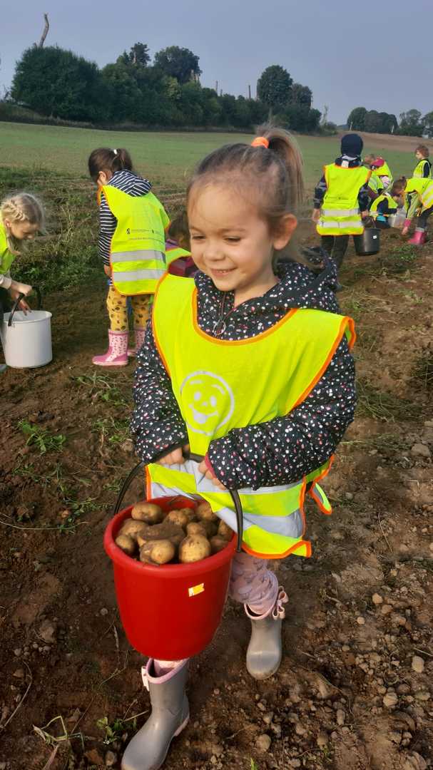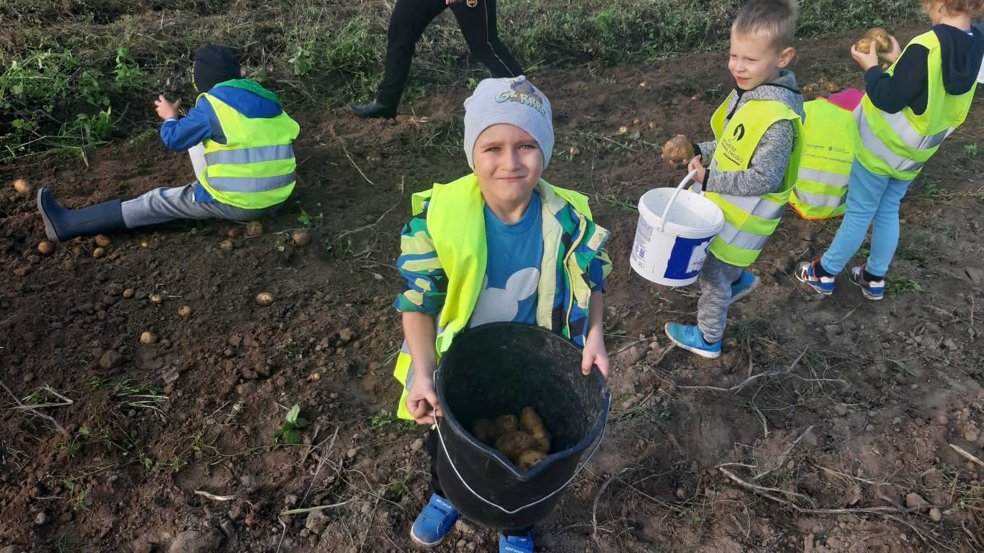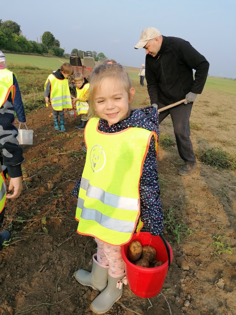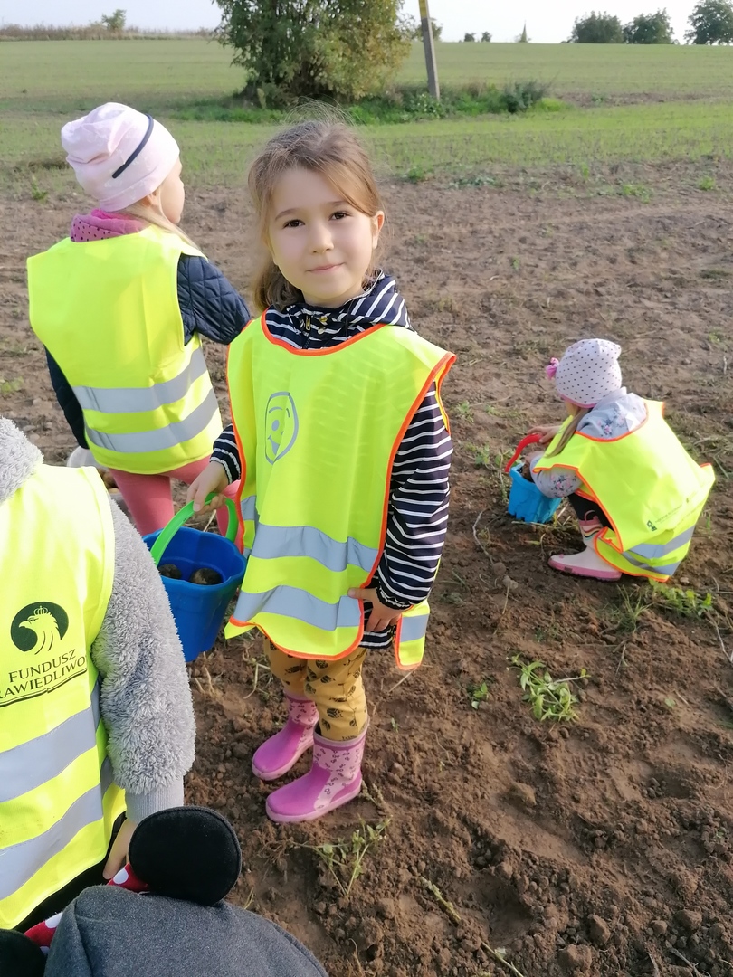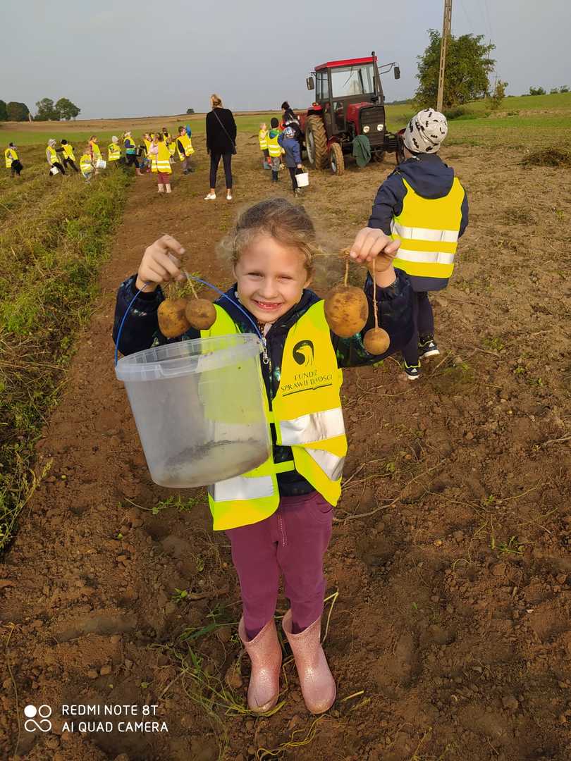 Tym razem Wychowawczynie - Pani Anna Romańczuk - Zawadzka, Pani Lidia Trafas i zaprzyjaźniona Pani Pedagog Aleksandra Chomicz postanowiły przenieść się w inne, jeszcze bardziej malownicze miejsce. Osadzone 5 kilometrów dalej Świniary zachwyciły dzieci. Fakt, że przyjechaliśmy tam, by zobaczyć jak wyglądają tradycyjne wykopki na wsi spotęgowała ciekawość. Od samego rana czekali na nas Gospodarze- Państwo Begier i Stachowiak, którzy to od razu wprowadzili nas w zasady bezpieczeństwa panujące podczas prac polowych. Zaprezentowali traktor oraz zapoznali z przeznaczeniem kopaczki i elementami składającymi się na ten sprzęt. Dzieci zobaczyły, że ziemniaki sadzi się w specjalnie przygotowanych redlinach. Mogliśmy je wszystkie policzyć a nawet i przeskoczyć. Zabawy było co nie miara. Pogoda tego dnia dopisała, więc zabawom i konkursom na ziemniaczanym polu nie było końca. Tropiciele i Odkrywcy prześcigali się podczas zbierania. W efekcie, z uśmiechem na ustach zebrali ziemniaki z kilku redlin. Dzięki uprzejmości Gospodarzy przebraliśmy ziemniaczki, wybierając te najbardziej odpowiednie do ogniska.