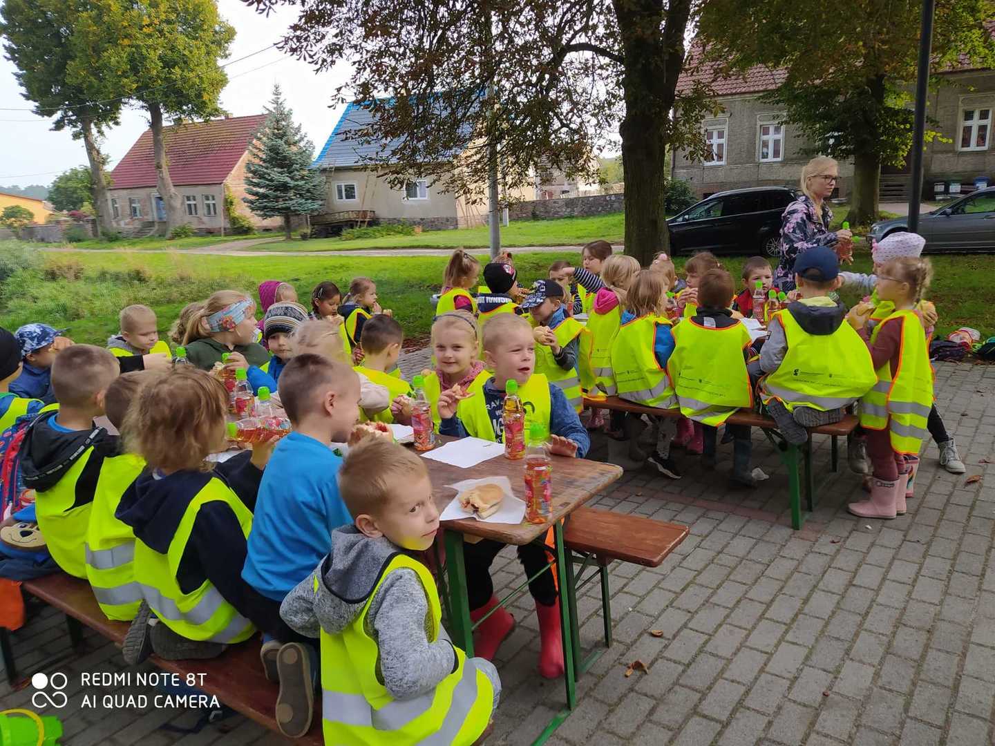 Gdy praca polowa dobiegła końca, podziękowaliśmy za gościnę, pożegnaliśmy się i wyruszyliśmy w okolice świetlicy wiejskiej na przepyszny poczęstunek, który przygotowały dla nas Mamusie z obu grup. Dziękujemy za zaangażowanie Pani Izie, Pani Mai, Pani Natalii i Pani Kindze. Ciepła kiełbaska z ogniska po tak wyczerpujacej pracy smakowała inaczej niż zawsze.