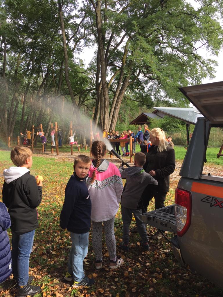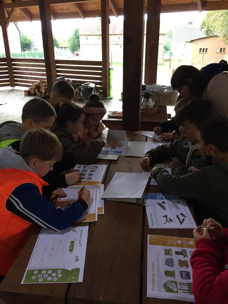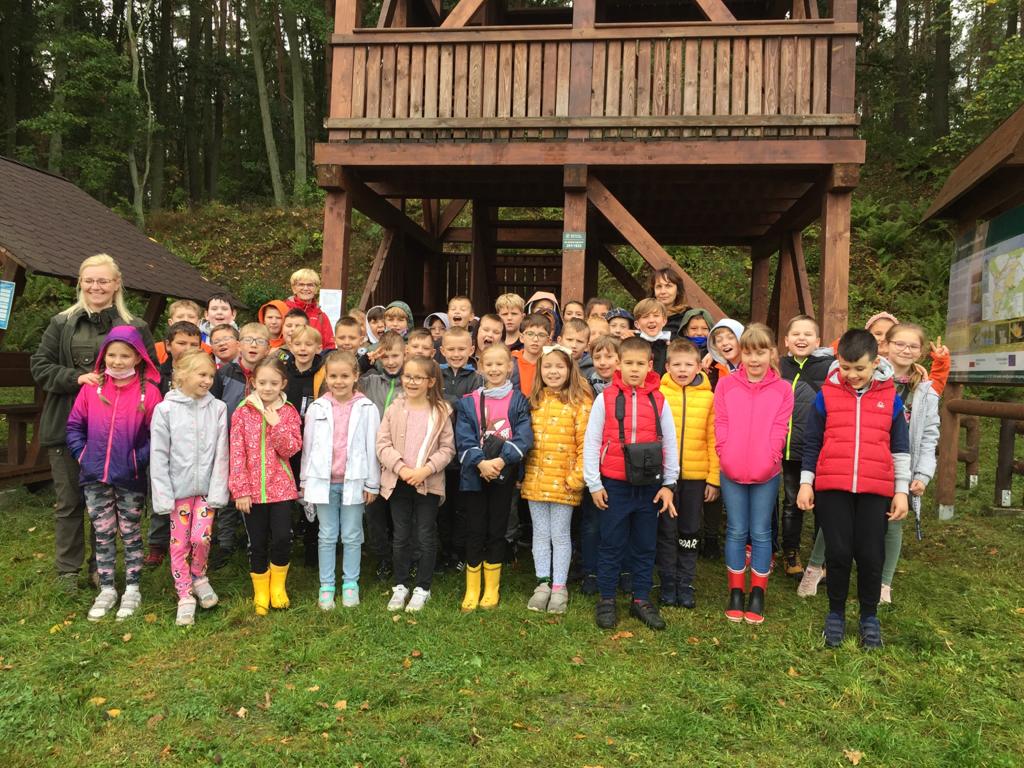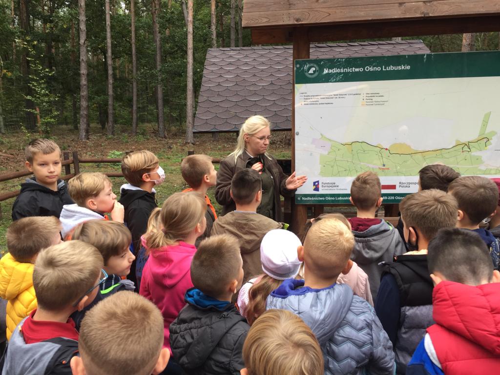 Korzystając ze słonecznej, jesiennej pogody w środę 6.10.2021 r. uczniowie klas IIb i IIIa wybrali się na wycieczkę „Szlakiem dzięcioła”, położonym na terenie Nadleśnictwa Ośno Lubuskie. Tuż po przyjeździe udaliśmy się na ścieżkę przyrodniczo-edukacyjną, gdzie pod kierunkiem Pani Pauliny Możejko poznawaliśmy wartości przyrodnicze lasów, zapoznaliśmy się z występującymi tam roślinami i zwierzętami, rozpoznawaliśmy różne gatunki dzięciołów i poznawaliśmy ich zwyczaje. Zaopatrzeni w lornetki weszliśmy na wieżę obserwacyjną, gdzie podziwialiśmy piękną panoramę nadwarciańskich łąk, rozlewisk i przygotowujące się do odlotu gęsi. Następnie „naładowani” wiedzą udaliśmy się do leśniczówki w Lemierzycach, gdzie uczniowie mogli sprawdzić swoją wiedzę na temat poznanych wiadomości, rozwiązując przygotowane przez Panią Paulinkę zadania. W nagrodę za aktywne uczestnictwo każdy otrzymał piękny upominek. Na zakończenie zjedliśmy kiełbaski upieczone na grillu i pobawiliśmy się na placu zabaw, gdzie mogliśmy sprawdzić swoją sprawność fizyczną pokonując tor przeszkód.