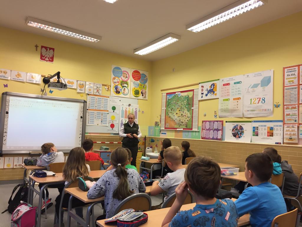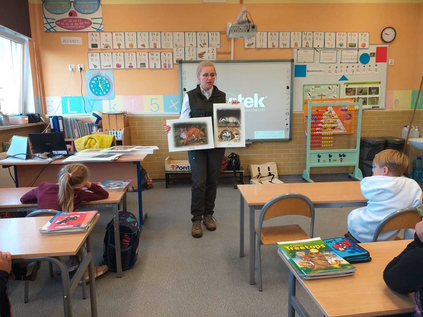 28 października uczniowie kl. II b i III a zaprosili na lekcję z edukacji przyrodniczej panią Paulinę Możejko, która jest pracownikiem Nadleśnictwa w Ośnie Lubuskim . Tematem zajęć był „Las i jego mieszkańcy”. Pani Paulina w sposób bardzo ciekawy i interesujący opowiadała dzieciom o funkcjach lasu, jego strukturze ekologicznej i funkcjonowaniu ekosystemów leśnych. Dzieci pogłębiły swoją wiedzę na temat lasu jako środowiska życia niektórych gatunków zwierząt, drzew i krzewów. Dowiedziały się również o tym, że las jest nieograniczonym źródłem darów, z których korzystamy. Najważniejszym jest drewno- surowiec w pełni odnawialny, naturalny, zdrowy i ekologiczny. Jednak oprócz niego las dostarcza nam także produktów wykorzystywanych na przykład w kuchni, medycynie naturalnej lub przy wielu innych okazjach. Na zakończenie uczniowie zadawali wiele pytań na tematy ich nurtujące, ale ściśle związane z lasem . Przypomniały sobie zasady właściwego zachowania się w lesie i doszły wspólnie do wniosku, że możemy korzystać z lasu, ale w zrównoważony sposób, dlatego w każdej sytuacji powinniśmy kierować się dobrem przyrody i pamiętać o tym, że w lesie jesteśmy tylko gośćmi.