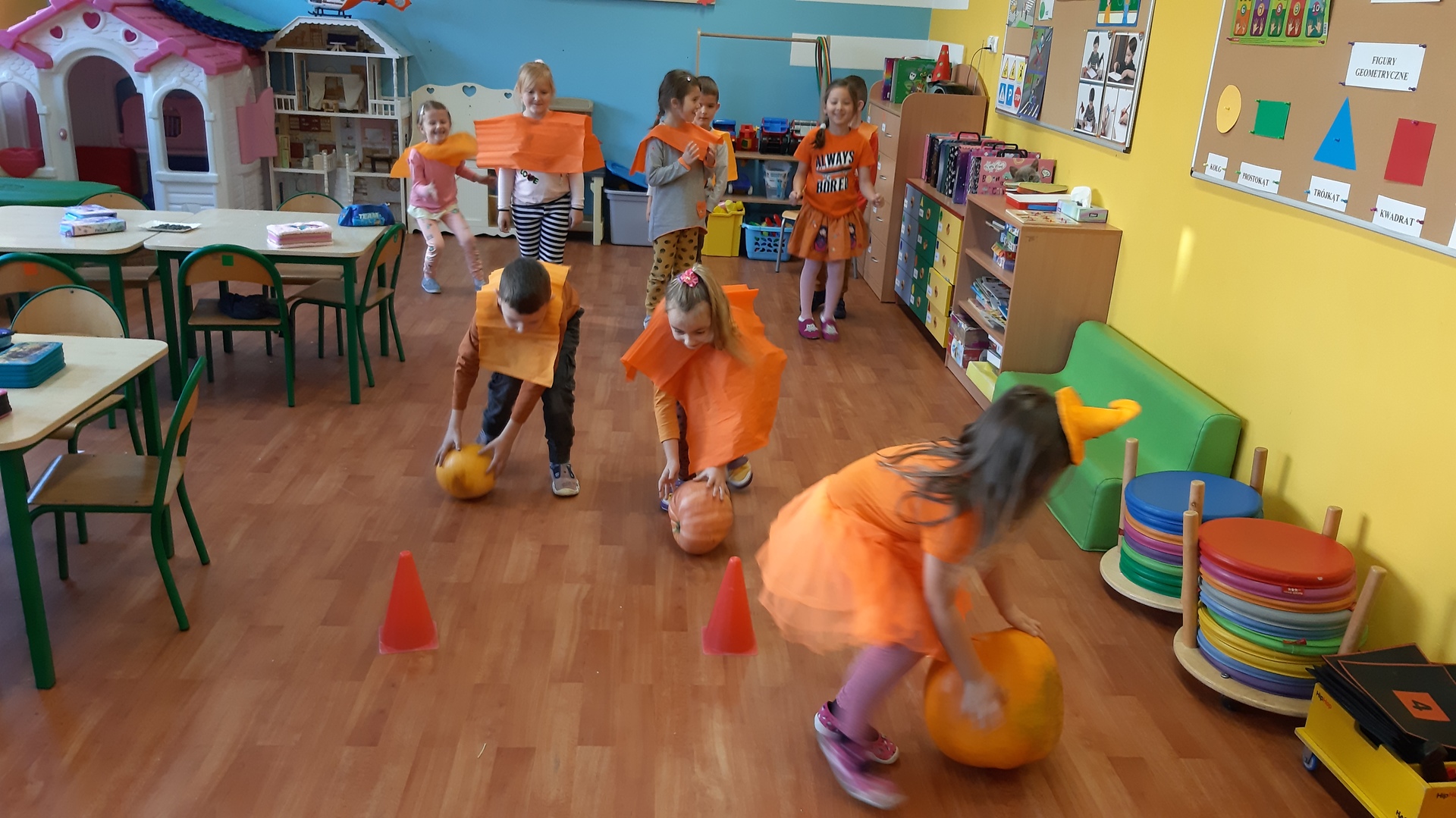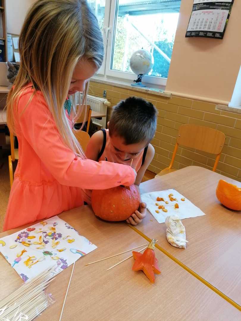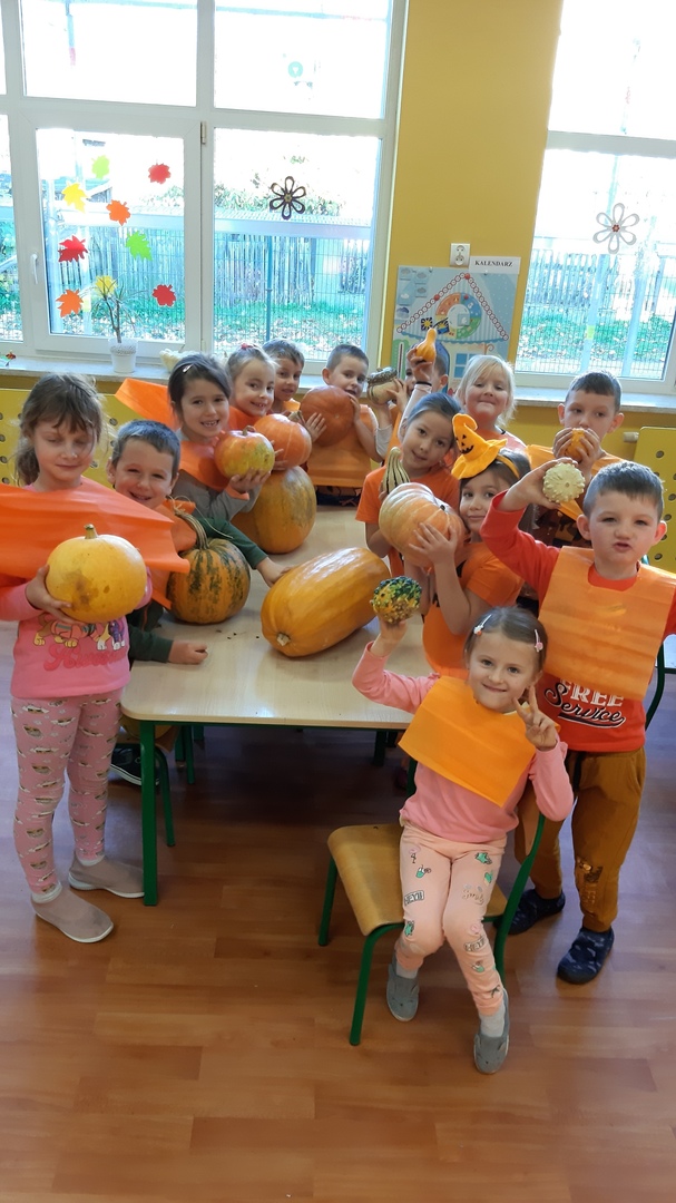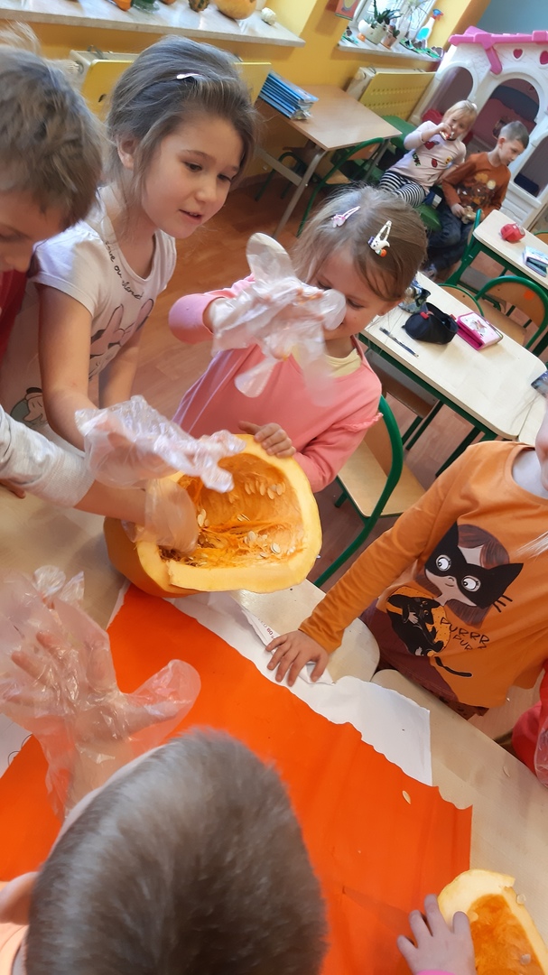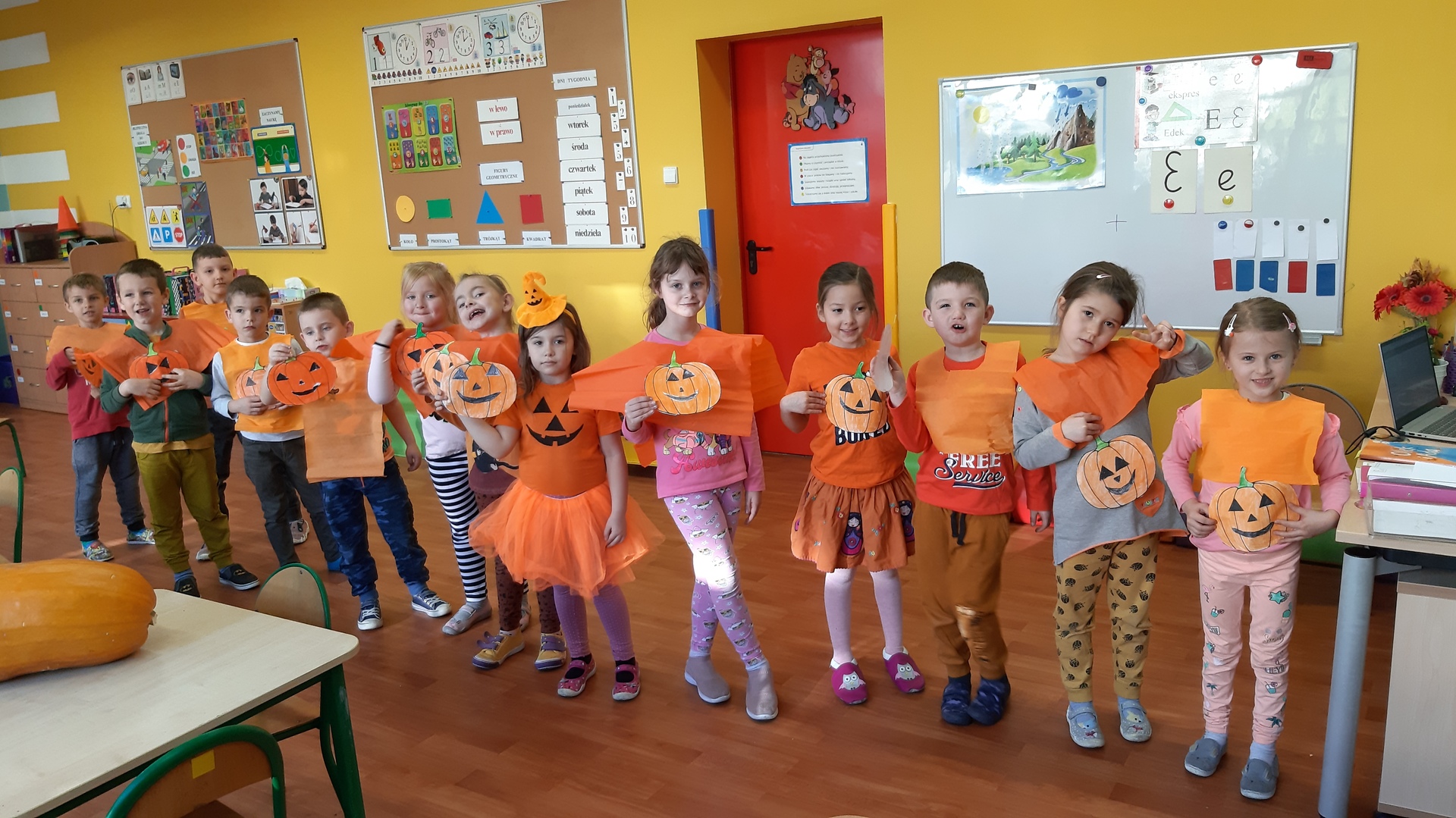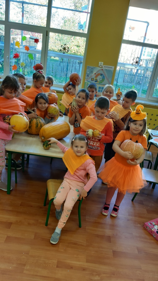 29 listopada w klasie 0A i 0B obchodziliśmy Dzień Dyni. Tego dnia nasze pracownie przypominały grządki, na których pojawiły się pomarańczowe dynie. Dzieci dowiedziały się jakim " wszechstronnym" warzywem jest dynia. Poznały różne walory dyni - kształt, kolor, wielkość. Smakowały warzywo i jego pestki. Okazało się, że dynia może też służyć jako sprzęt sportowy - była " piłką" do toczenia i przeszkodą w slalomie, a dyniowe, uśmiechnięte buźki wykonane przez dzieci, są ozdobą szkolnego korytarza. To był miły i pełen dyniowych wrażeń dzień.