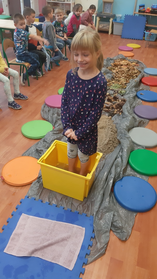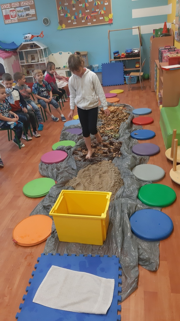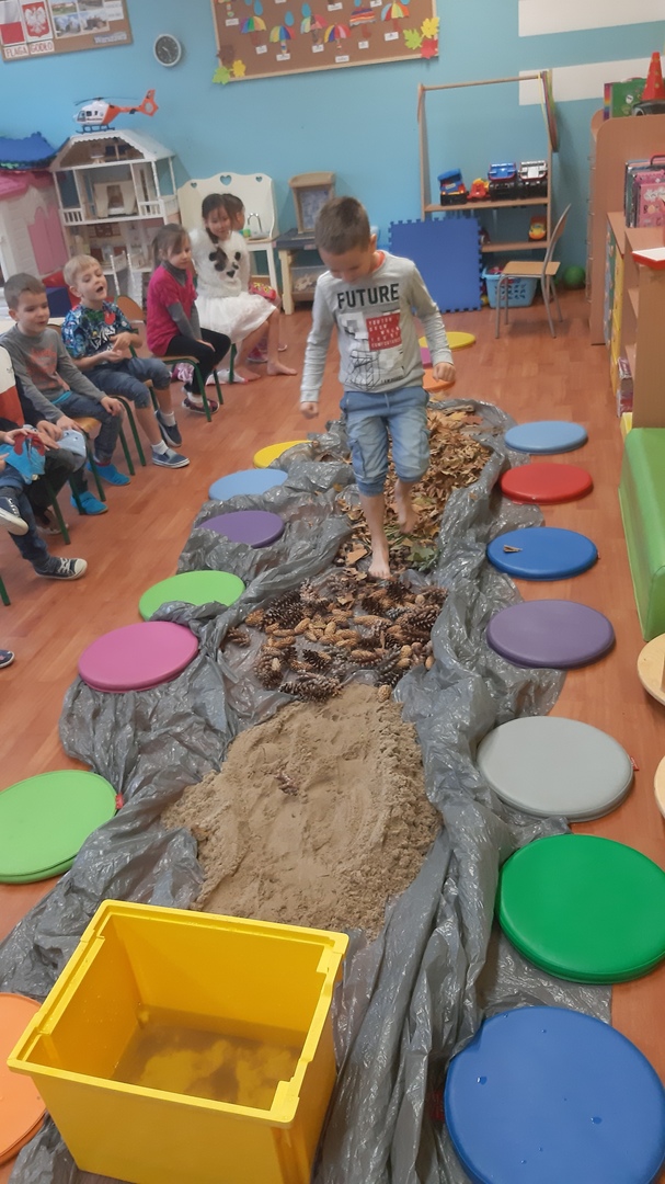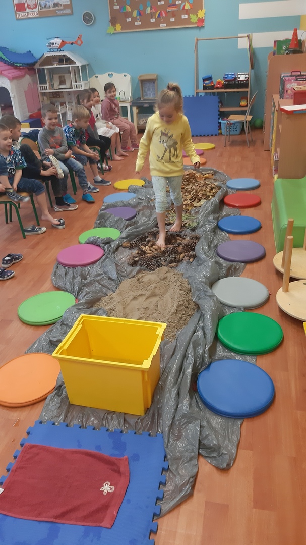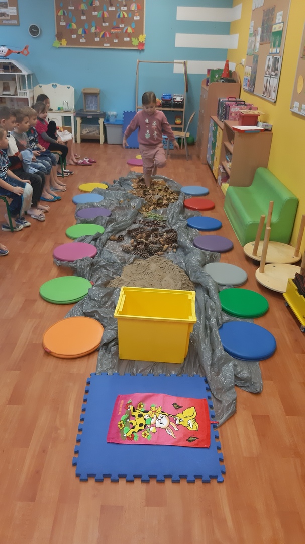 Nasze dzieci miały do przebycia jesienną ścieżkę sensoryczną, która wcale nie była taka łatwa. Musiały przejść boso po darach jesieni - ususzonych liściach, ściętej trawie, kasztanach i żołędziach, szyszkach różnej wielkości. Na końcu ścieżki i odciskały ślady stóp w piaskownicy. Wszystkim taki spacerek bardzo się podobał.