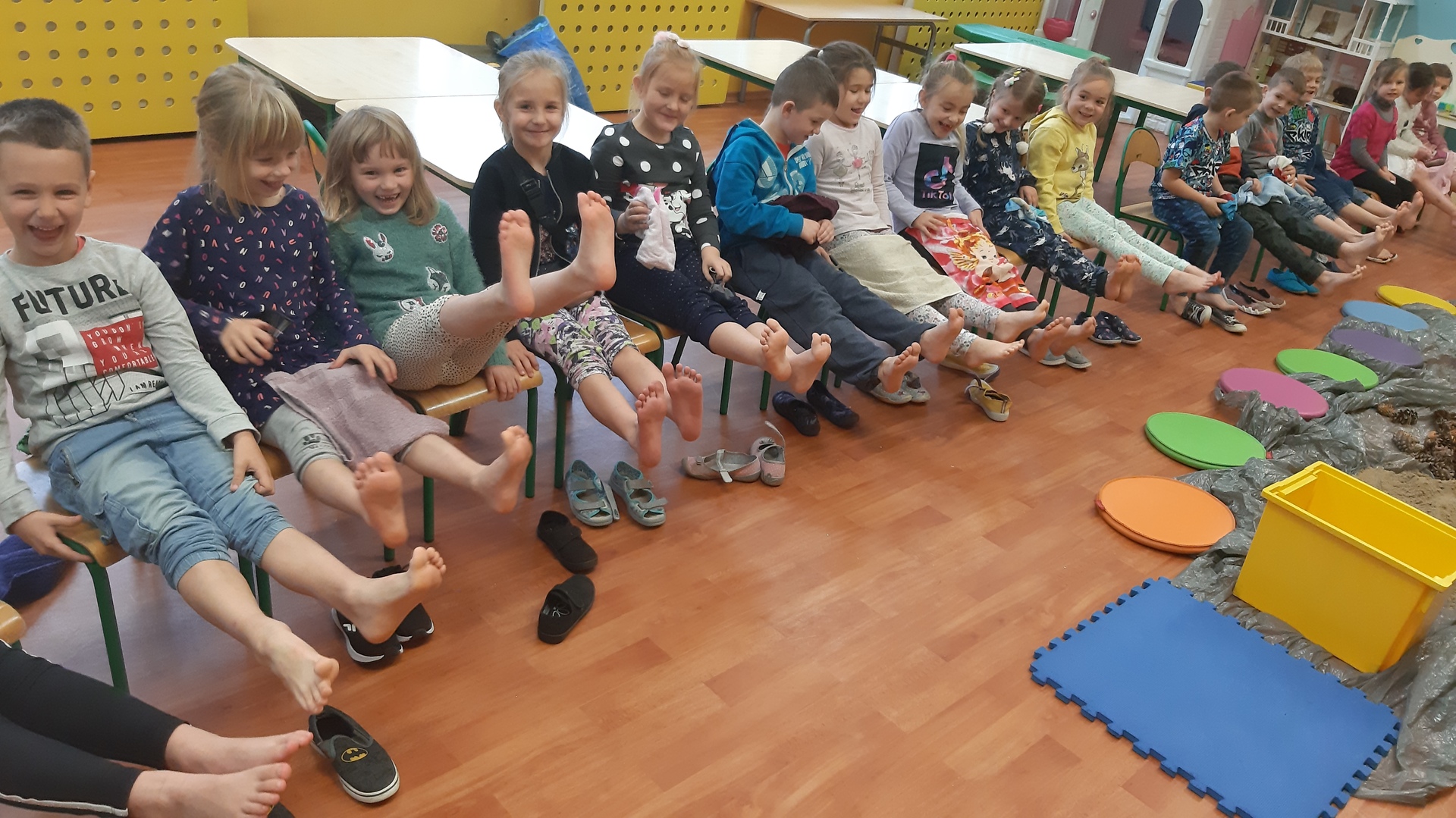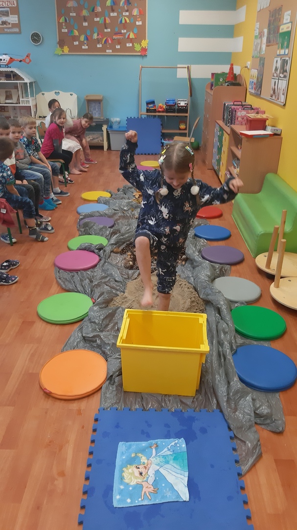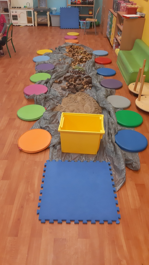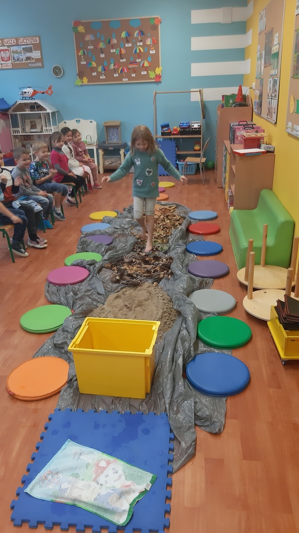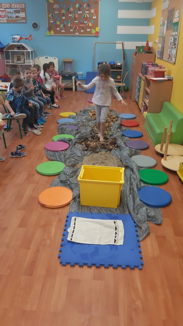 Nasze dzieci miały do przebycia jesienną ścieżkę sensoryczną, która wcale nie była taka łatwa. Musiały przejść boso po darach jesieni - ususzonych liściach, ściętej trawie, kasztanach i żołędziach, szyszkach różnej wielkości. Na końcu ścieżki i odciskały ślady stóp w piaskownicy. Wszystkim taki spacerek bardzo się podobał.