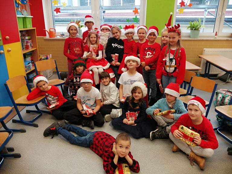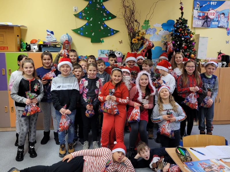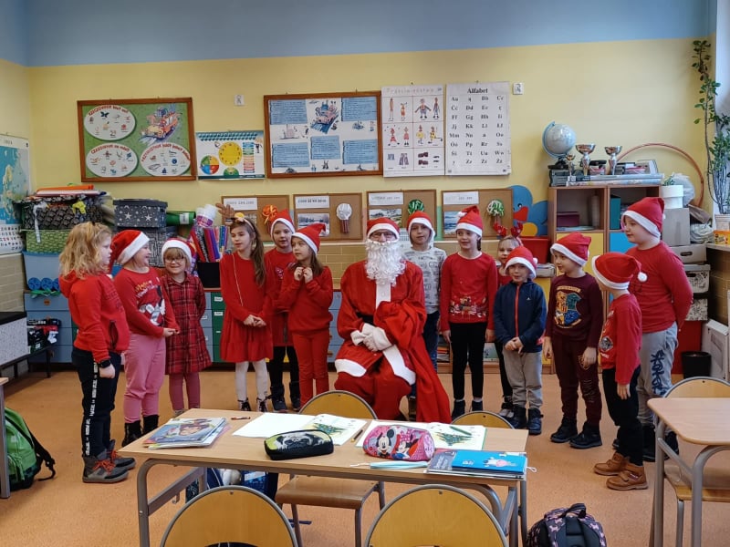 Dzisiejsza aura sprzyjała wydarzeniom ,które zwiastowały przybycie Świętego Mikołaja. Lekki puch na gałązkach drzew pojawił się 6 grudnia ,a w naszej szkole długo oczekiwany gość. Dzieci bardzo ucieszyły się z tej niezwykłej wizyty. Od rana w szkole panował świąteczny nastrój w oczekiwaniu na odwiedziny Mikołaja. Lekki mrozek nie przeszkodził Świętemu i od pierwszej godziny lekcyjnej na korytarzach szkolnych słychać było dzwonek i charakterystyczny głos : „Ho, ho ho!” To Mikołaj wraz ze swoją świtą: elfami, odwiedzał dzieci w klasach i wręczał im słodkie upominki. Nauczyciele również zostali obdarowani słodkimi drobiazgami. Dzieci i nauczyciele, aby godnie przyjąć gościa założyły najbardziej popularny atrybut świętego – czerwone czapki.