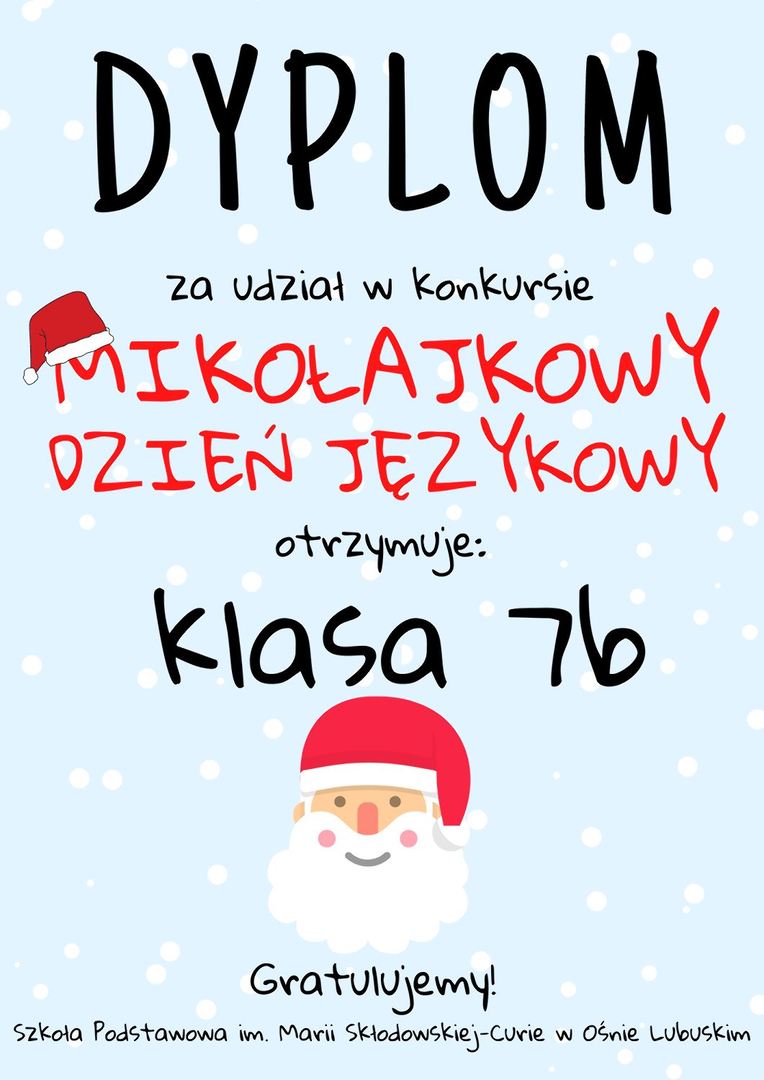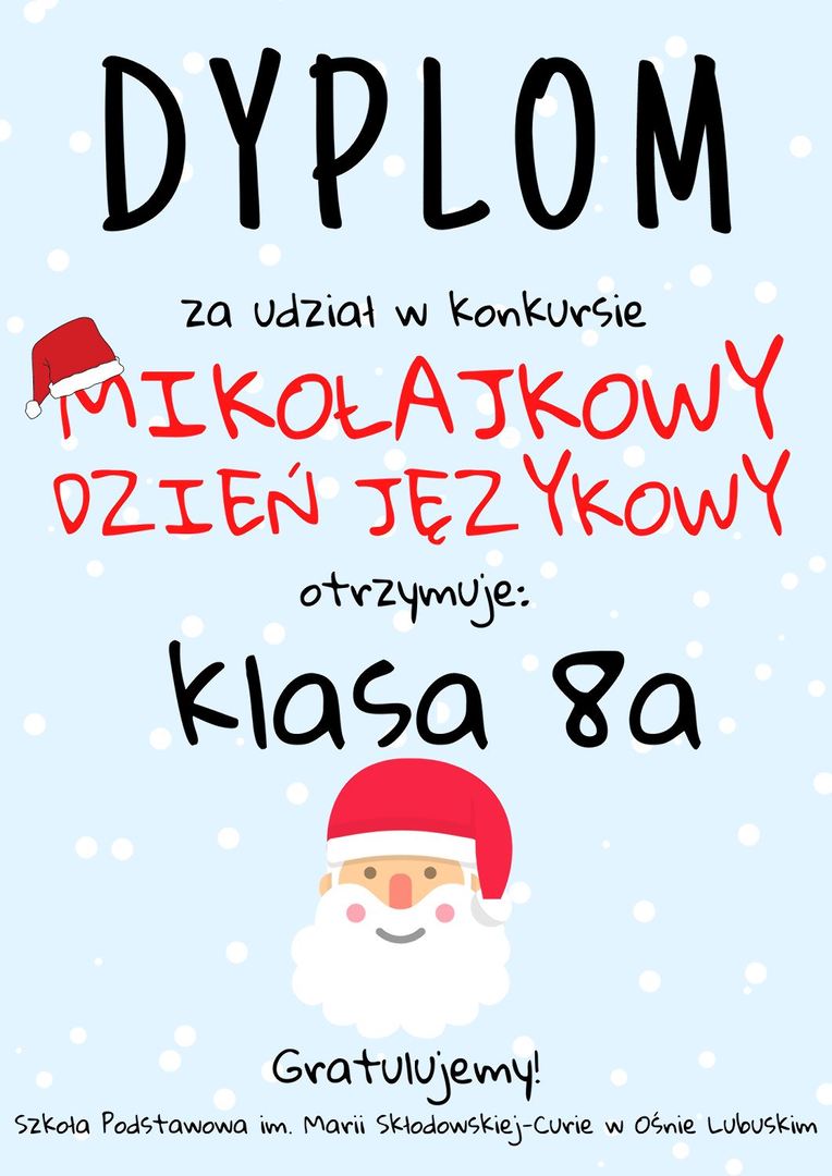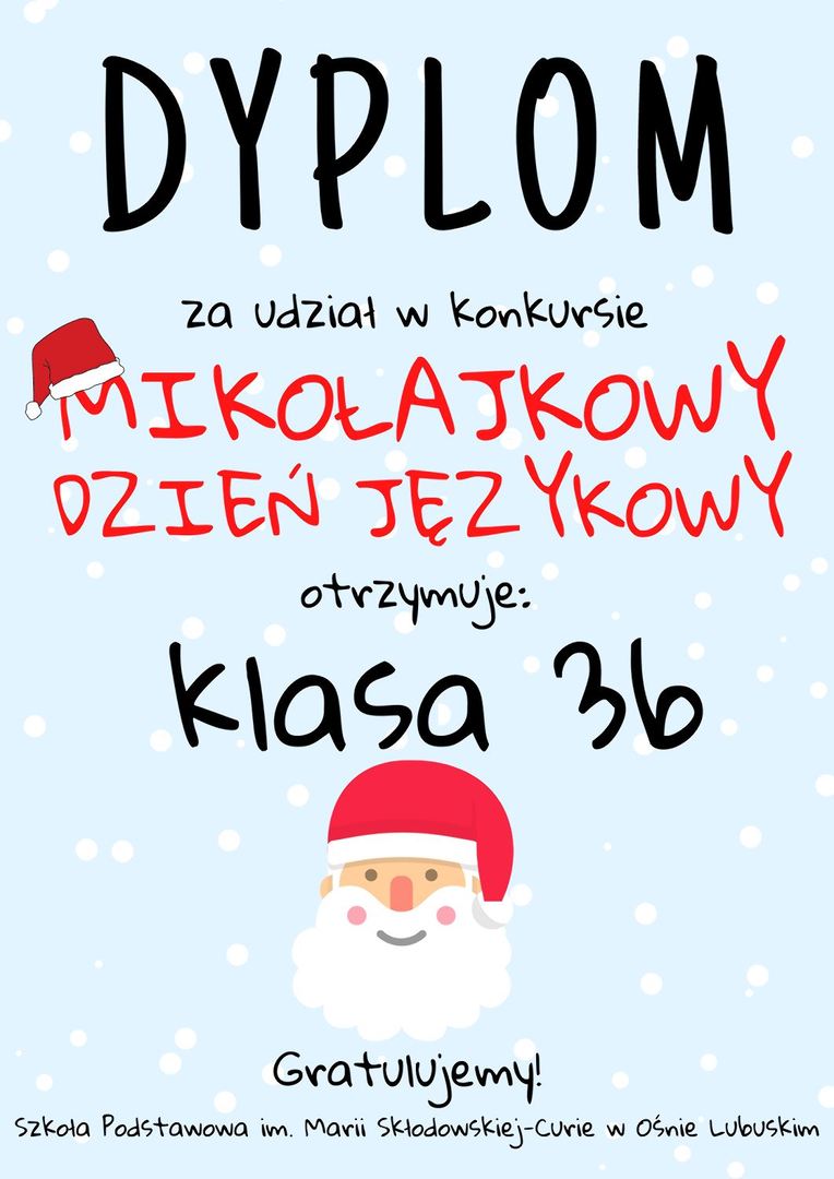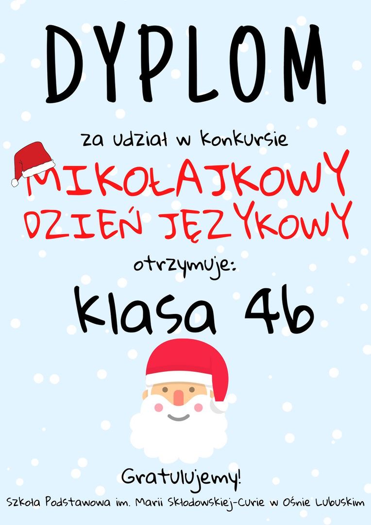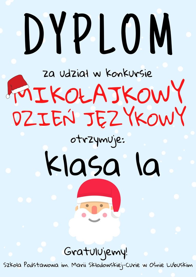 W ramach obchodów Międzynarodowego Dnia Języków Obcych zorganizowano w naszej szkole konkurs „Mikołajkowy Dzień Językowy”. Każda klasa otrzymała specjalną kartę konkursową w klimacie mikołajkowym z różnymi zadaniami w języku angielskim lub niemiecki. Uczniowie ochoczo zabrali się do pracy i podjęli się wyzwania. Komisja zebrała i sprawdziła karty. Nagrodzone zostały najlepiej i najbardziej kreatywnie wykonane prace. Dzieci z klas młodszych wygrały słodkości, a starsi uczniowie zdobyli punkty z zachowania. Nagrodzone klasy otrzymały również pamiątkowe dyplomy.