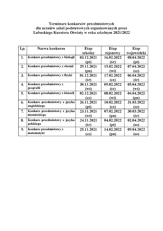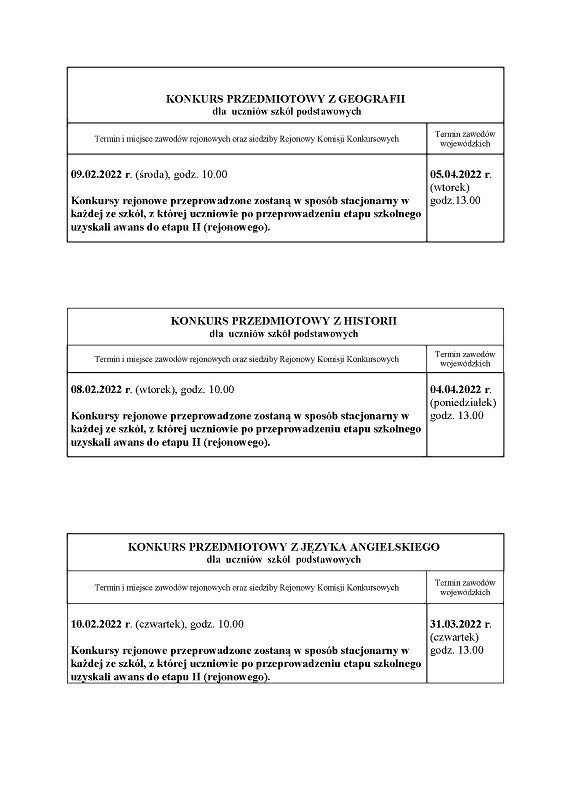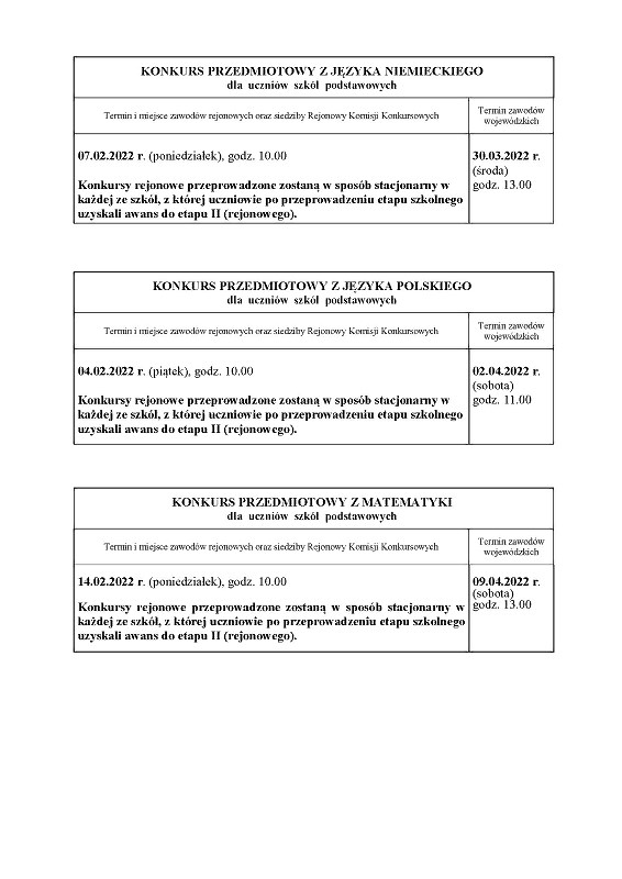 Dostosowując warunki przeprowadzania Wojewódzkich Konkursów Przedmiotowych w roku szkolnym 2021/2022, konkursy rejonowe przeprowadzone zostaną w sposób stacjonarny w każdej ze szkół, z której uczniowie po przeprowadzeniu etapu szkolnego uzyskali awans do etapu II (rejonowego). Zmieniamy godziny rozpoczęcia wszystkich konkursów, ustalając dla etapu II jednolitą godzinę na 10.00. Dodatkowo zmieniamy dzień przeprowadzenia Konkursu przedmiotowego z języka polskiego z dnia 5 lutego (sobota) na dzień 4 lutego (piątek). W załączeniu zmienione wskazania do przeprowadzenia etapu II (rejonowego) dotyczące miejsca i godziny oraz w przypadku języka polskiego dodatkowo daty.