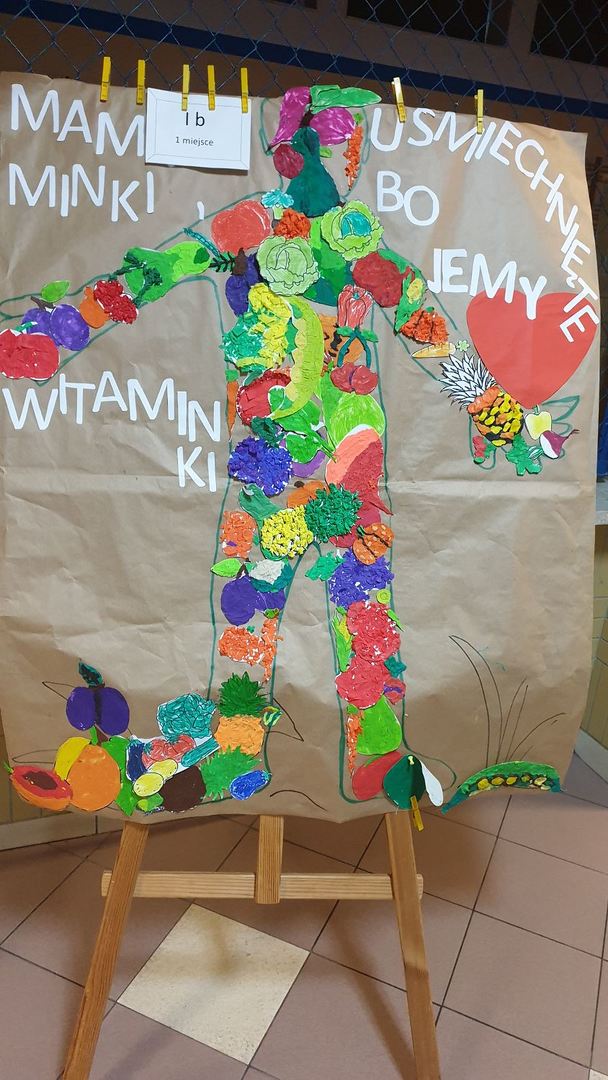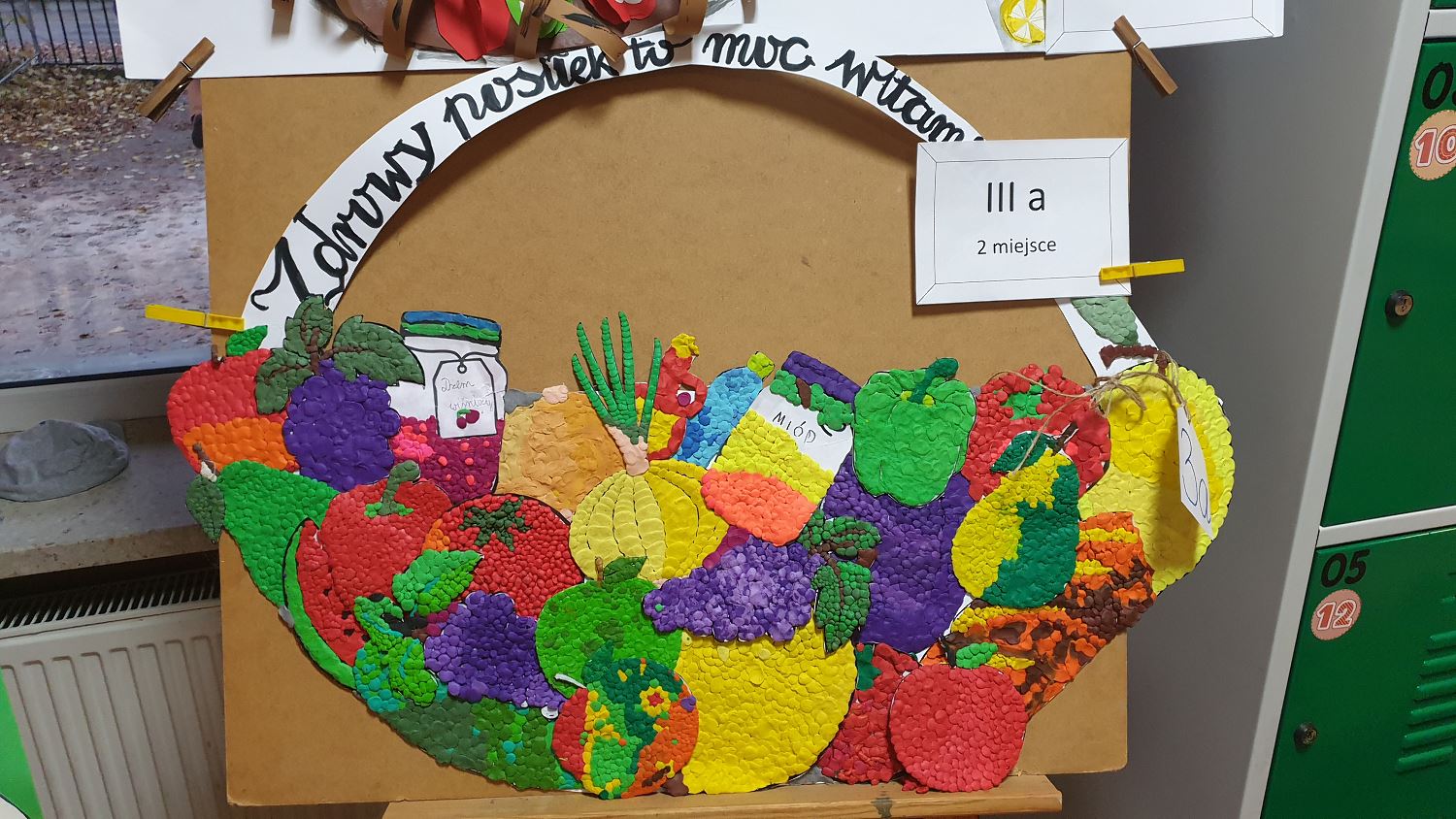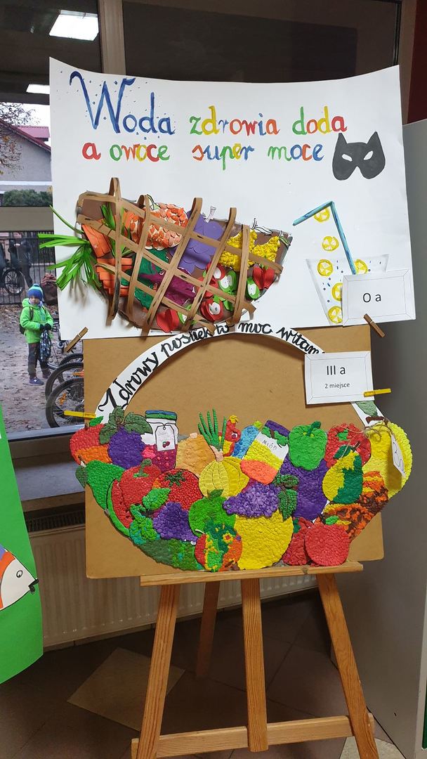 Wszystkim uczestnikom konkursu serdecznie gratulujemy pomysłowości! Nagrody w postaci zdrowych i smacznych owoców zostały wręczone po ogłoszeniu wyników konkursu. Serdeczne podziękowania dla Rady Rodziców za ufundowanie smakowitych nagród. Dobra informacja dla młodych adeptów sztuki zdrowego odżywiania się jest taka, iż klasowe prace zostały wyeksponowane na holu szkolnym. Niechaj staną się one inspiracją i zachętą dla wszystkich do zdrowego odżywiania się. A hasła przewodnie „Żyjemy zdrowo, bo jemy kolorowo”, „Mamy minki uśmiechnięte, bo jemy witaminki”, „Zdrowy posiłek to moc witamin” niech nas prowadzą przez życie!