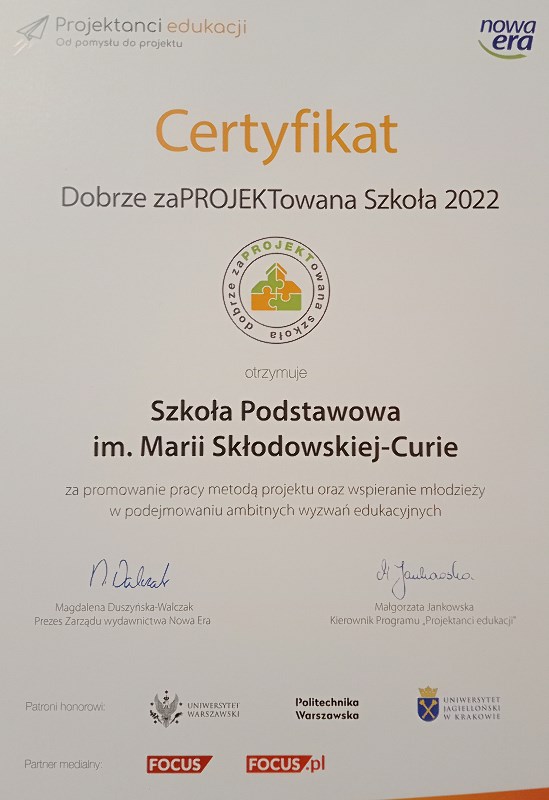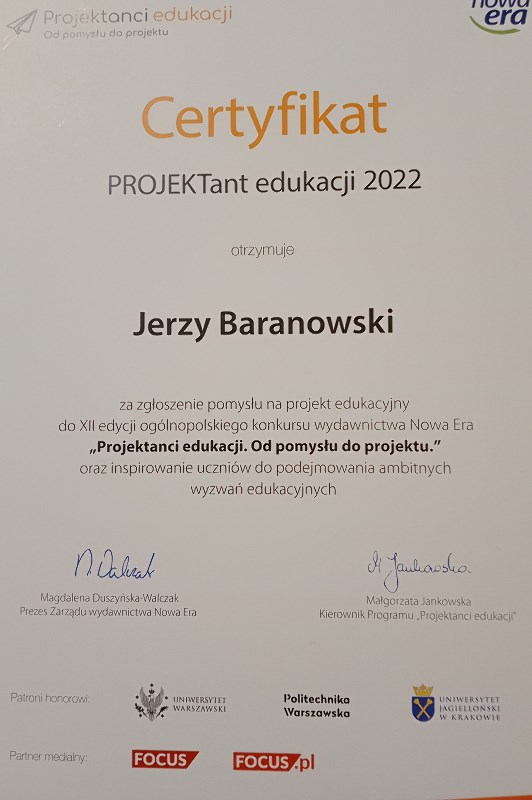 W grudniu 2021 r. nasza szkoła brała udział w Ogólnopolskim Konkursie Projektanci Edukacji skierowanym do uczniów zainteresowanych astronomią, fizyką i matematyką. Do konkursu został zgłoszony „Projekt ścieżki dydaktycznej – Model Układu Słonecznego”, którego autorem był Pan Jerzy Baranowski. Niestety projekt nie otrzymał wystarczającej liczby głosów, jednak Pan J. Baranowski otrzymał Certyfikat Projektant Edukacji 2022 za zgłoszenie pomysłu na projekt edukacyjny do XII edycji ogólnopolskiego konkursu wydawnictwa Nowa Era oraz inspirowanie uczniów do podejmowania ambitnych wyzwań edukacyjnych. Natomiast szkole za promowanie pracy metodą projektu przyznano Certyfikat Dobrze Zaprojektowana Szkoła 2022.