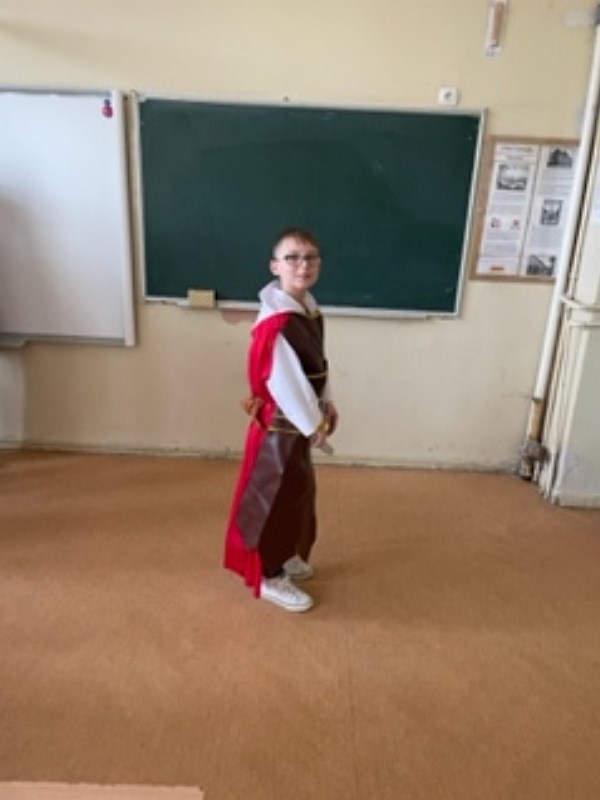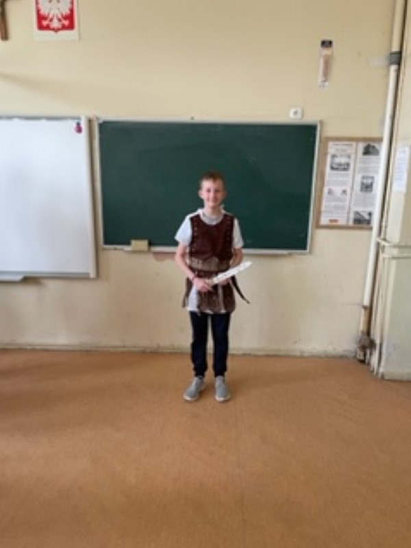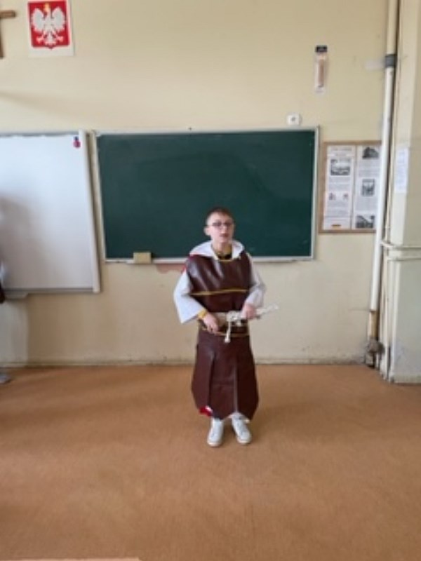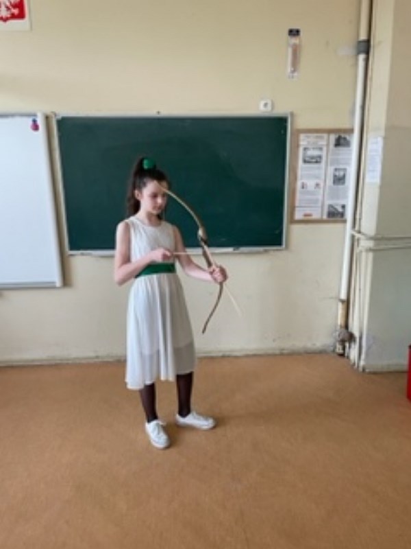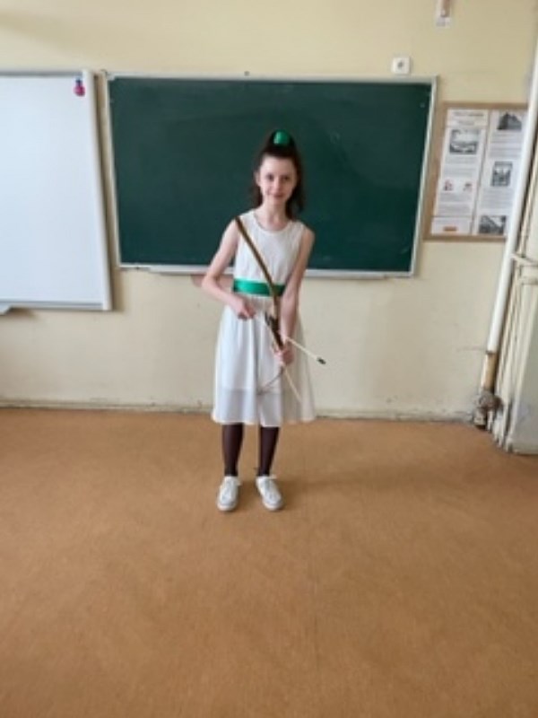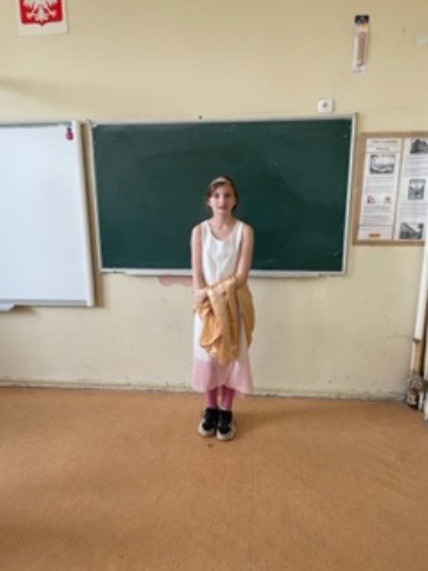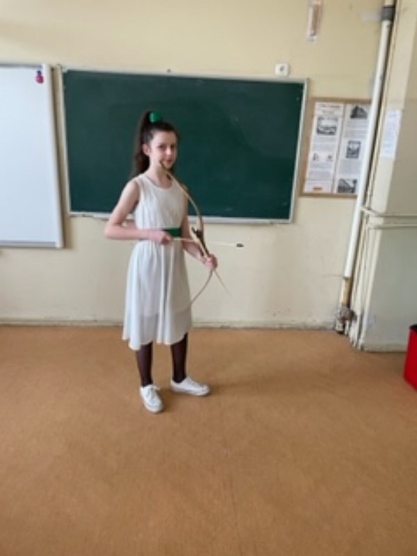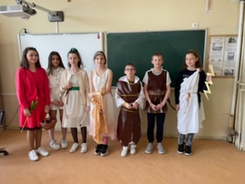 Uczniowie klasy 5a od kilku dni na lekcjach polskiego analizują informacje dotyczące mitów greckich. Uzupełniają i rozszerzają wiedzę zdobytą już na historii. Nie od dziś wiadomo, że w głowach i w pamięci najlepiej zostają wiadomości zdobyte w trakcie ćwiczeń, doświadczeń , zajęć praktycznych, więc i tym razem dla utrwalenia cech oraz atrybutów olimpijskich bogów uczniowie mieli za zadanie przebrać się za nich. Każdy wybierał dowolną postać spośród mieszkańców Olimpu. Mógł , tworząc własną kreację, wykorzystać ich wizerunki przedstawione na ilustracjach w podręczniku albo w innych źródłach. Stroje miały być wykonane z dostępnych w domu rzeczy, miały poruszyć uczniowską inwencję, a nie naruszać domowych budżetów. Okazało się, że prześcieradła, sznurki, folia aluminiowa, wstążki , itp. znakomicie zdały egzamin w roli greckich strojów. Przebrania były wspaniałe, można było oczami wyobraźni przenieść się do starożytnej Grecji. Jedyne ziarenko goryczy , które wkradło się w tę „podróż” , to fakt, że wielu uczniów nie wykonało zadania, a potem żałowało, że stracili szansę na szóstkę z polskiego.