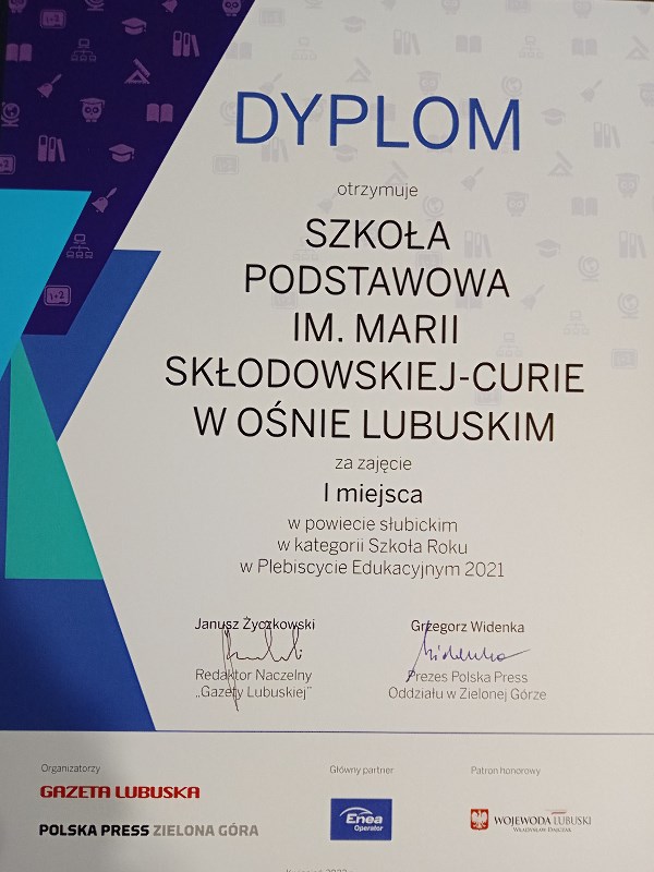 8 kwietnia 2022 r. w Sulechowskim Domu Kultury odbyła się gala Plebiscytu Edukacyjnego 2021, którego organizatorami byli Gazeta Lubuska oraz Polska Press Zielona Góra. W czasie uroczystości wręczono nagrody i wyróżnienia dla nauczycieli, którzy cieszą autorytetem i sympatią zarówno uczniów jak i rodziców. Nagrodzone zostały również przedszkola, szkoły i uczelnie wyróżniające się realizacją ścieżki edukacyjnej. Dyplom otrzymała również Szkoła Podstawowa im. Marii Skłodowskiej – Curie w Ośnie Lubuskim za zajęcie I miejsca w powiecie słubickim w kategorii Szkoła Roku.