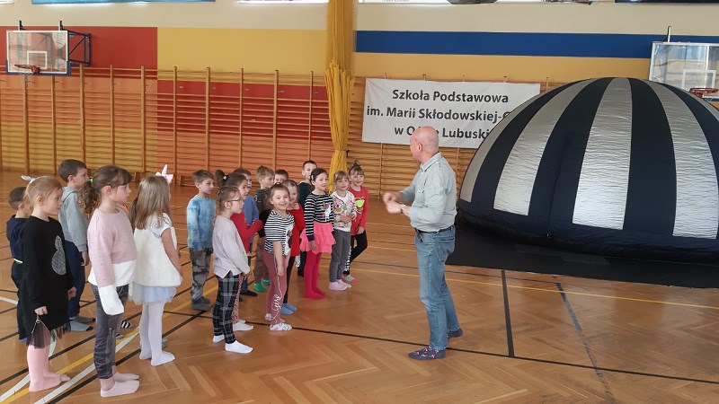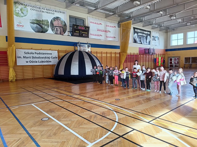 Kino sferyczne zawitało do Ośna Lubuskiego. Fantastyczna przygoda ,która wywołała dreszczyk emocji na skórze każdego dziecka. Kopuła, która została rozłożona ciekawiła i fascynowała. Nadszedł w końcu wyczekiwany moment i mogliśmy wejść do środka kapsuły. W związku z faktem ,że tego dnia był Dzień Drzewa, wybraliśmy taki tytuł bajki. Za pomocą magicznej różdżki zmniejszyliśmy się, by przenieść się do jego wnętrza . Teraz mogliśmy razem z głównymi bohaterami bajki edukacyjnej poruszać się razem z wodą pobieraną przez korzenie. Dzieci, poznały mechanizmy zachodzące w środku i już wiedzą ,że pod żadnym pozorem nie wolno nam niszczyć przyrody.