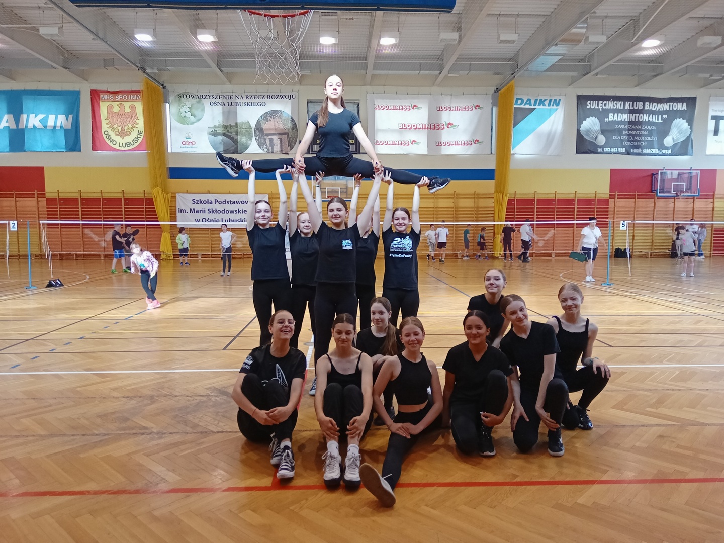 Od pierwszych minut turnieju na hali panowała sportowa i radosna atmosfera. Najbardziej podekscytowani byli najmłodsi zawodnicy, którzy z niecierpliwością oczekiwali na swoją kolej. Spotkanie rozpoczęliśmy pamiątkowym zdjęciem, a następnie swój debiutancki występ miała szkolna grupa cheerleaderek. Dziewczyny za swój pokaz otrzymały ogromne brawa od publiczności.