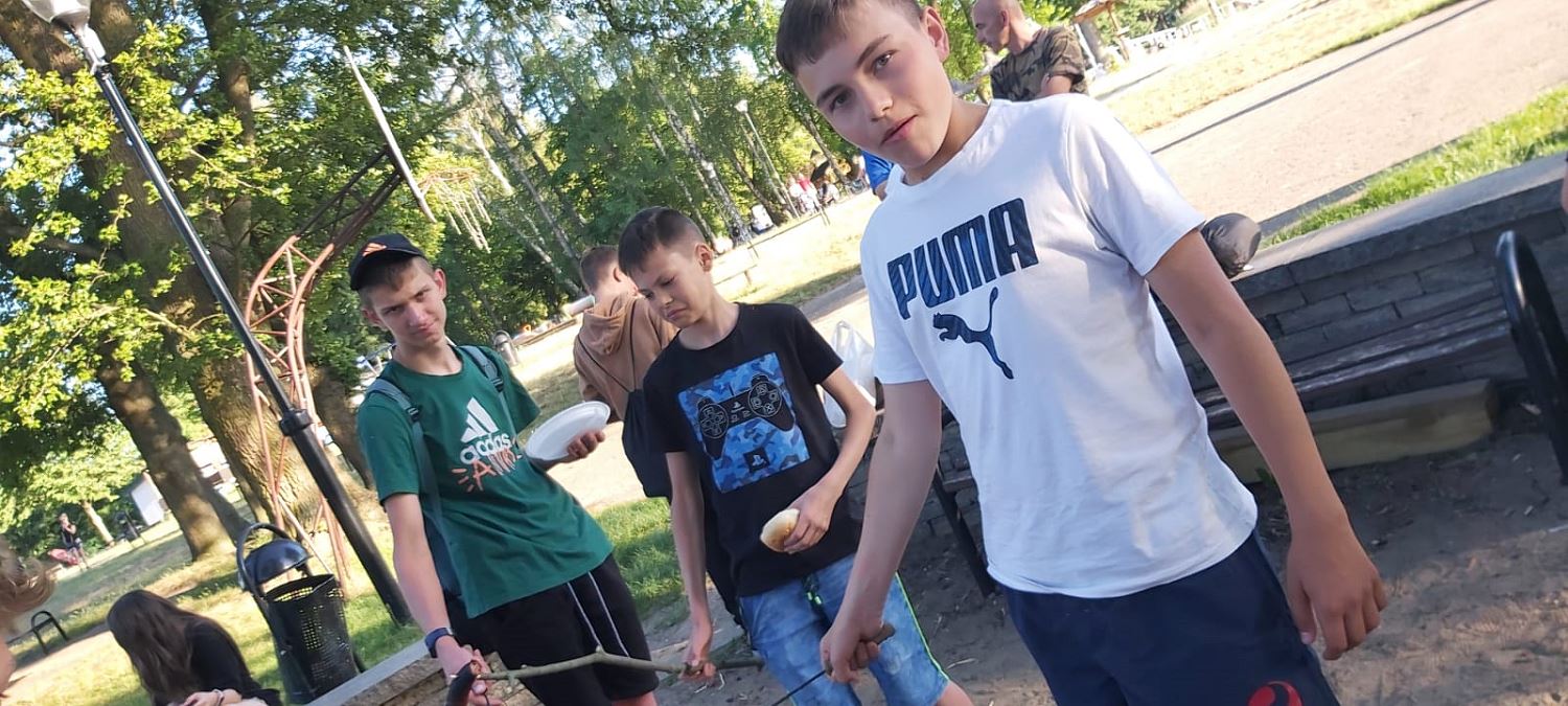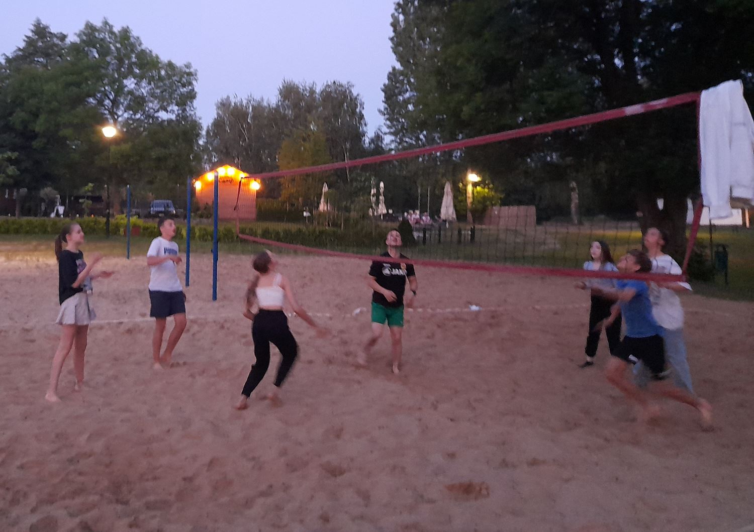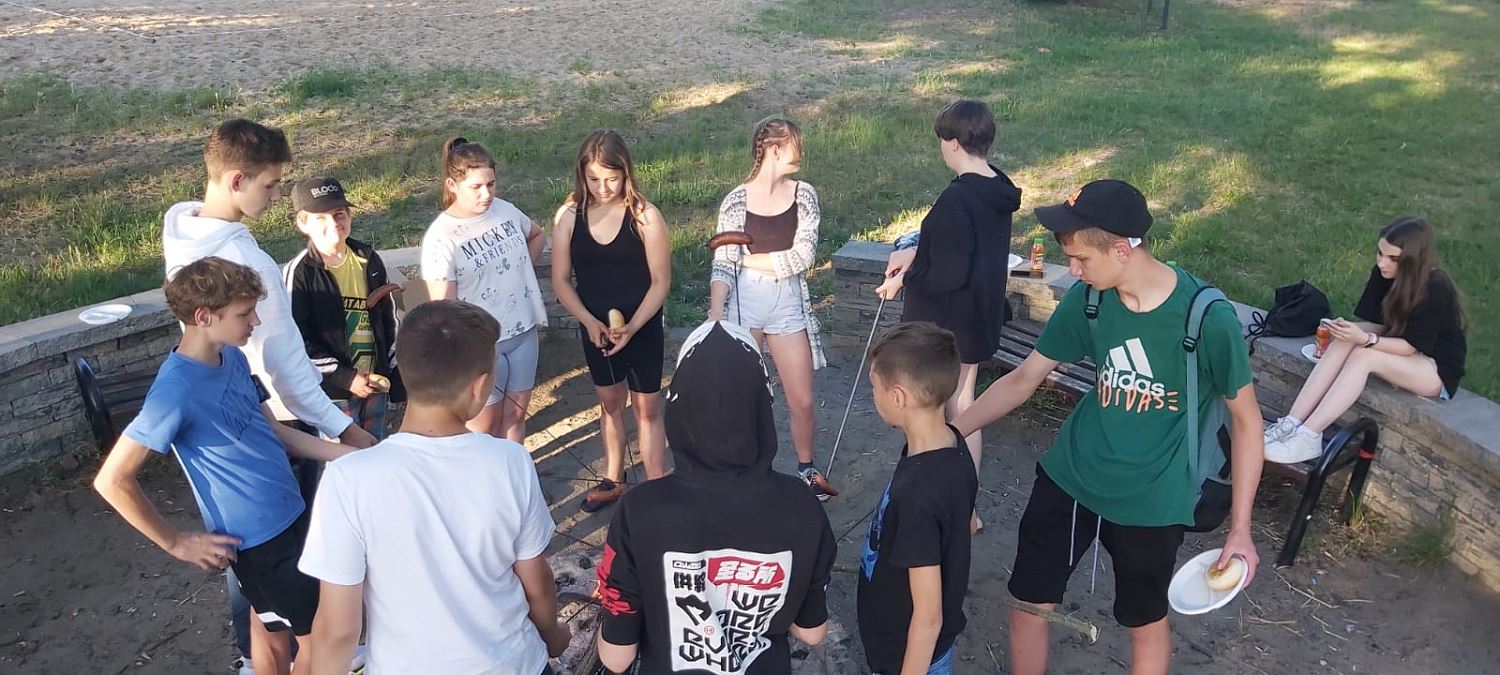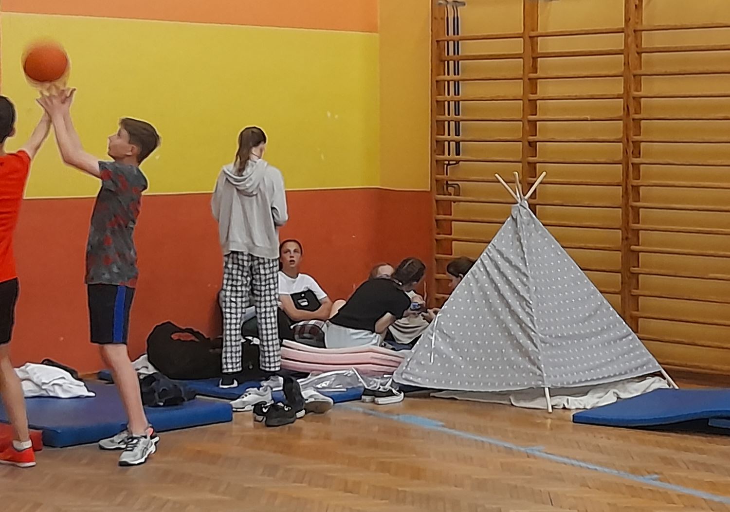W dniu 10 czerwca 2022r klasa VII A uczestniczyła w tzw. „nocowaniu w szkole”. Zaczęliśmy od ogniska nad jeziorem Reczynek i pieczenia kiełbasek. Potem, aby jedzonko „dobrze się ułożyło” większość grupy uprawiała konkurencje sportowe na siłowni, spacerowała lub grała w piłkę siatkową i koszykówkę pod czujnym okiem pana Łukasza. Kiedy słoneczko skryło się za horyzontem nastąpił moment powrotu do szkoły i rozpoczęła się właściwa, długo wyczekiwana część imprezy. Uczniowie mieli okazję obejrzenia szeregu filmów, a w przerwach ćwiczyli elementy gry i rzuty do kosza. Jak w prawdziwym kinie można było pochrupać popcorn, a zamiast pepsi (która jak wiadomo jest znakomitym rozpuszczalnikiem i odrdzewiaczem) popijaliśmy dużo zdrowszą lemoniadę pani Uli. Kilkoro uczestników grało zawzięcie w „Mafię”, ćwicząc przy tym logiczne myślenie. Przy okazji można było ze zdziwieniem zaobserwować, jak wcześnie wschodzi Słońce (wtedy kiedy najczęściej przewracamy się na drugi bok). Imprezę możemy uznać za bardzo udaną, myślę, że wielu uczniom (jeśli nie wszystkim) bardziej podobały się nocne zajęcia niż dzienne. Dziękuję serdecznie w imieniu Dzieci i swoim za pomoc, bez której ta akcja nie byłaby taka udana: Rodzicom z trójki klasowej, pani Urszuli Urbaniak i panu Łukaszowi Wit.