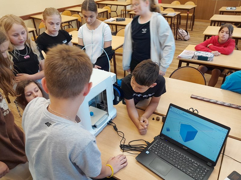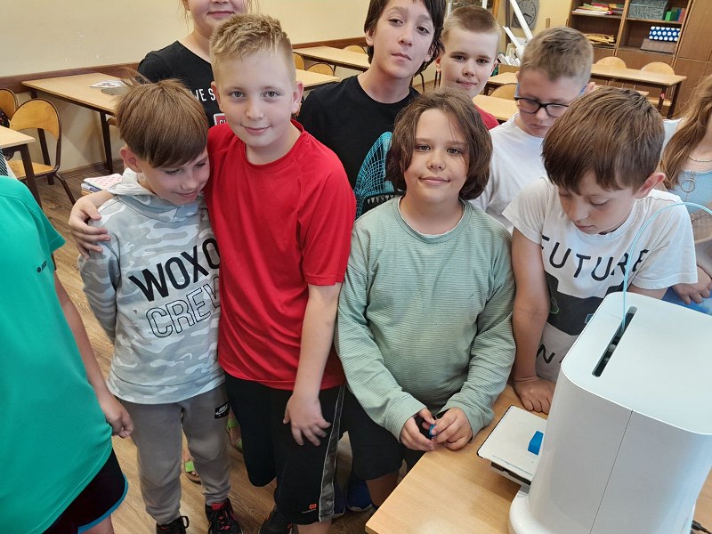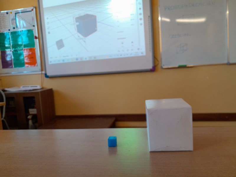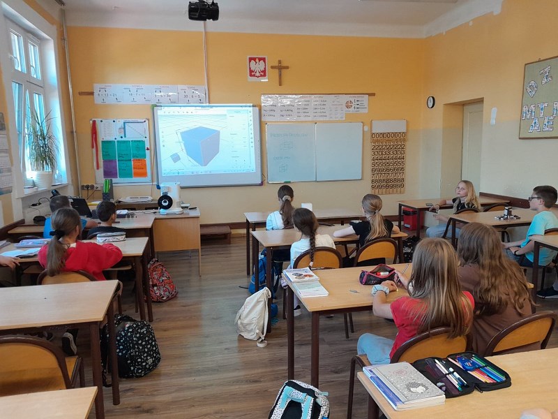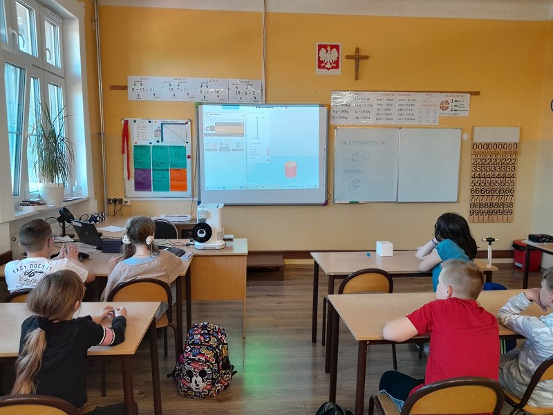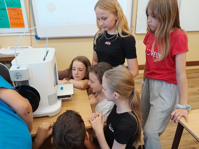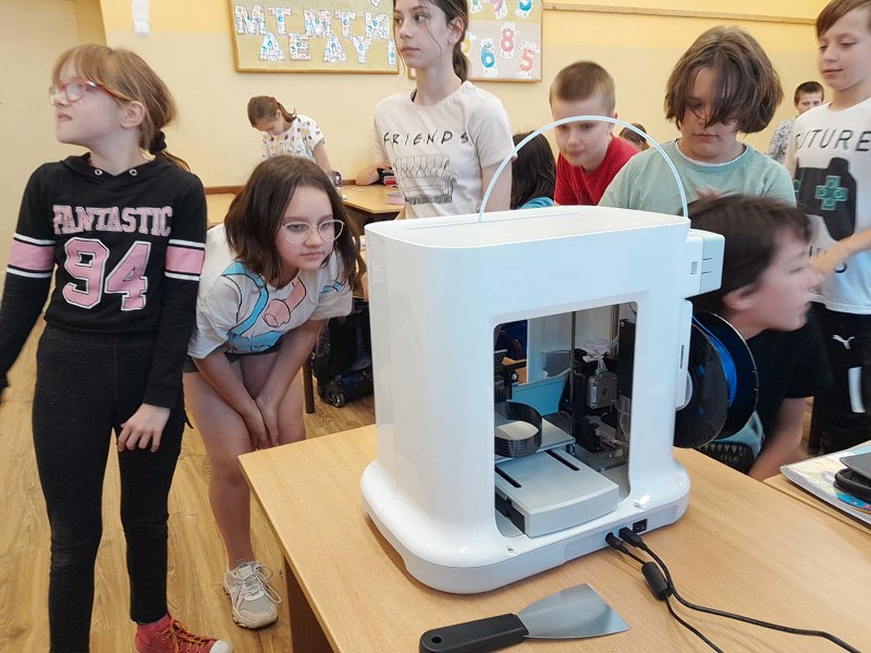 Uczniowie klasy 4a i 4b poznają aktualnie na matematyce bryły. W trakcie ostatniej lekcji dzieci mogły zaobserwować różnice między figurami płaskimi, a bryłami dzięki drukarce 3D. Najpierw wspólnie przygotowaliśmy projekty w specjalnym programie. Jednym z nich był model sześcianu, który utworzyliśmy na wzór tego znajdującego się w klasie, tylko że w skali 1:5. Dzięki temu uczniowie utrwalili sobie jednostki długości oraz pojęcie skali. Następnie bacznie obserwowaliśmy drukarkę w trakcie jej pracy. W efekcie końcowym udało nam się wydrukować kilka brył. Ponadto oczywiście omówiliśmy różne zastosowania drukarek 3D. Przeprowadzone lekcje miały charakter otwarty, dzięki czemu inni nauczycieli mogli uczestniczyć w zajęciach, obserwować nasze poczynania oraz zdobywać nowe doświadczenia.