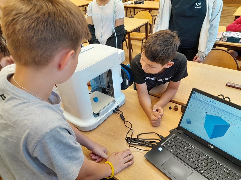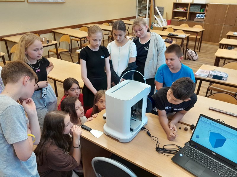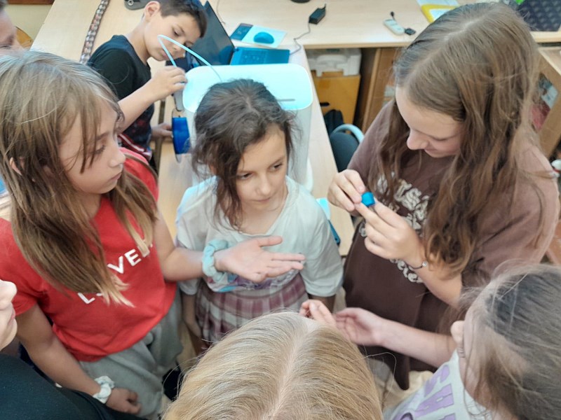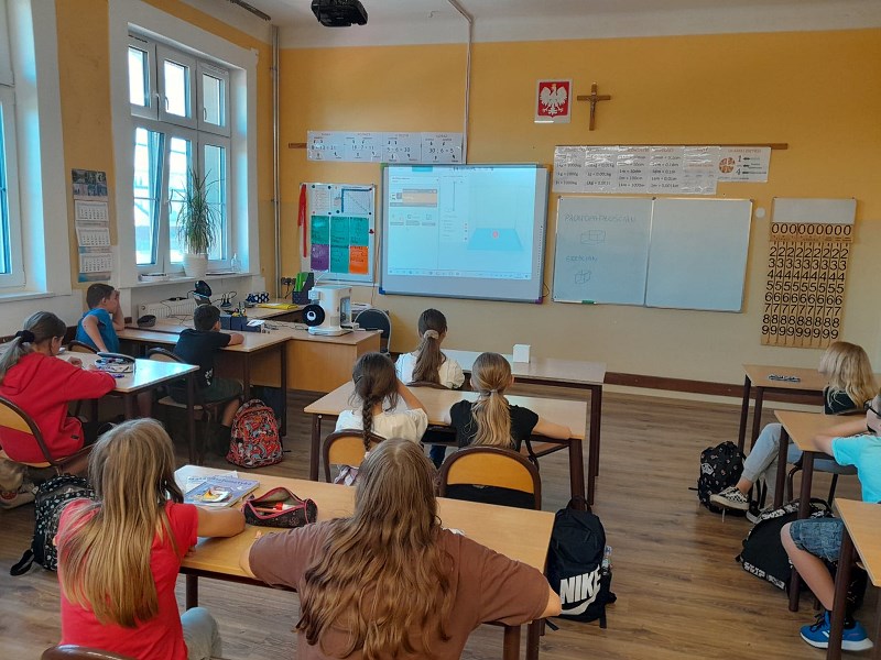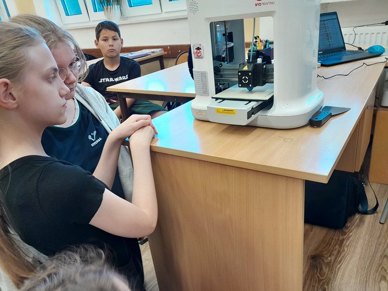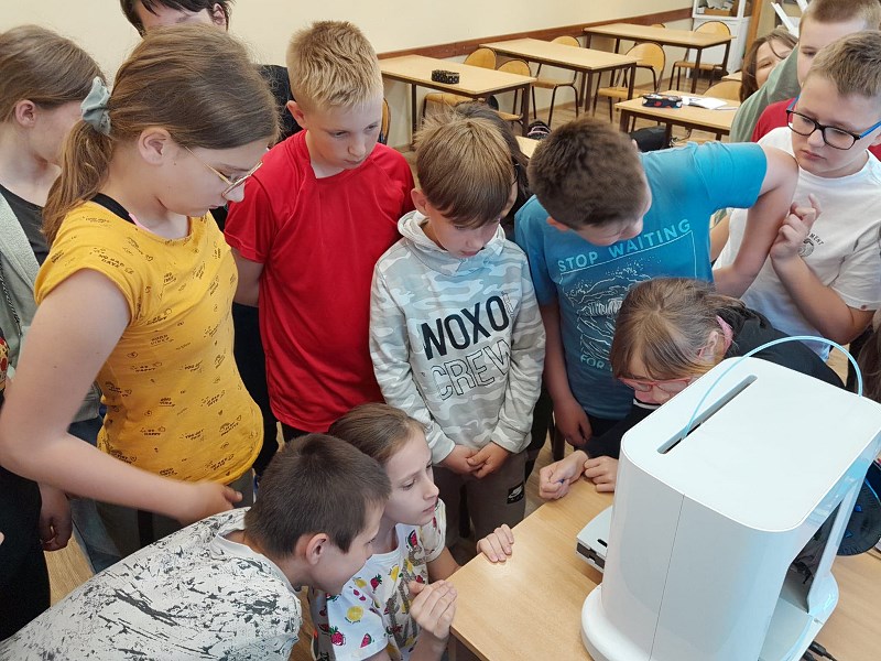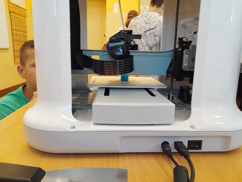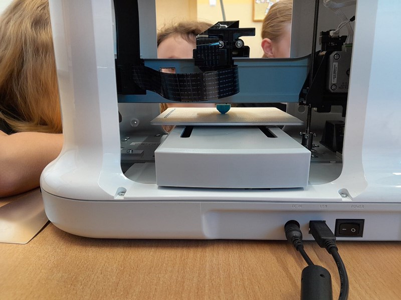 Uczniowie klasy 4a i 4b poznają aktualnie na matematyce bryły. W trakcie ostatniej lekcji dzieci mogły zaobserwować różnice między figurami płaskimi, a bryłami dzięki drukarce 3D. Najpierw wspólnie przygotowaliśmy projekty w specjalnym programie. Jednym z nich był model sześcianu, który utworzyliśmy na wzór tego znajdującego się w klasie, tylko że w skali 1:5. Dzięki temu uczniowie utrwalili sobie jednostki długości oraz pojęcie skali. Następnie bacznie obserwowaliśmy drukarkę w trakcie jej pracy. W efekcie końcowym udało nam się wydrukować kilka brył. Ponadto oczywiście omówiliśmy różne zastosowania drukarek 3D. Przeprowadzone lekcje miały charakter otwarty, dzięki czemu inni nauczycieli mogli uczestniczyć w zajęciach, obserwować nasze poczynania oraz zdobywać nowe doświadczenia.