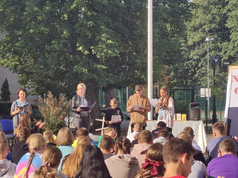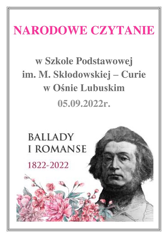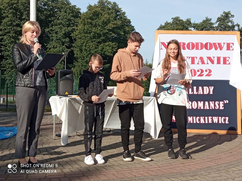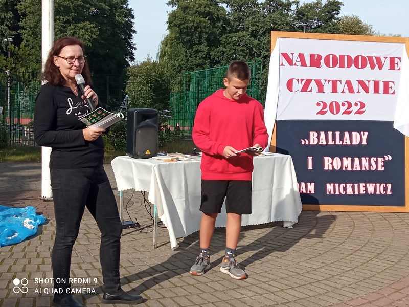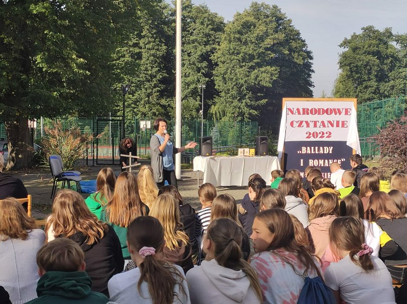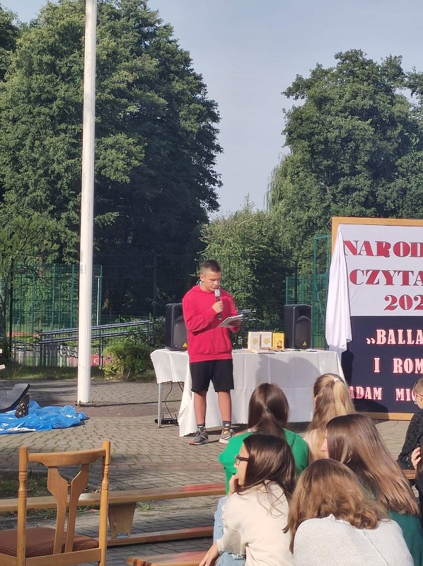 Zgodnie z tegorocznym założeniem czytane były Mickiewiczowskie „Ballady i romanse”, dlatego 05.09.2022r. w scenerii rodem znad jeziora Świteź na placu przed szkołą usłyszeć można było strofy „Romantyczności”, „Świtezianki” czy „Pani Twardowskiej”. Teksty romantycznego poety nie należą do najłatwiejszych, ale na pewno zachwycają magią języka, plastycznością opisów i niezwykłością zawartych w treści zdarzeń. Słuchając ballad, nikt nie miał wątpliwości, że Karusia widziała ducha ukochanego Jasia, nie miał współczucia dla strzelca, który tak szybko zapomniał o obietnicy wiecznej miłości oraz cieszył się z przebiegłości czarnoksiężnika Twardowskiego.