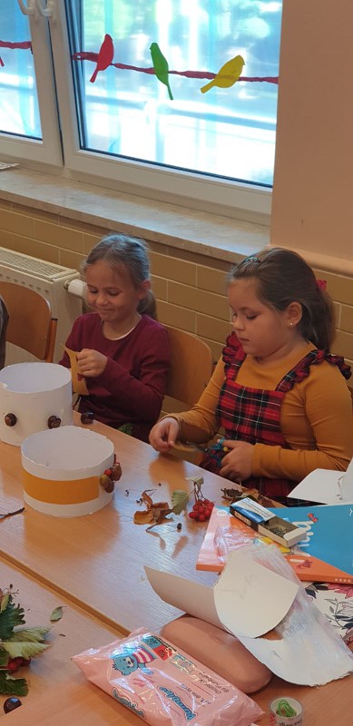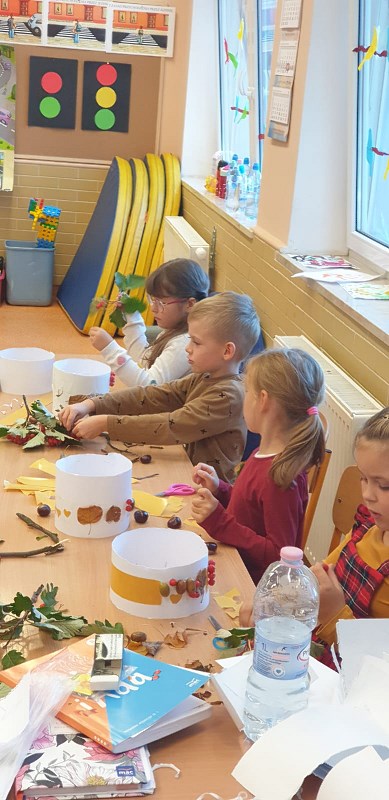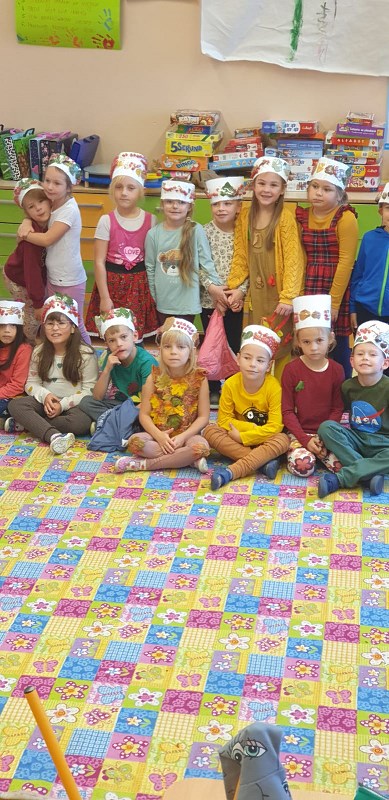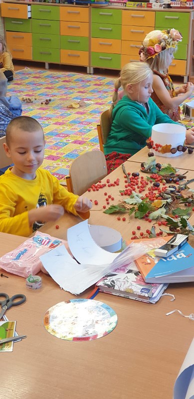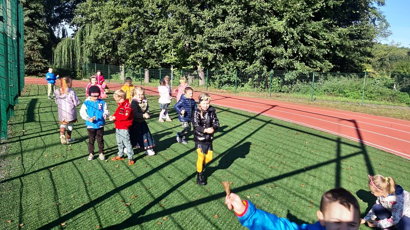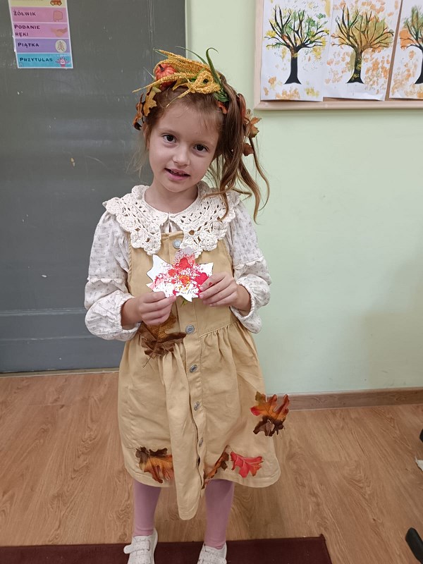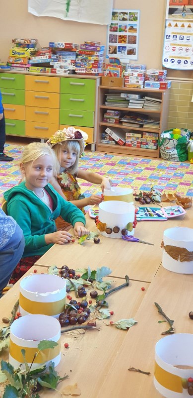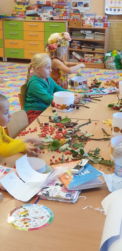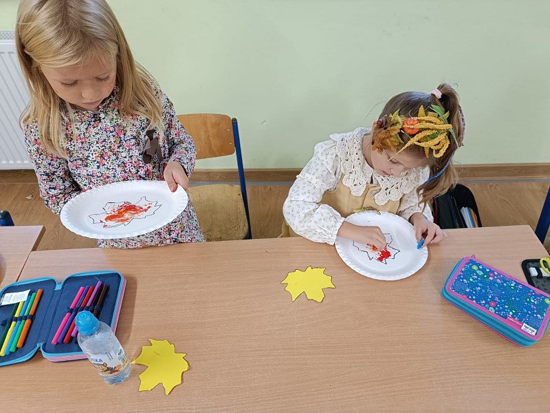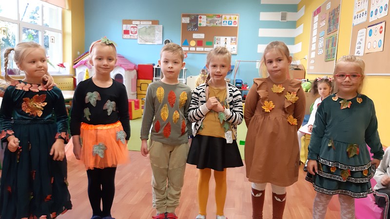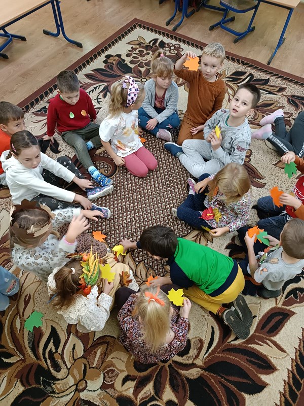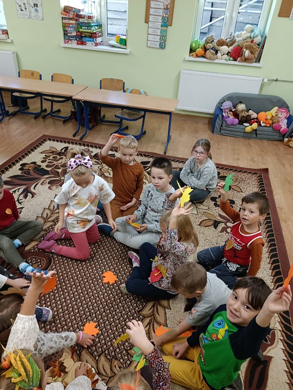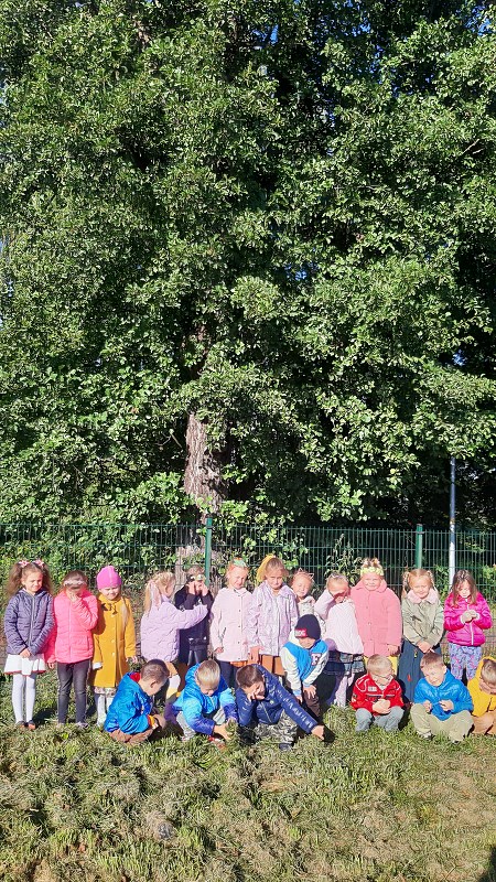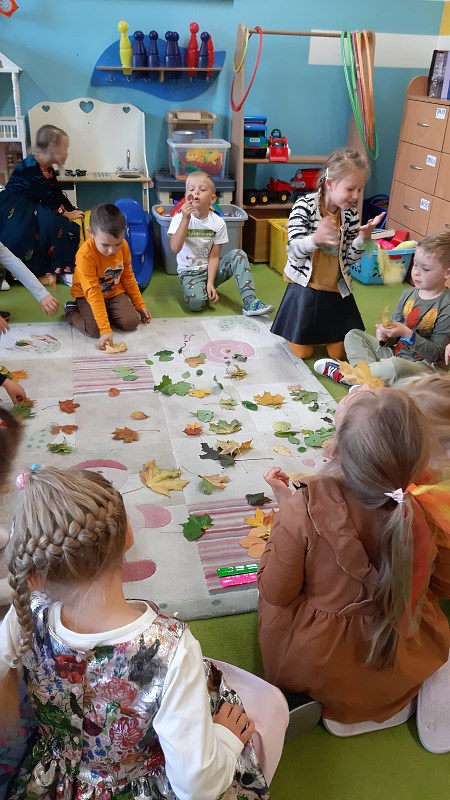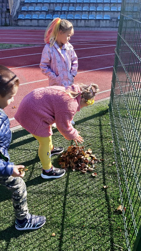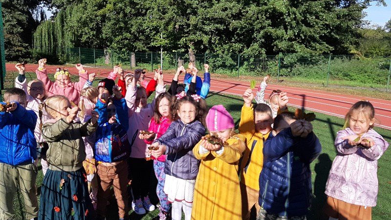 Dzieci poznały rożne gatunki drzew i oglądały ich liście i owoce, poznały fakturę liści i nazywały ich jesienne barwy. Każde z nich wylepiało lub kolorowało swój listek. Niektóre robiły jesienne czapeczki. Jednak najwięcej zabawy było wśród szkolnych drzew, gdzie dzieci zbierały liście i tworzyły z nich domek dla jeża.