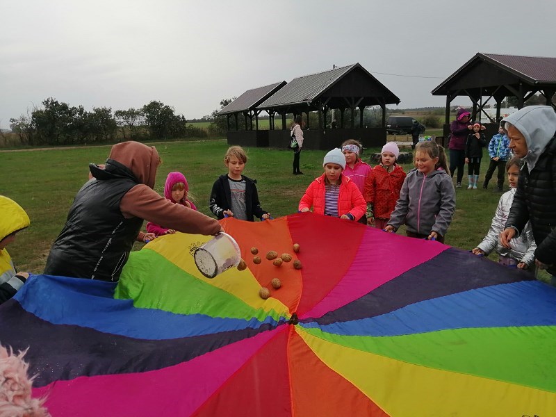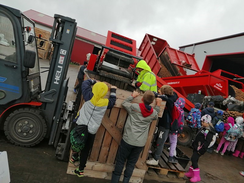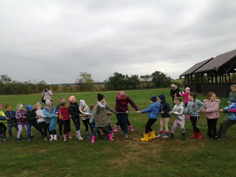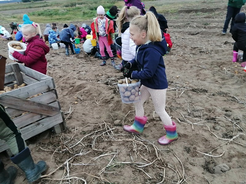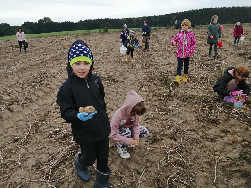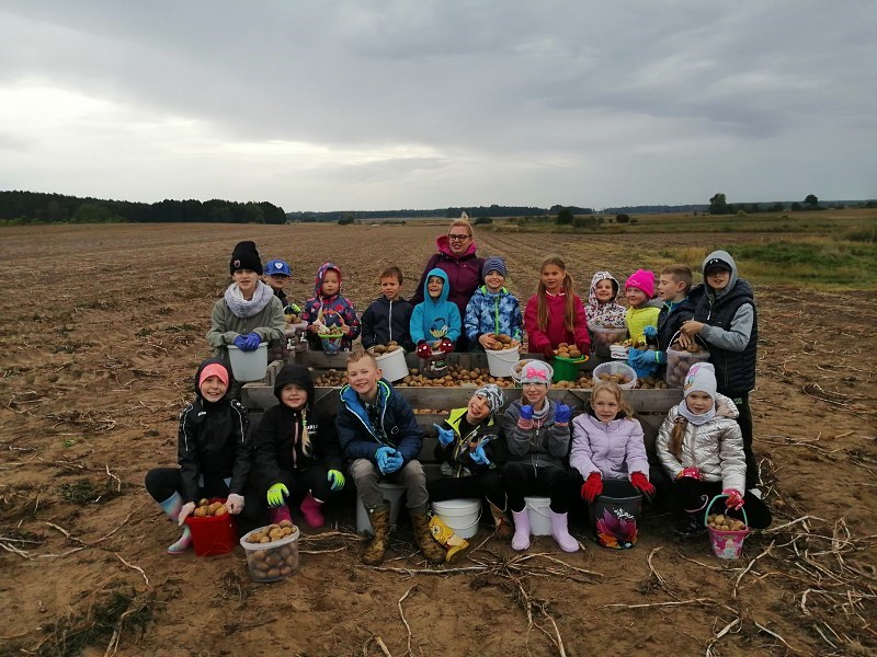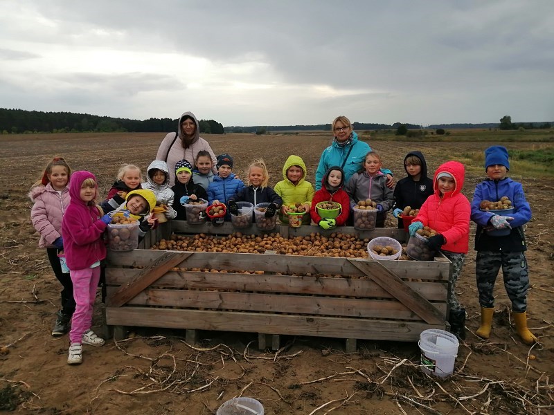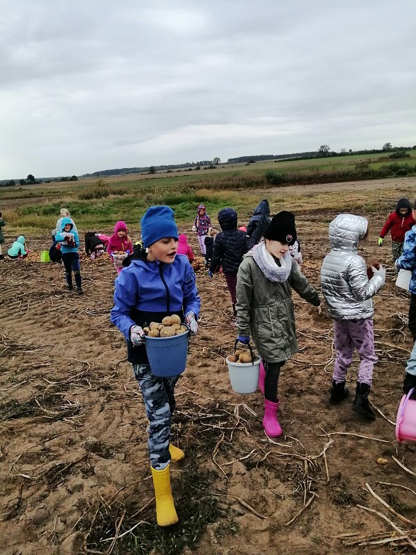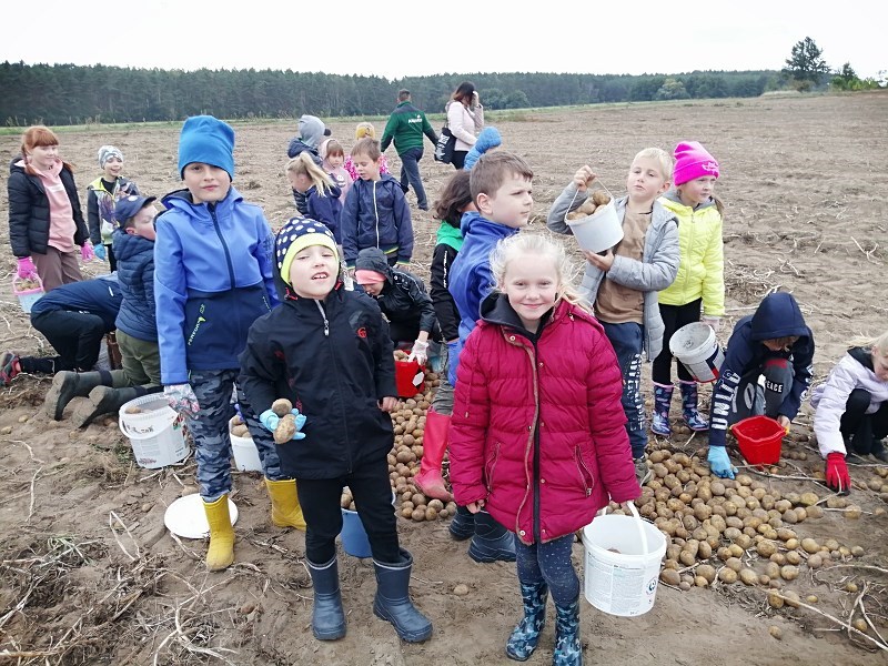 We wrześniu uczniowie klasy II b, II c i III a, wybrali się na jesienne wykopki ziemniaczków. Dzięki uprzejmości i zaangażowaniu państwa Marioli i Radosława Nikodemów dzieci chętnie brały udział w zbieraniu ziemniaków. Jednakże zawody sportowe w przeciąganiu liny ,rzuty ziemniakami do worka i zabawy z chustą animacyjną rozgrzały młodych zbieraczy do czerwoności.