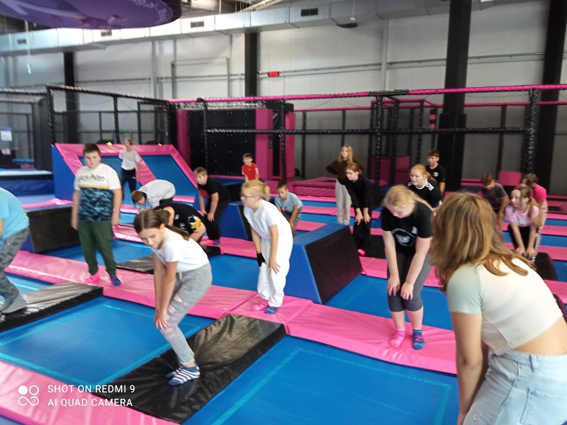 Naszą wycieczkę rozpoczęliśmy w Parku Trampolin. Przed wejściem na główną halę dzieci miały rozgrzewkę pod okiem instruktora. Pobyt w parku trampolin okazał się dla uczniów świetną zabawą. Uświadomił im także, że skoki na trampolinie to nie tylko wspaniała zabawa, ale również doskonałe ćwiczenie dla naszych mięśni.