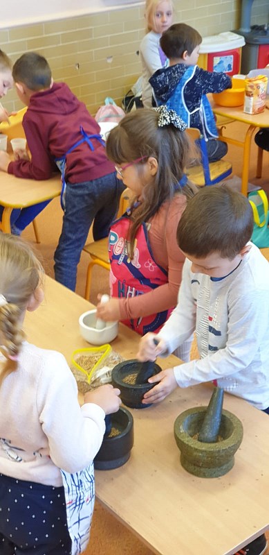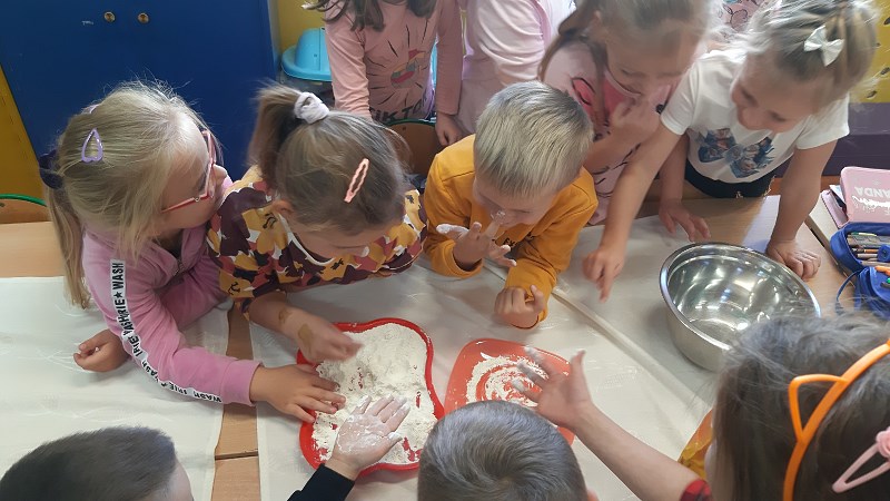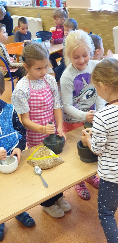 Dzieci zapoznały się z różnymi zbożami, oglądały ziarna, smakowały je, rozgniatały w moździerzach. Maluchy poznały cykl powstawania chleba, który nazwaliśmy " Od ziarenka do bochenka". Dzieci poznały pracę rolnika, młynarza i piekarza. Wielką frajdą były zabawy z mąką. Jeśli mowa o chlebie, to nie mogło zabraknąć wyrabiania ciasta. Na koniec zajęć odbyła się wyczekiwana przez wszystkich degustacja chlebków. Jedliśmy chleb z jabłkiem, z orzechami, z ziemniakami i z cebulką. Mamy przygotowały również przepyszne masełka, które jeszcze bardziej wzbogaciły naszą ucztę.