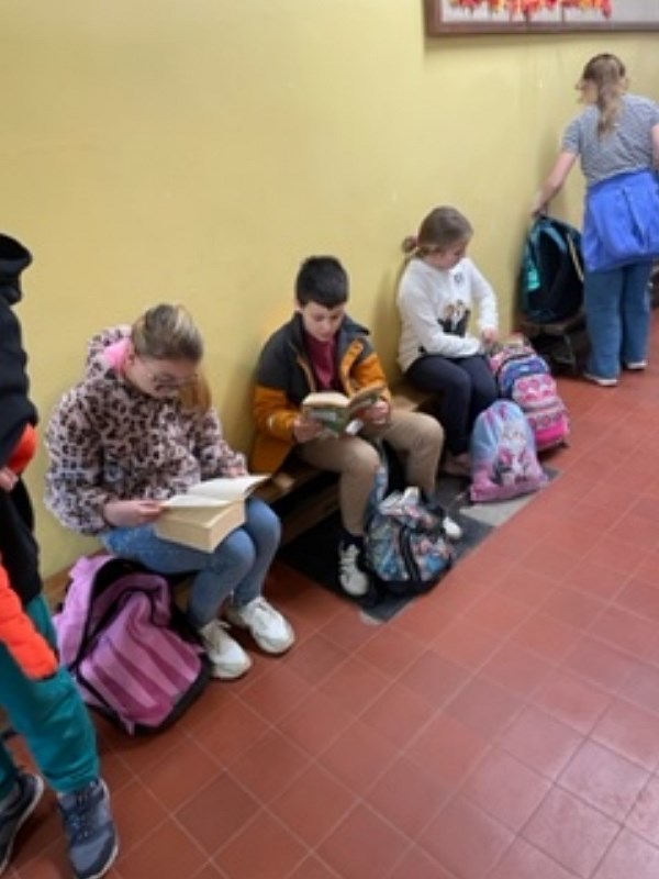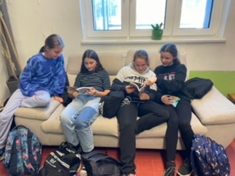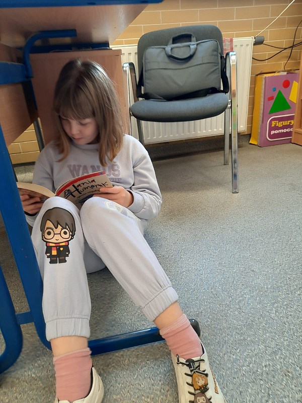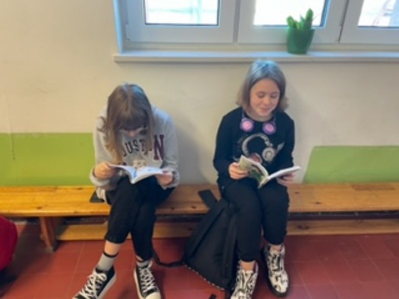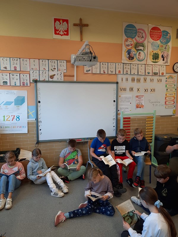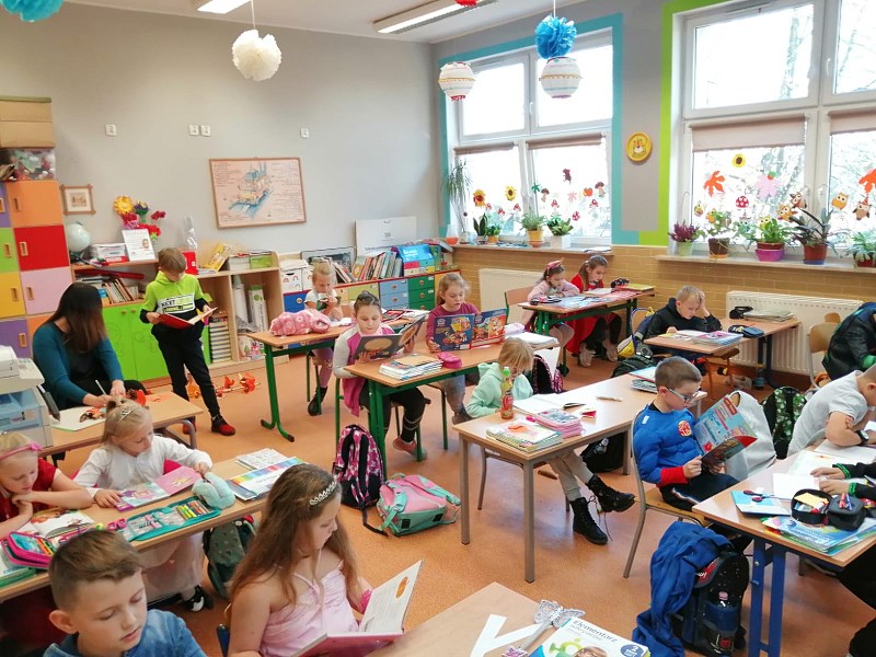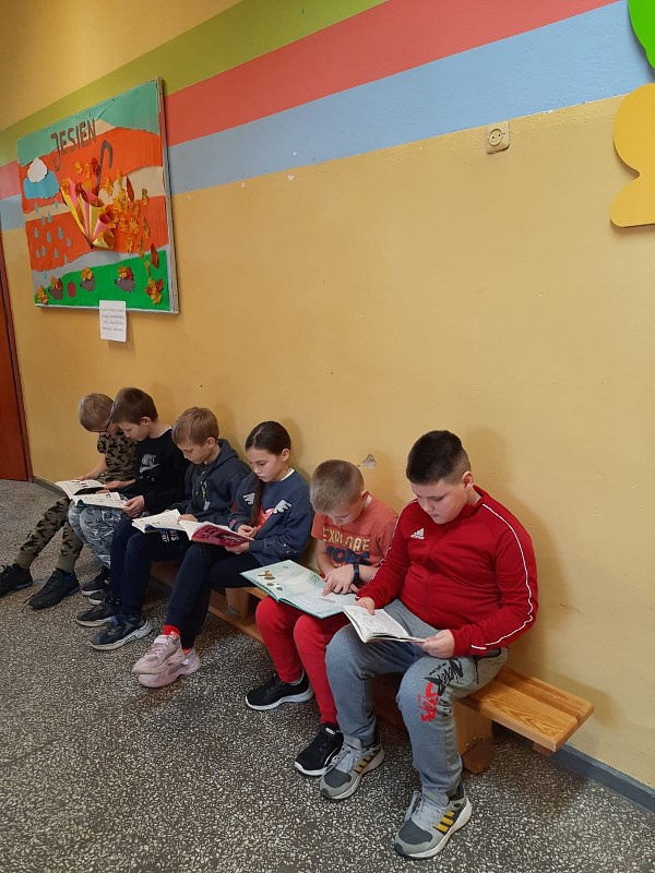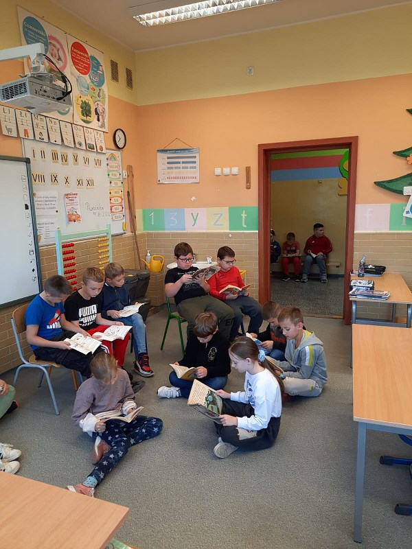 „Przerwa na czytanie była też świetną okazją do odwiedzenia szkolnej biblioteki, w której także został pobity rekord frekwencji. Przychodzili uczniowie indywidualnie, ale przyszła również cała klasa IIc. ,Ze swoją pierwszą wizytą do czytelni przybyli „ Podróżnicy” z zerówki, którzy tak się ucieszyli na widok różnych książek i książeczek, że postanowili wypożyczyć sobie po jednej do domu, co w szkolnej praktyce jest ewenementem, gdyż zazwyczaj pierwsze wypożyczenia zdarzają się pod koniec klasy pierwszej, gdy dzieci już samodzielnie czytają. Ale…może stanie się to nową tradycją. Podsumowując, można stwierdzić, że czytanie wśród uczniów ma się dobrze, choć niewątpliwie zdecydowanie lepiej wygląda to w klasach najmłodszych niż w najstarszych (widocznie starsi mają trochę inne zainteresowania), jednak nie musimy się martwić, że książki przestaną nam być potrzebne. Dlatego też szkoła dba o to, by w bibliotece było co czytać i kupuje nie tylko lektury, ale także nowości. Książki czekają na swoich czytelników.