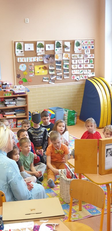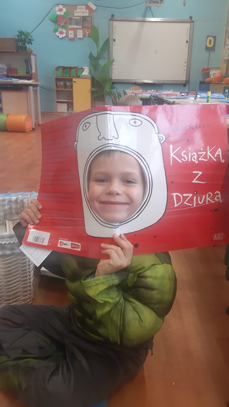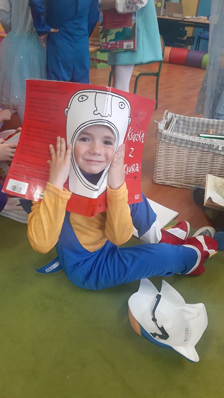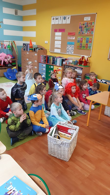 Skoro mowa o bajkach, to tego dnia naszymi gośćmi były Panie bibliotekarki z Miejskiej Biblioteki - Pani Kasia i Pani Patrycja. Panie ubrane w piękne, bajkowe stroje, przyniosły kosze pełne przepięknych książek, które nasze zerowiaki oglądały z wielkim zaciekawieniem. Niektóre książki były malutkie, inne sporych rozmiarów, były komiksy i książki do kolorowania, była nawet książka z dziurą. Każde dziecko otrzymało Kartę Małego Czytelnika oraz zakładkę do książki.