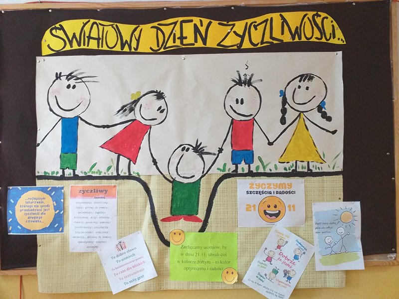 21 listopada obchodzony jest Światowy Dzień Życzliwości i Pozdrowień . Jest to okazja, by pomyśleć o tym, co w życiu ważne. Ciepłe słowo, miły gest, uśmiech - to wszystko sprawia, że czujemy się dobrze między ludźmi. Lubimy, gdy otaczają nas przyjaźni ludzie. Pamiętajmy, byśmy i my tacy byli dla innych.
