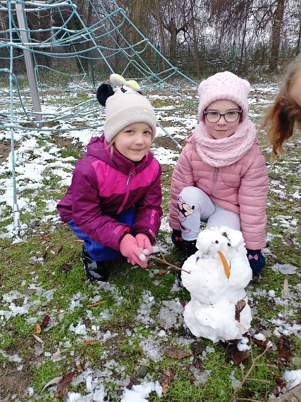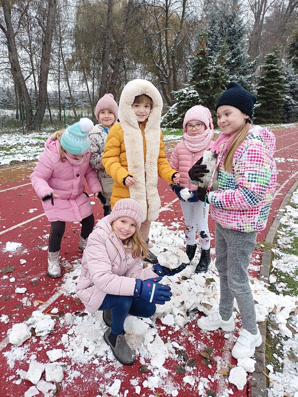 Zima jest porą roku, którą z tęsknotą wyczekują wszystkie dzieci. W tym roku już w listopadzie na kilka dni spadł śnieżny puch. Pierwszaki ubrane w ciepłe kurtki, rękawice, czapki oraz szaliki wyruszyły, by skorzystać z uroków zimowej aury. Zabawom nie było końca. Dzieci wspólnie postanowiły wykonać bałwana. Szybko rozdysponowali zadania i już po chwili miał on wszystkie potrzebne atrybuty. Przy okazji przypomnieliśmy sobie zasady bezpieczeństwa podczas zabawy na śniegu.