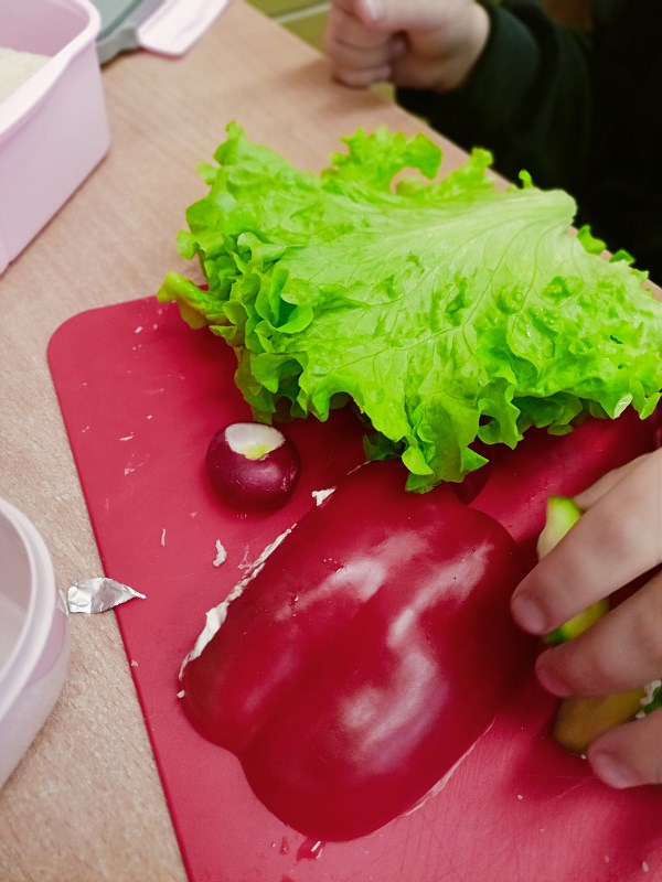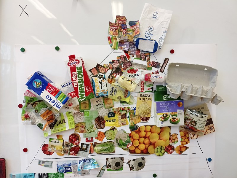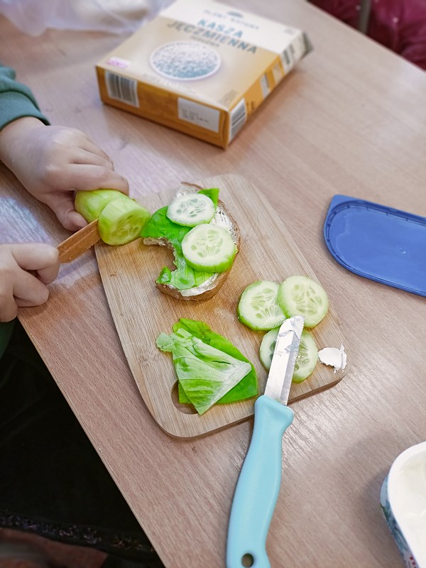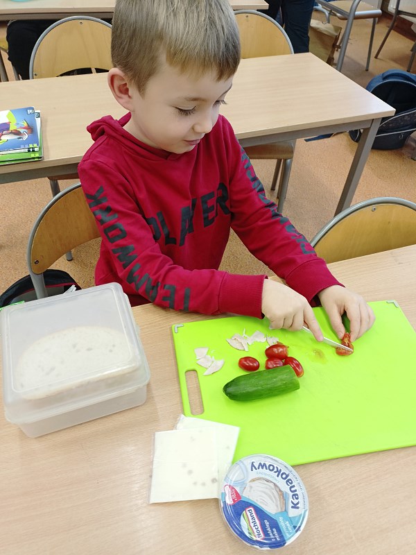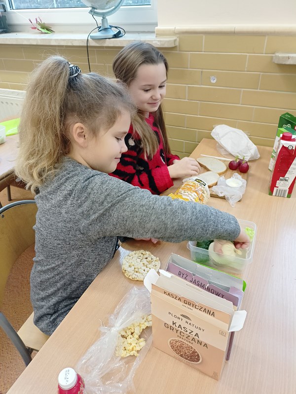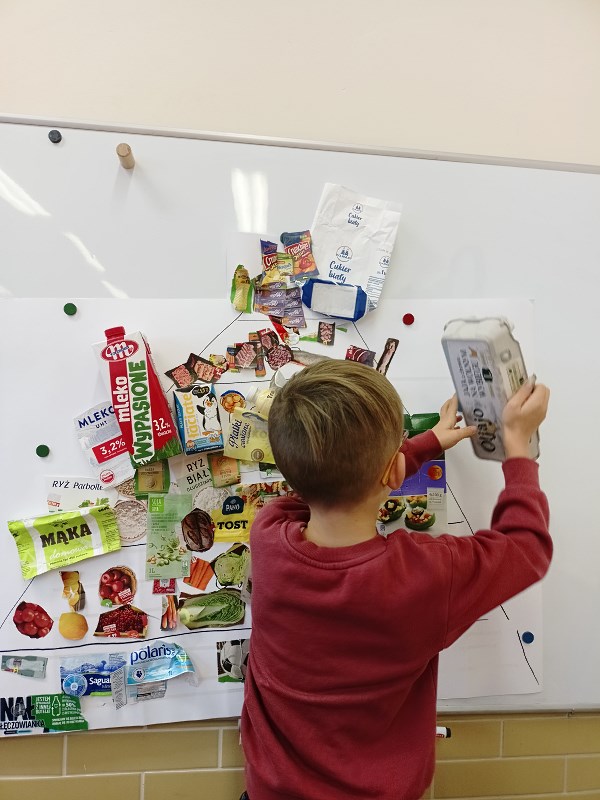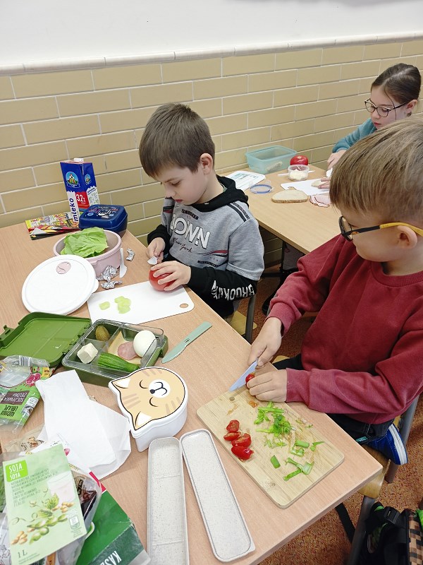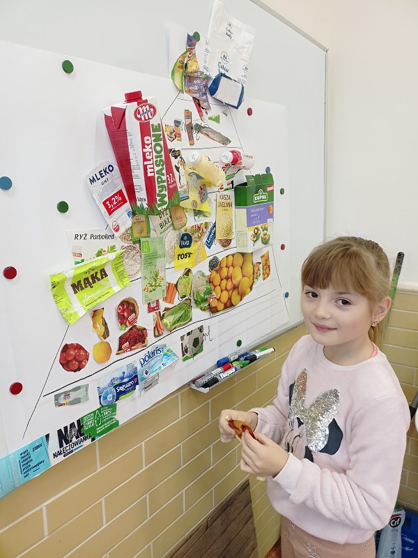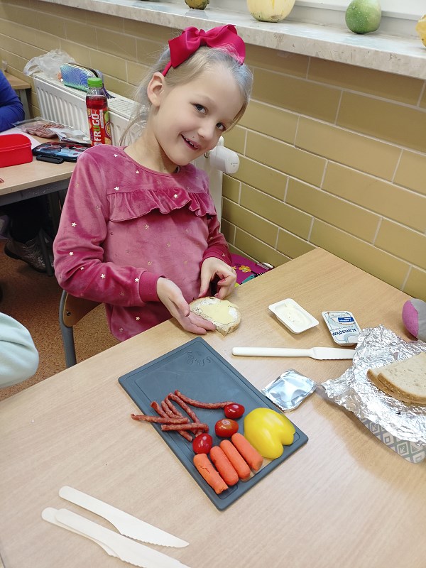Zdrowe żywienie jest bazą do prawidłowego funkcjonowania całego organizmu. Jest to szczególnie ważne w najmłodszych latach. Muszą zostać dostarczone do organizmu wartościowe produkty, które zbudują zdrowe kości, silne mięśnie, prawidłowo funkcjonujący układ odpornościowy. Uczniowie klasy 1a podczas zajęć usystematyzowali wiedzę i stworzyli piramidę żywienia. Wcześniej zgromadzili wiele atrybutów, które pomogły w wykonaniu oryginalnego plakatu. Wśród produktów, które powinniśmy najczęściej spożywać są warzywa i owoce, następnie produkty zbożowe, nabiał, mięso, a najrzadziej słodycze , produkty wysoko przetworzone. Najistotniejszy jest jednak ruch i codzienny, systematyczny wysiłek fizyczny. Uczniowie postanowili pójść tym tropem i przyrządzili przepyszne, kolorowe kanapki, które zawierały wszystkie zdrowe produkty. Tak przygotowany posiłek sprawił, że uczniowie nabrali sił. Dodatkowo usprawnili motorykę małą, która jest tak ważna zwłaszcza na początkowym etapie edukacyjnym. Dodało to wiary w swoje możliwości, motywacji, by samodzielnie przygotowywać w domu posiłek. Po tak zbilansowanym śniadaniu przyszedł czas na zadbanie o sferę fizyczną. Zatem po dokładnym posprzątaniu sali uczniowie wybrali się do sali gimnastycznej, by zadbać o to, co znajduje się na samym dole piramidy żywienia, a więc o sprawność fizyczną.