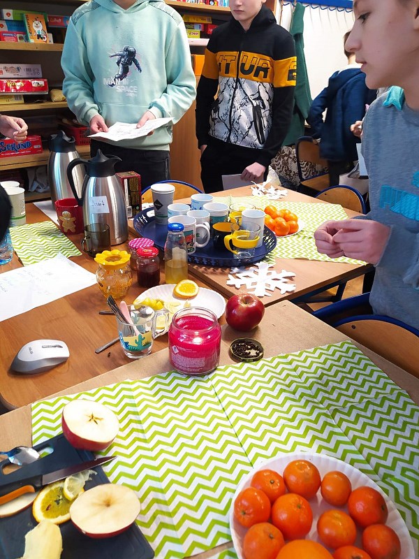 Co prawda Międzynarodowy Dzień Herbaty przypada na 21 maja, jednak nieoficjalnie świętowany jest również 15 grudnia. A że siarczysty mróz za oknem, to p. Ola i p. Ula przygotowały dla uczniów i pracowników szkoły przepyszną herbacianą ucztę. Aromat ciepłej herbatki jak widać przyciągnął wielu smakoszy. Tak więc, oprócz zwykłej czarnej herbaty, była też i malinowa i miętowa, a do każdej z nich zdrowe dodatki, takie jak: cytryna, mandarynka, miód, imbir czy goździki.