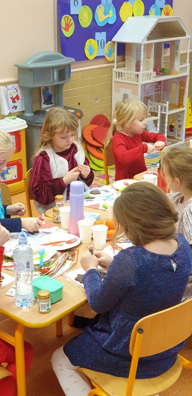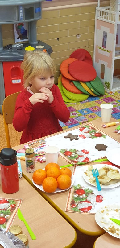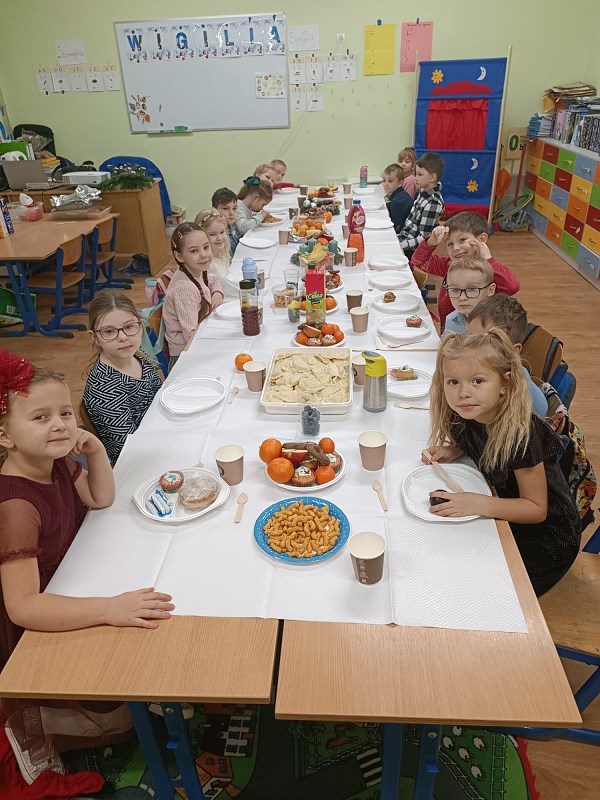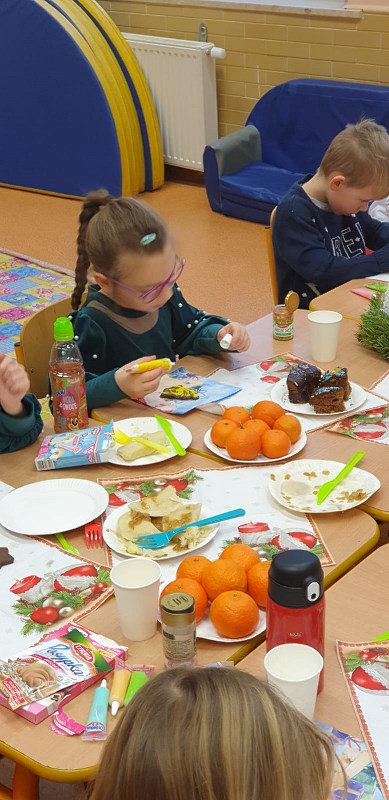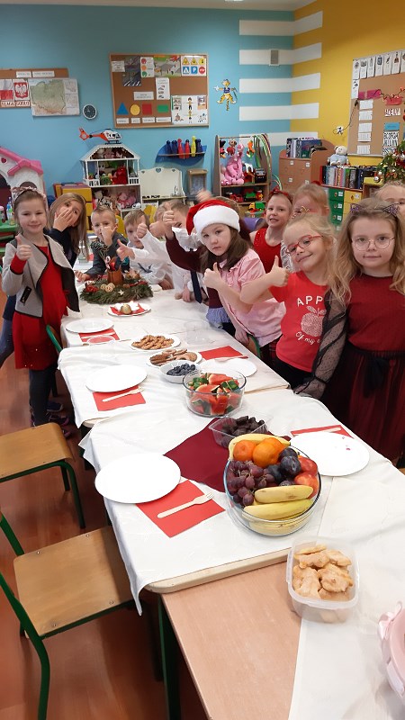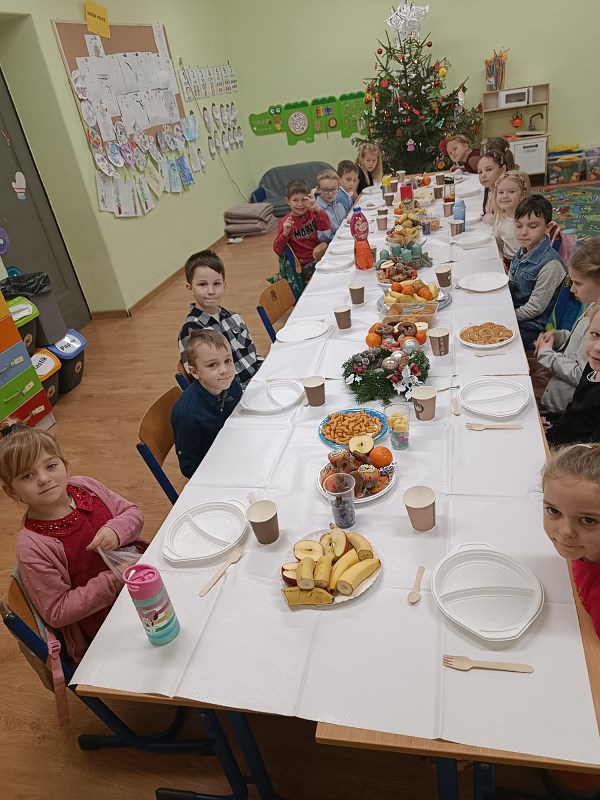 Gdy choinka była już ubrana, pierniczki gotowe, stół nakryty białym obrusem, pod którym było sianko, przyszedł czas na 12 potraw. Dzieci skosztowały czerwonego barszczu, pierogów, ciast, deserków, owoców....